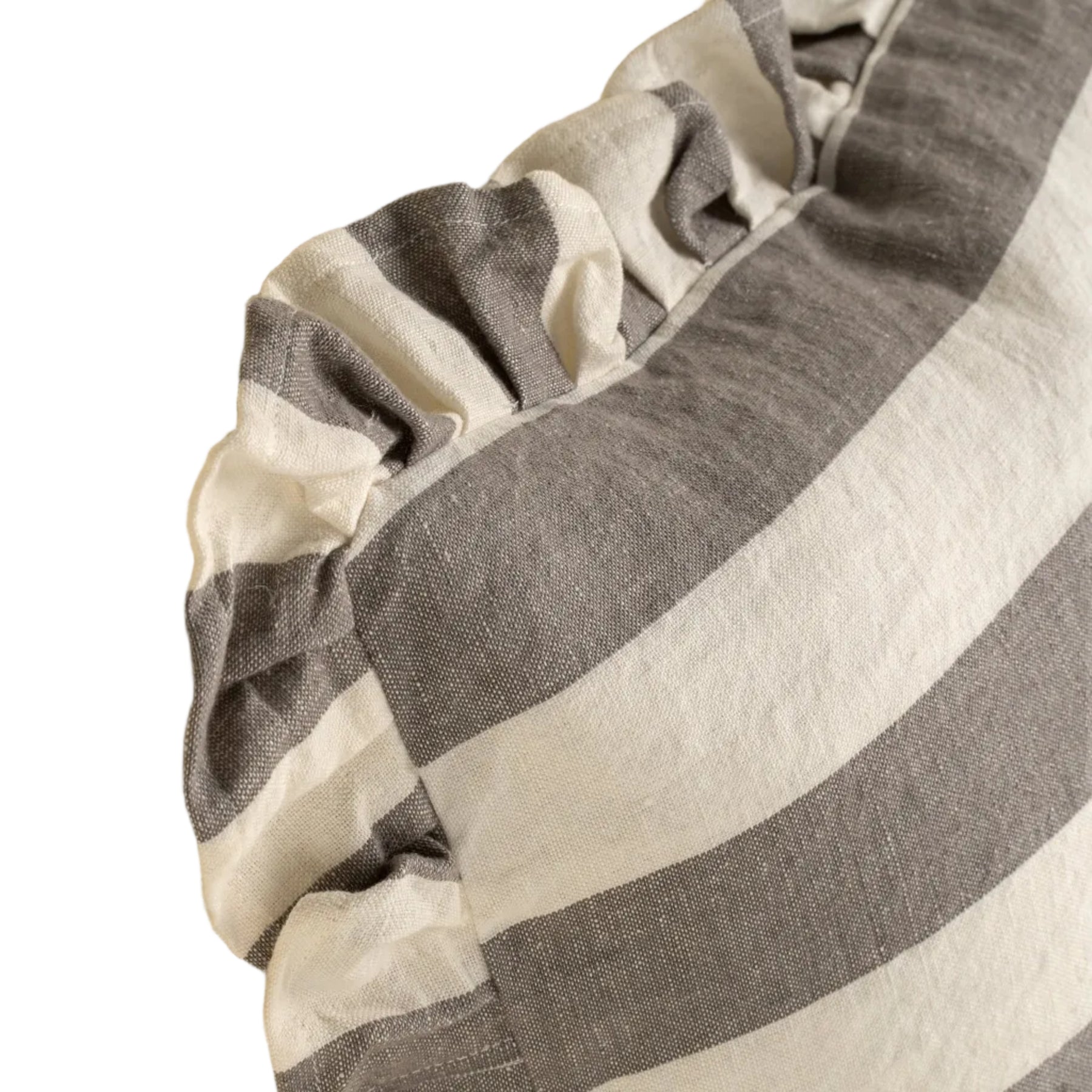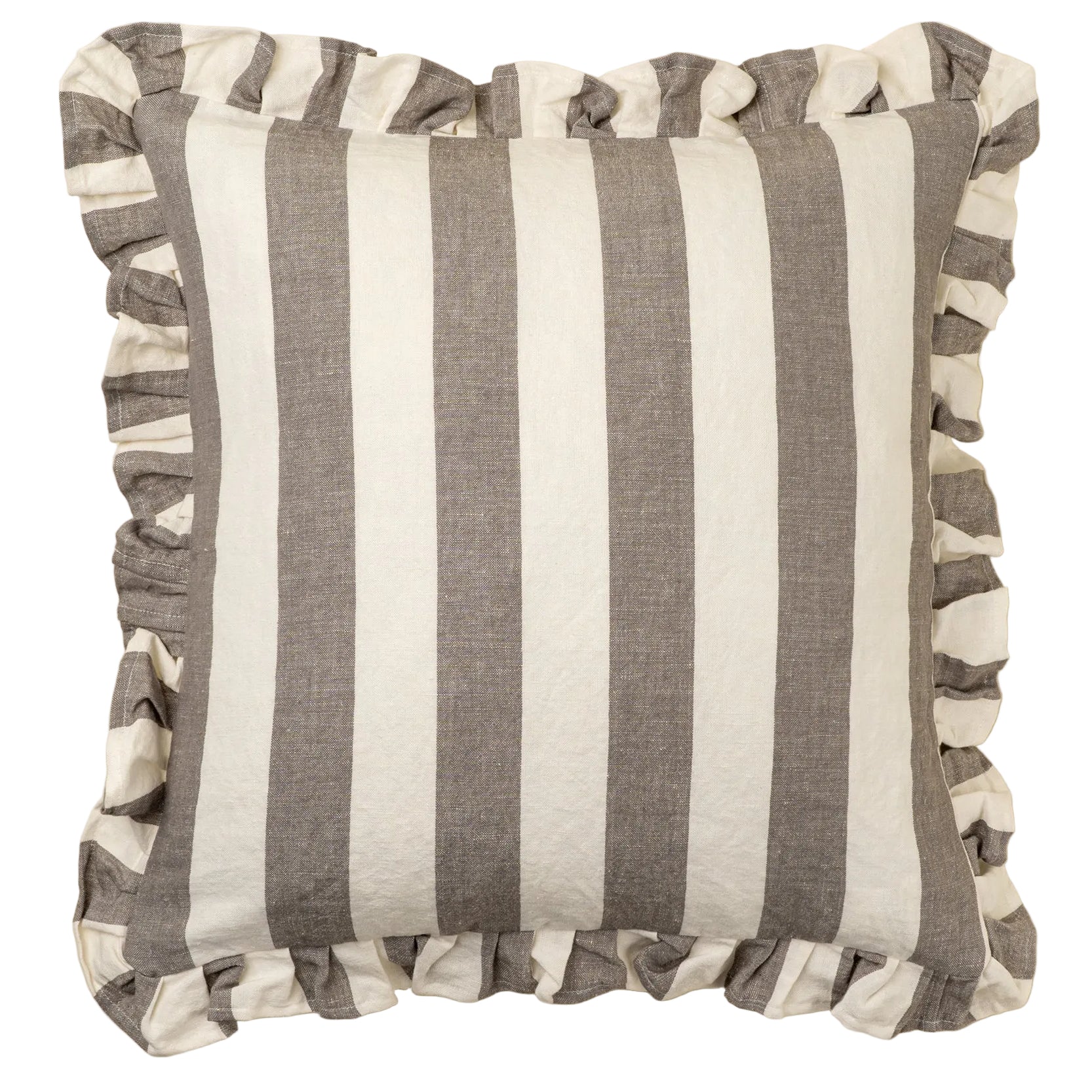 Add a playful yet polished accent to your home with the Ruffle Thick Stripe Pillow. Handmade from a 50% linen, 50% cotton blend, this pillow pairs classic stripes with a soft ruffle border for a timeless French cottage feel. Wide, neutral stripes bring relaxed elegance, while the ruffled trim adds a cozy touch to your bedroom or living room decor.
