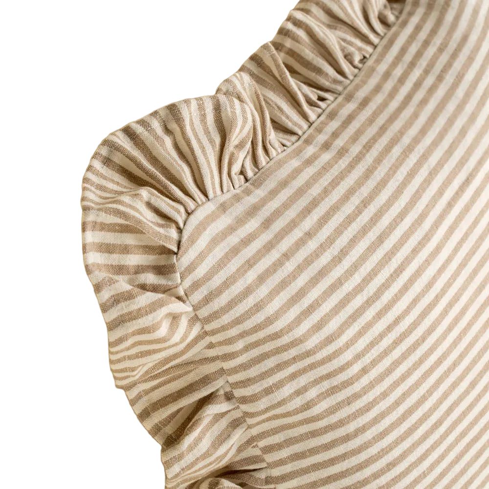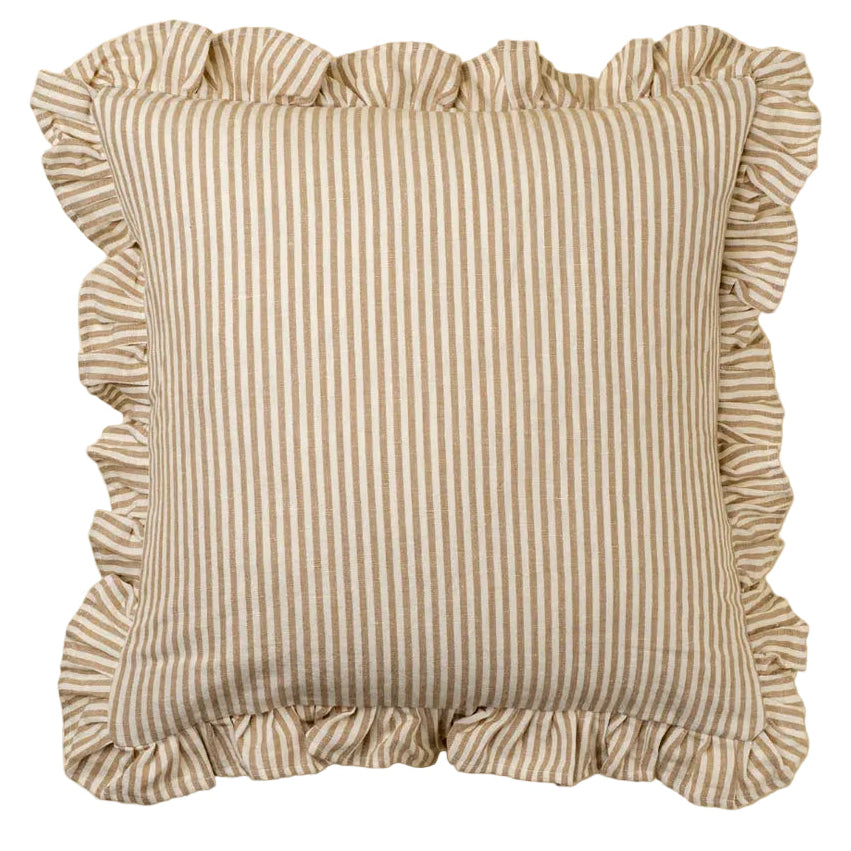 Add light and texture to your home with the Ruffle Thin Stripe Pillow. Handmade from a 50% linen, 50% cotton blend, this throw pillow pairs classic thin stripes with a soft ruffle border for a timeless French cottage feel. Its neutral palette makes it easy to mix and match with other pillow covers or layer onto your bedroom pillowscape for a look that’s both polished and relaxed.