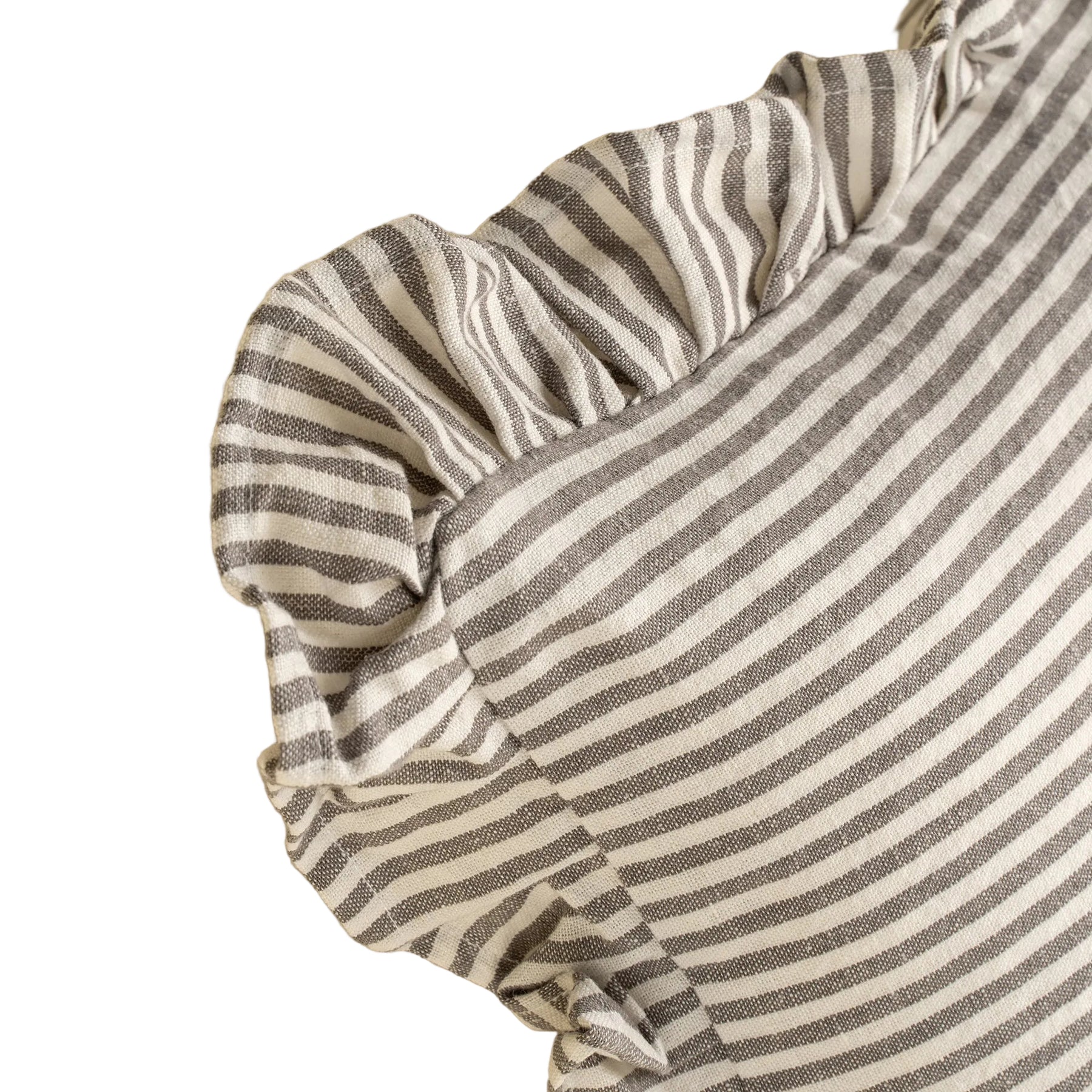 Add light and texture to your home with the Ruffle Thin Stripe Pillow. Handmade from a 50% linen, 50% cotton blend, this throw pillow pairs classic thin stripes with a soft ruffle border for a timeless French cottage feel. Its neutral palette makes it easy to mix and match with other pillow covers or layer onto your bedroom pillowscape for a look that’s both polished and relaxed.