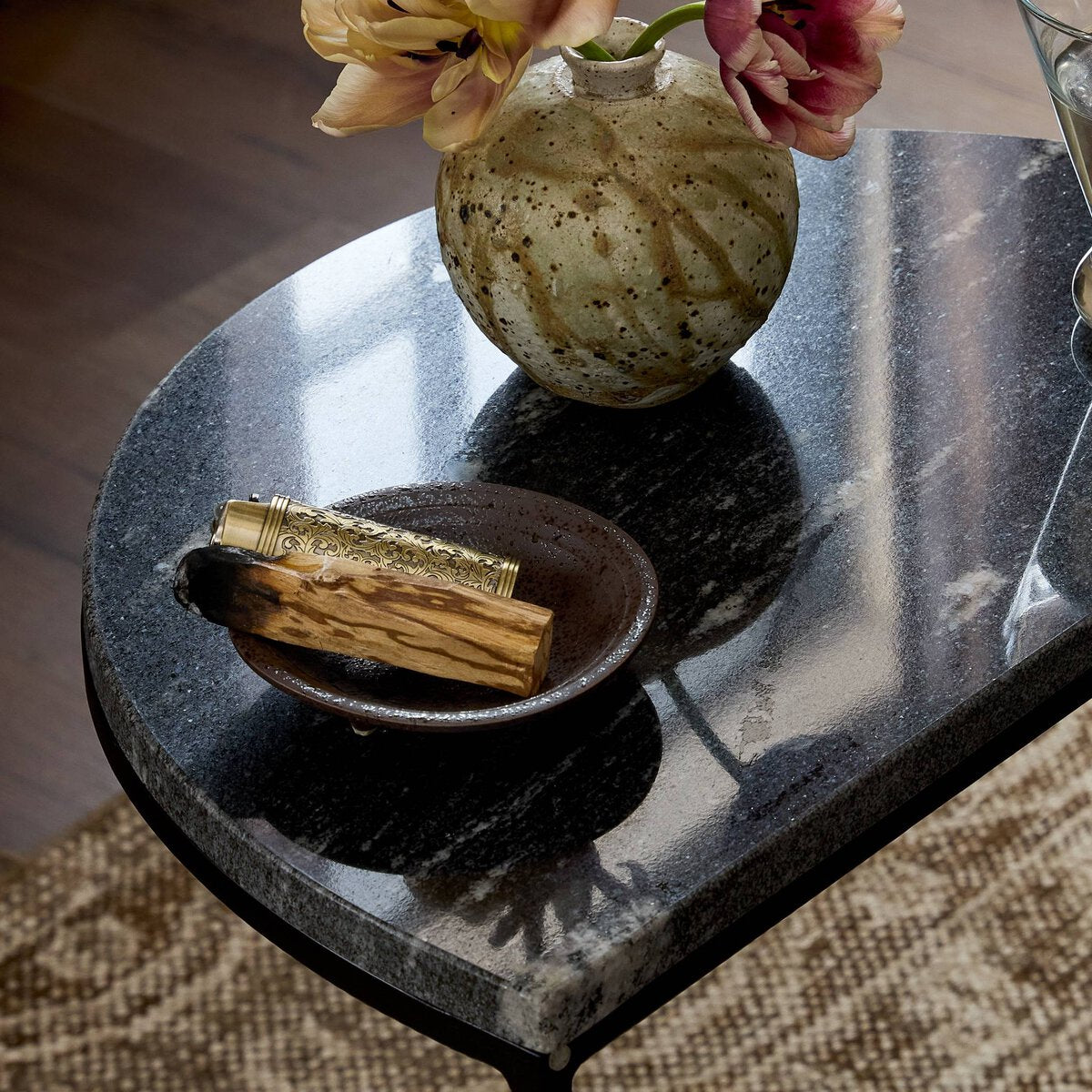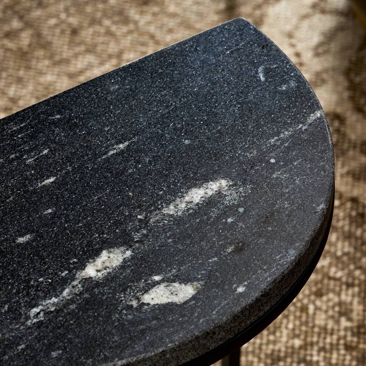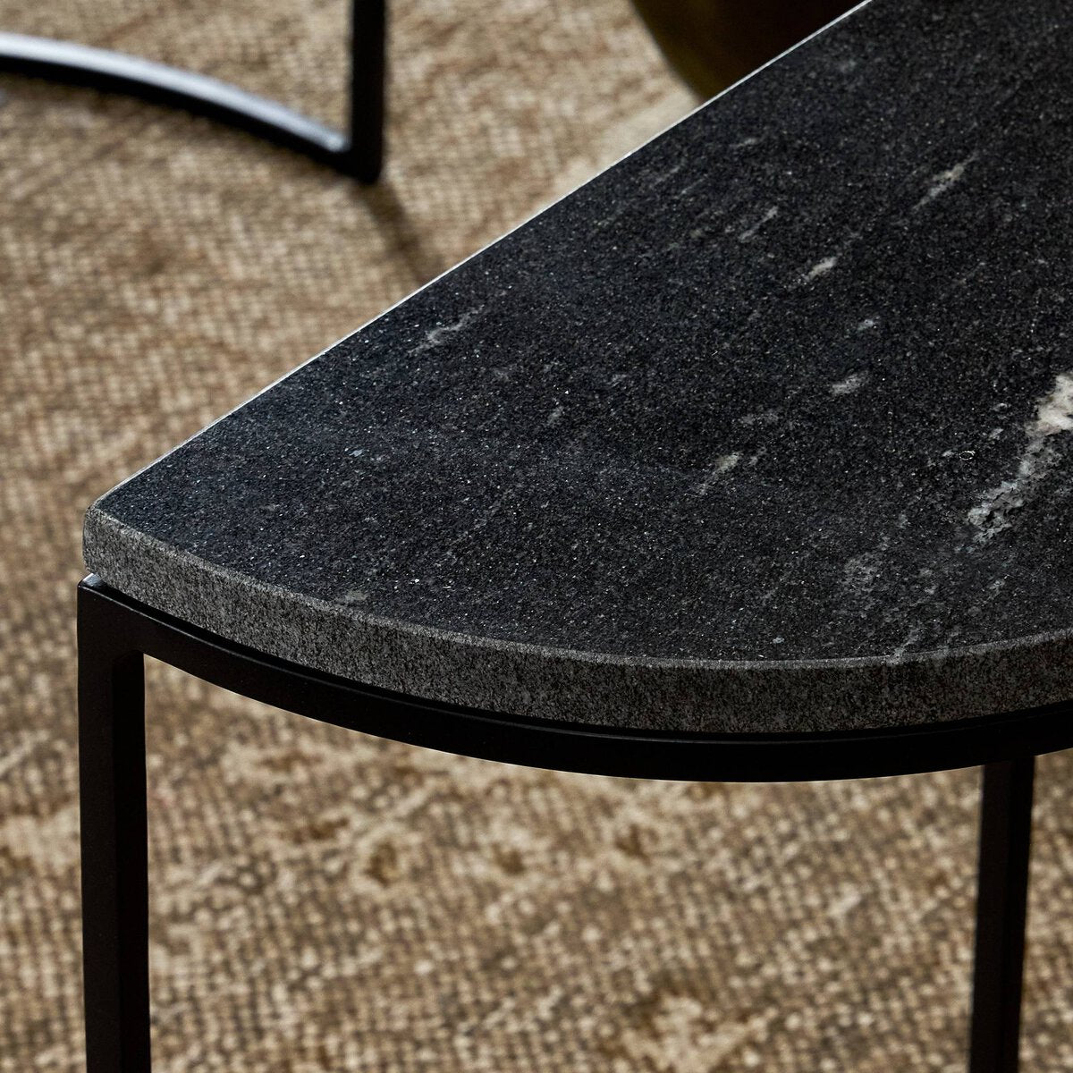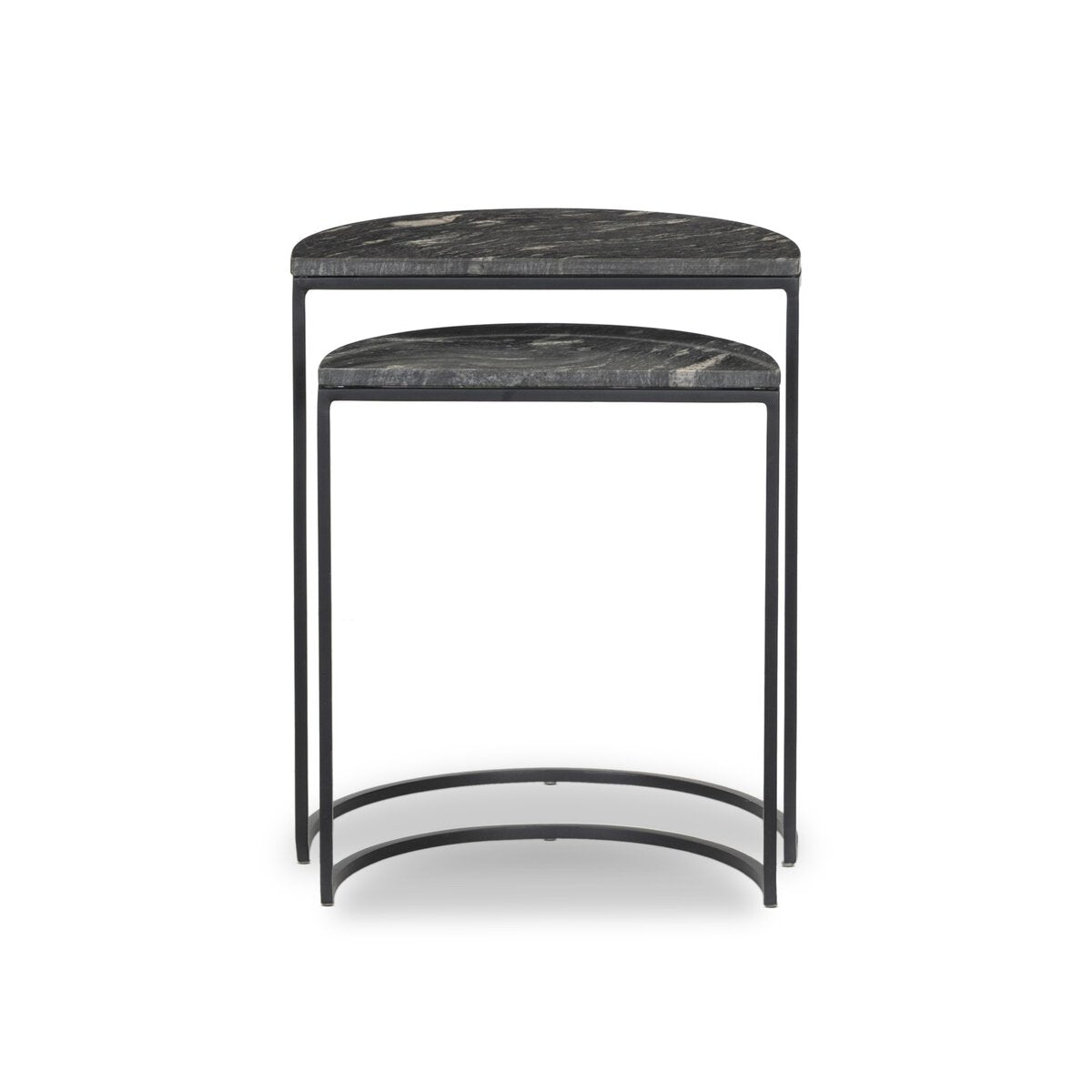 Style with a side of practicality. Slim iron legs support semicircle tabletops of marble. Nesting feature offers a handy extra surface when it's needed, tucking away with ease when it's not.