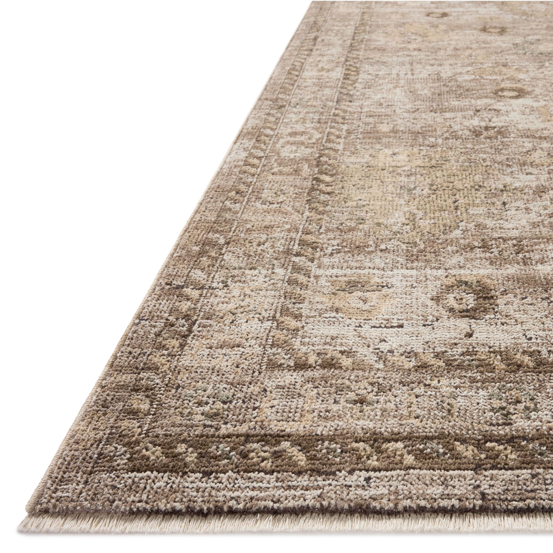 The Priscilla Collection is a classically beautiful area rug with the low, worn-in pile of a treasured vintage textile. The rug neutral stone palette uses contrasting tones with moments of distressing and saturation for visual depth that emphasizes the antique aesthetic. This collection is power-loomed of 100% polyester in Turkey, a durable, easy-to-clean construction that never sheds and is well-suited for busy living rooms, bedrooms, entryways, and more.