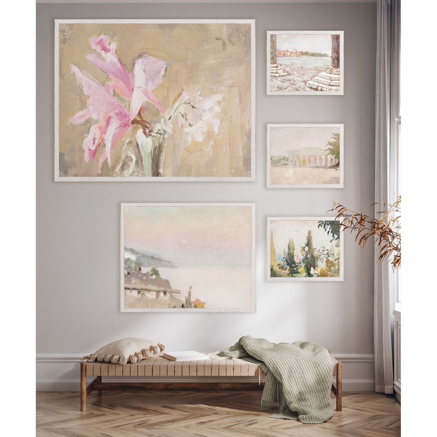 Beautiful landscapes through vibrant acrylics on raw canvas This collection of 22 artworks showcases stunning architecture and scenic coastlines of assorted locales. Loose, impressionist brushstrokes explore the interplay of light, color, and form, while a serene palette of soft greens, creams, beiges, and pastel tones evokes warmth and tranquility.