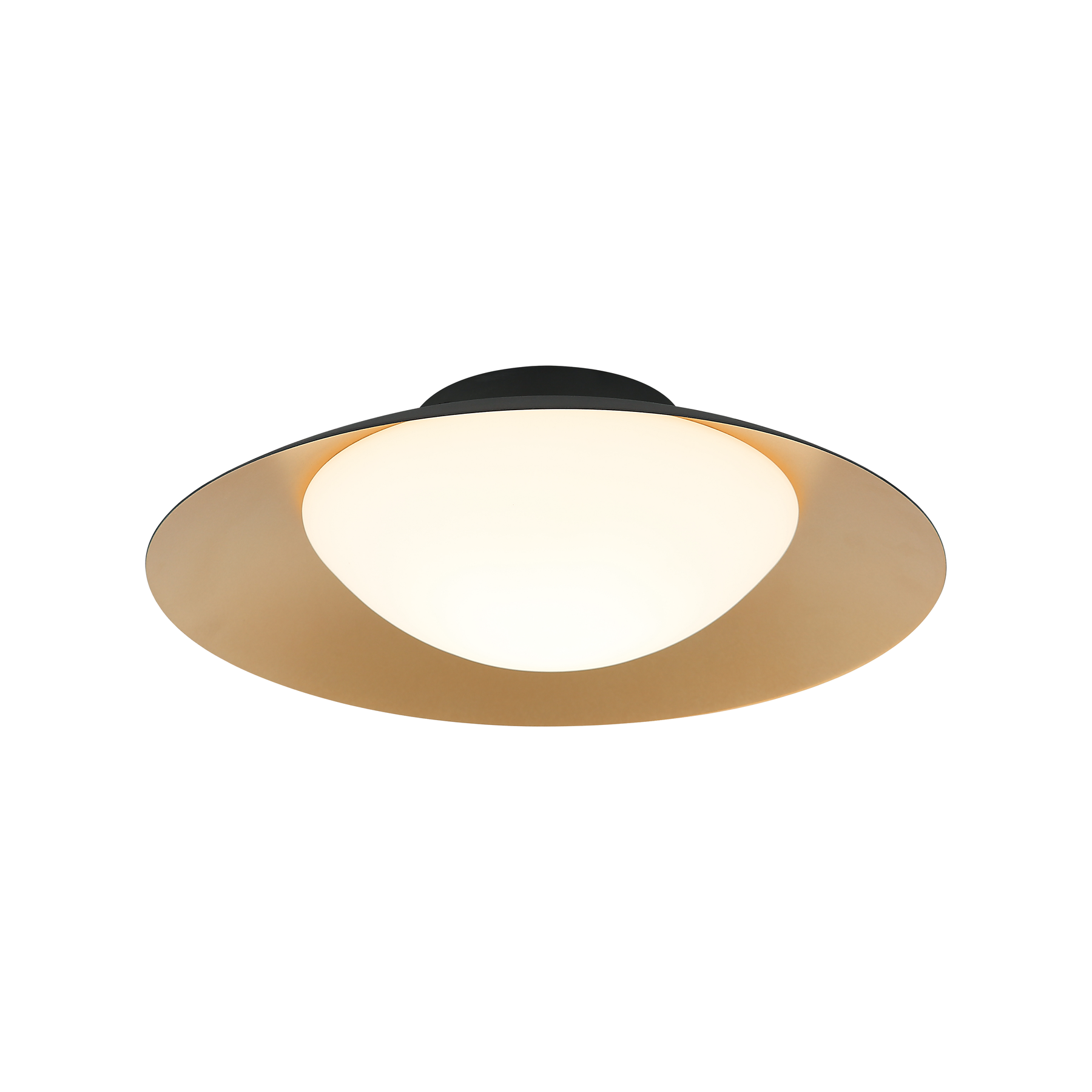 Caravon is an integrated LED available in two size ceiling mount and one wall sconce. The bowl shaped Matte Black frame with Gold interior is finished off with dome-shaped opal glass for a polished look. The off-centre glass placement in the wall sconce offers an interesting twist on a classic style.