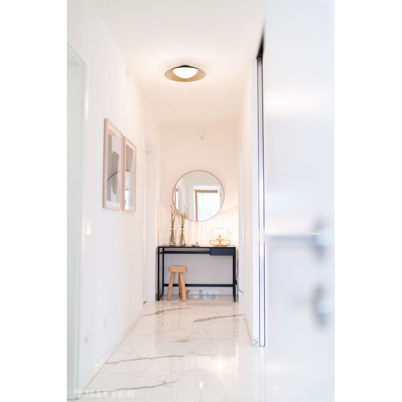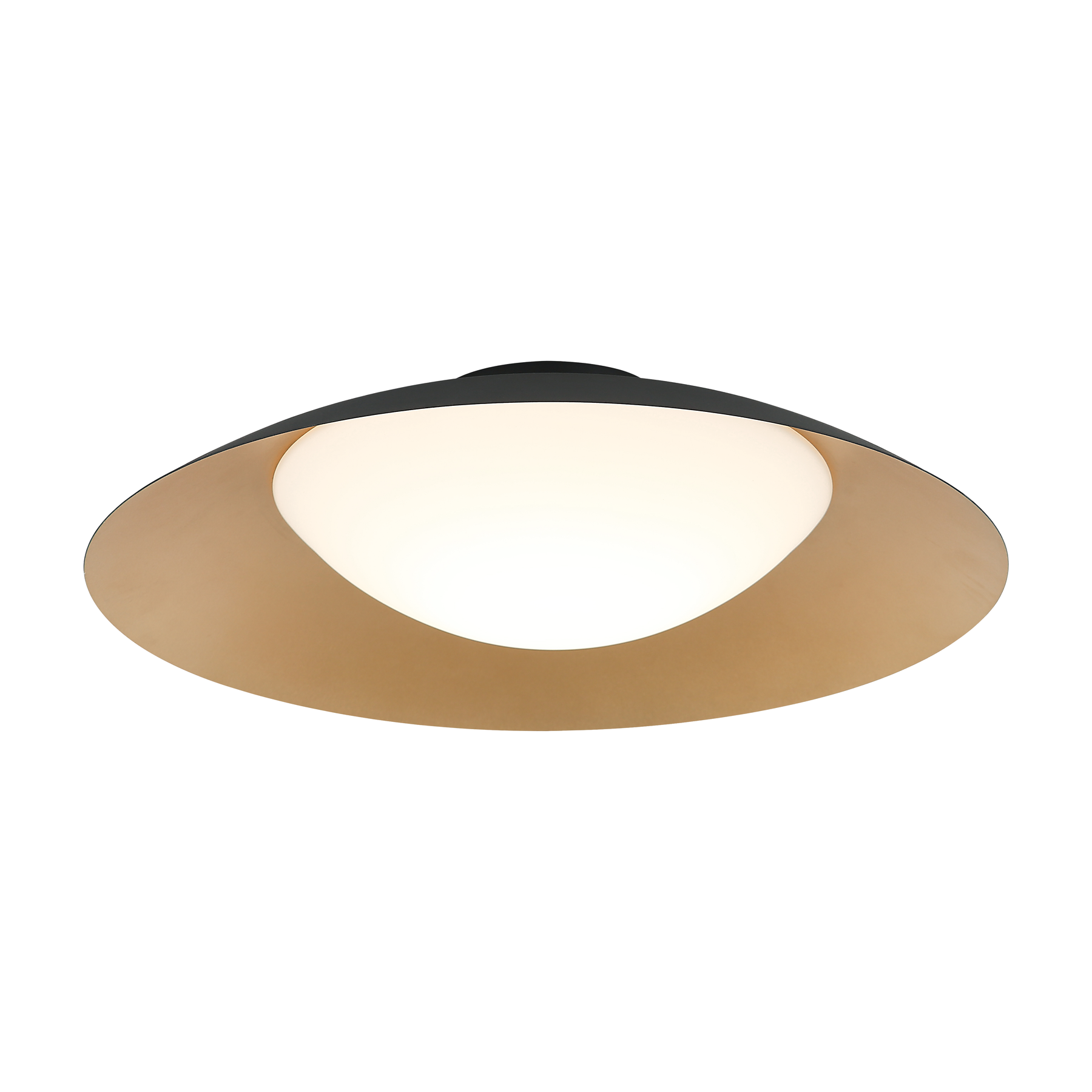 Caravon is an integrated LED available in two size ceiling mount and one wall sconce. The bowl shaped Matte Black frame with Gold interior is finished off with dome-shaped opal glass for a polished look. The off-centre glass placement in the wall sconce offers an interesting twist on a classic style.