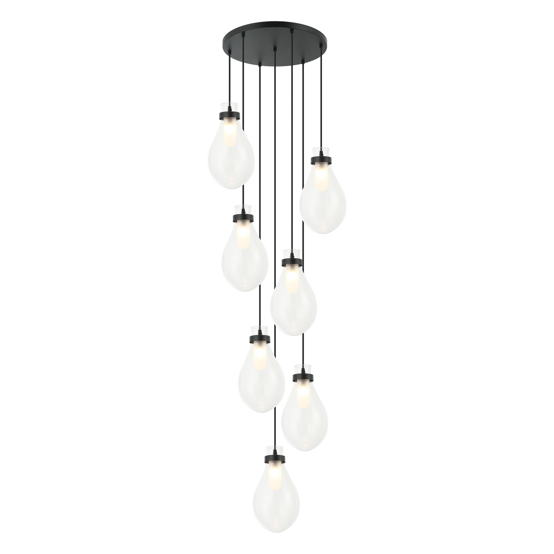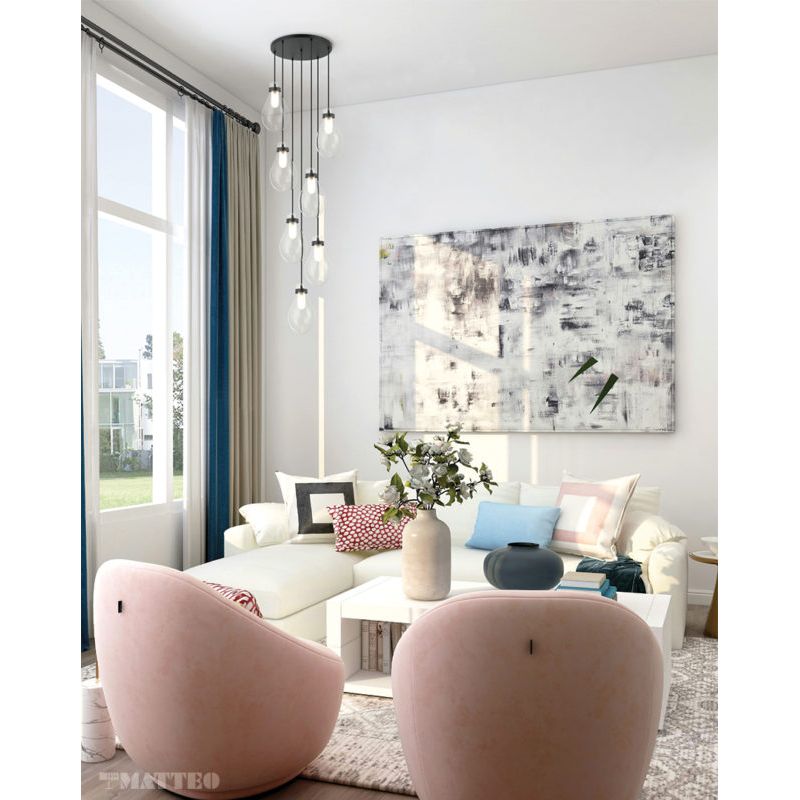 The Seranna family is available in Aged Gold Brass or Matte black with teardrop shaped clear glass. The graceful drop style wall sconce, single pendant and cluster pendants in three, five and seven light options are all beautifully elegant and will present a stylized look in any room.