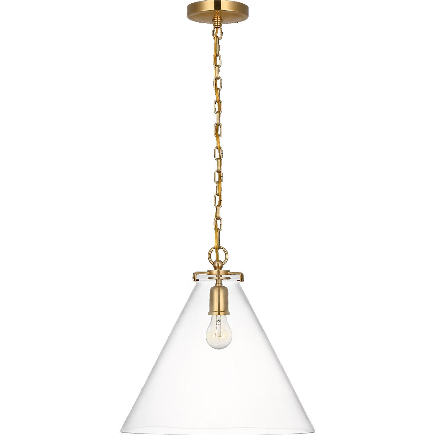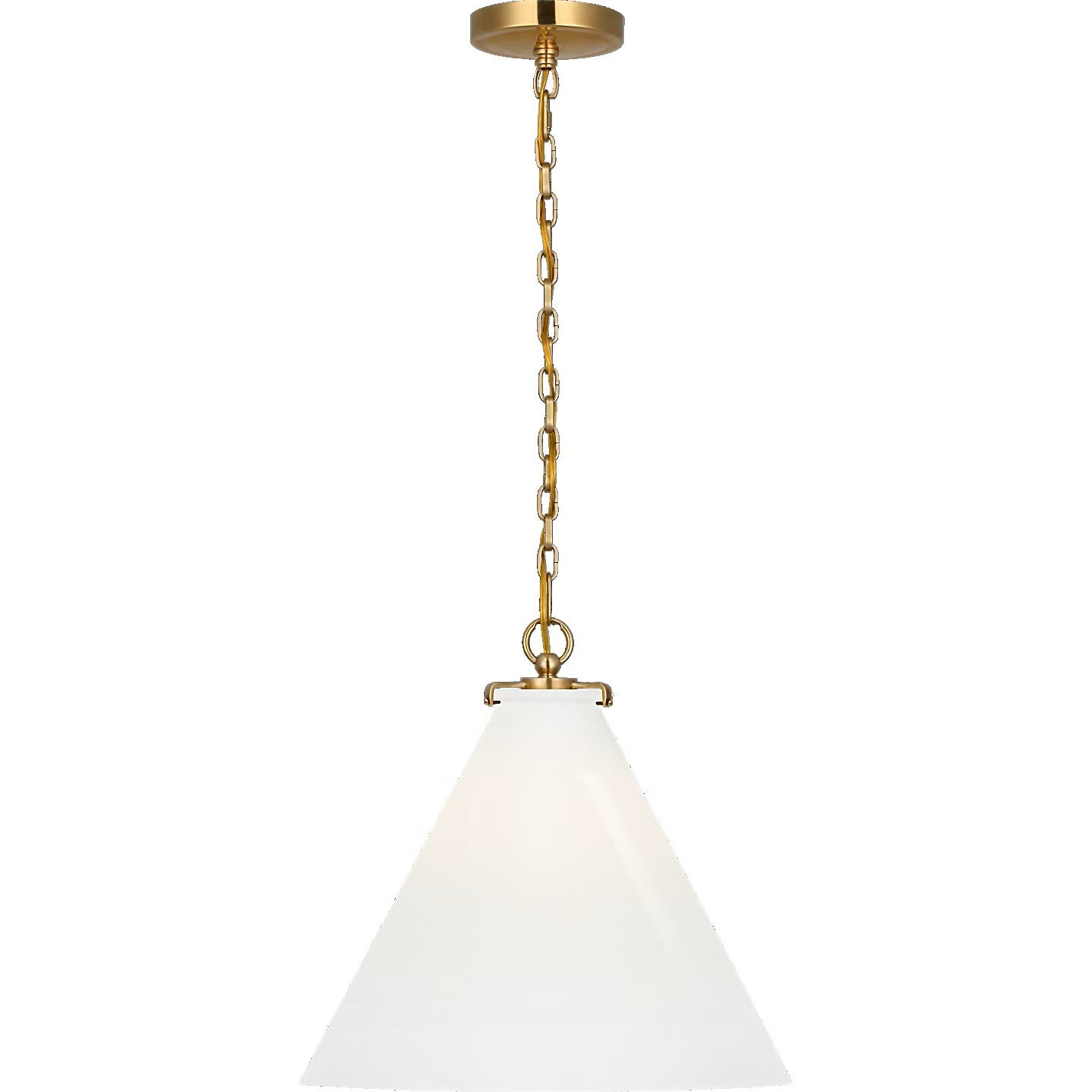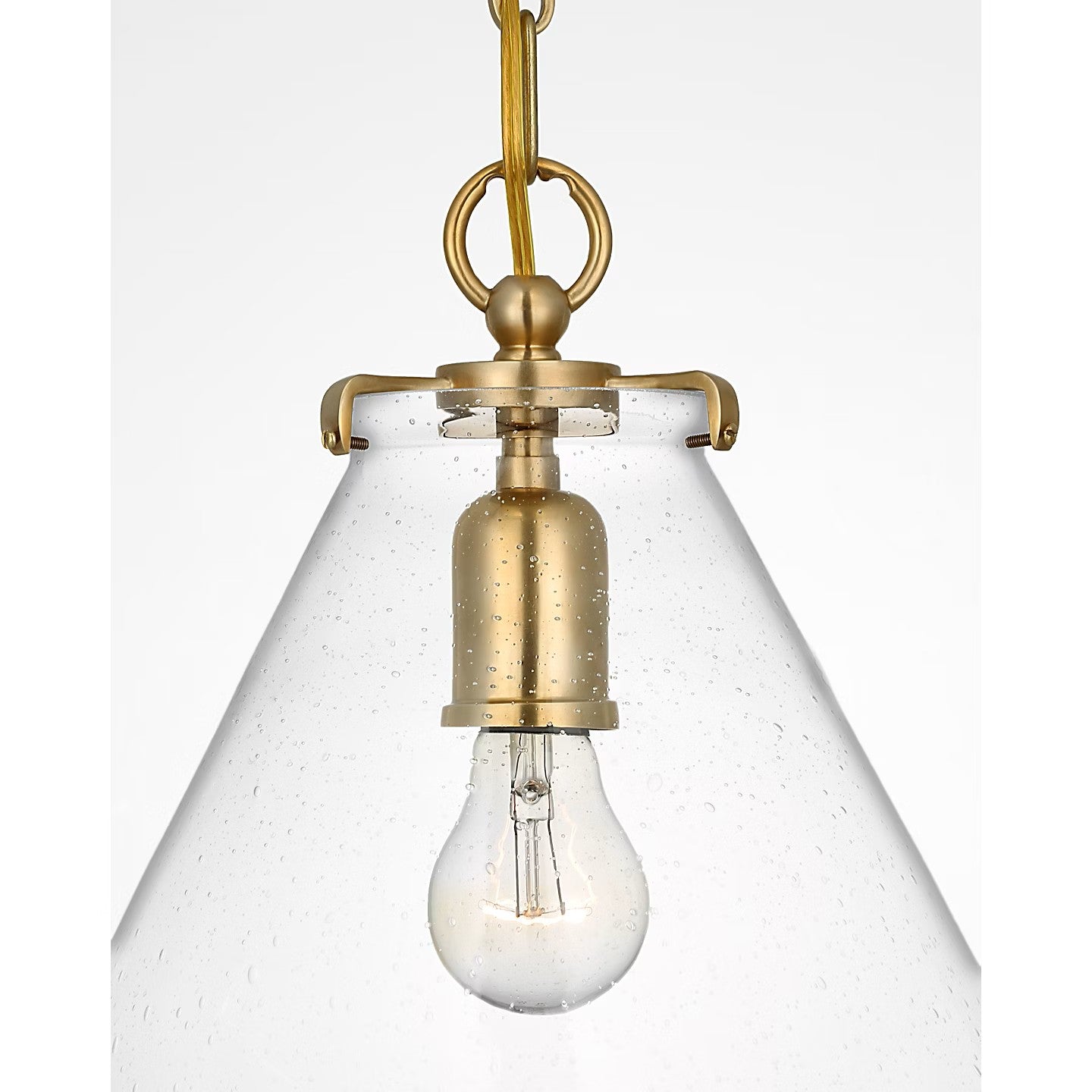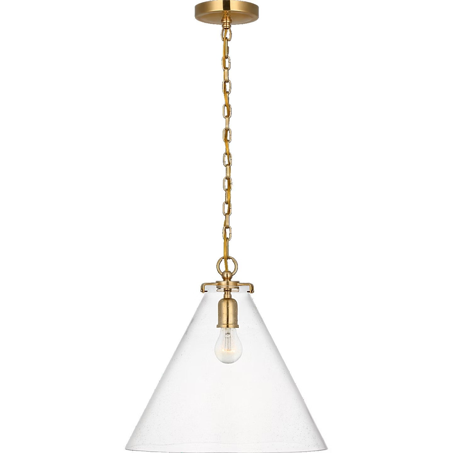This Pendant features a classic conical shape with a contemporary look. Finished in a clear, seeded or white glass shade and antique brass or bronze, it is a perfect compliment to a dining or  kitchen area.