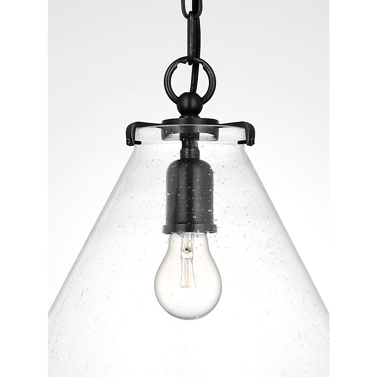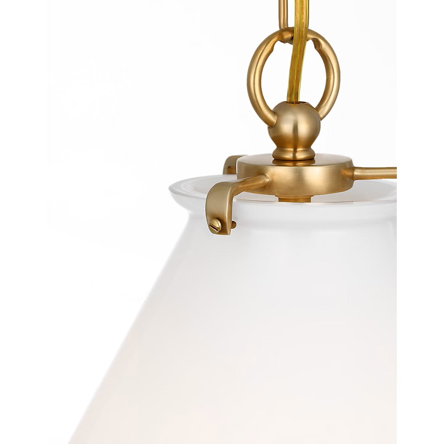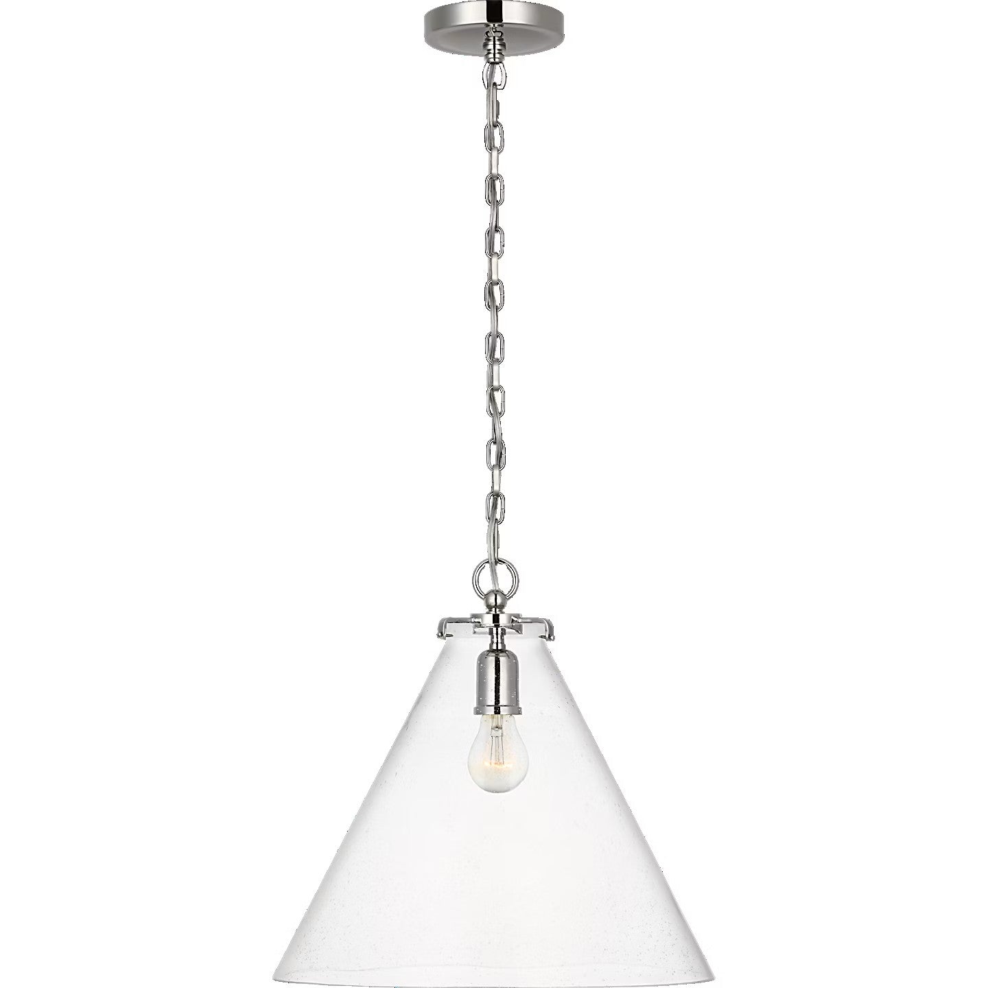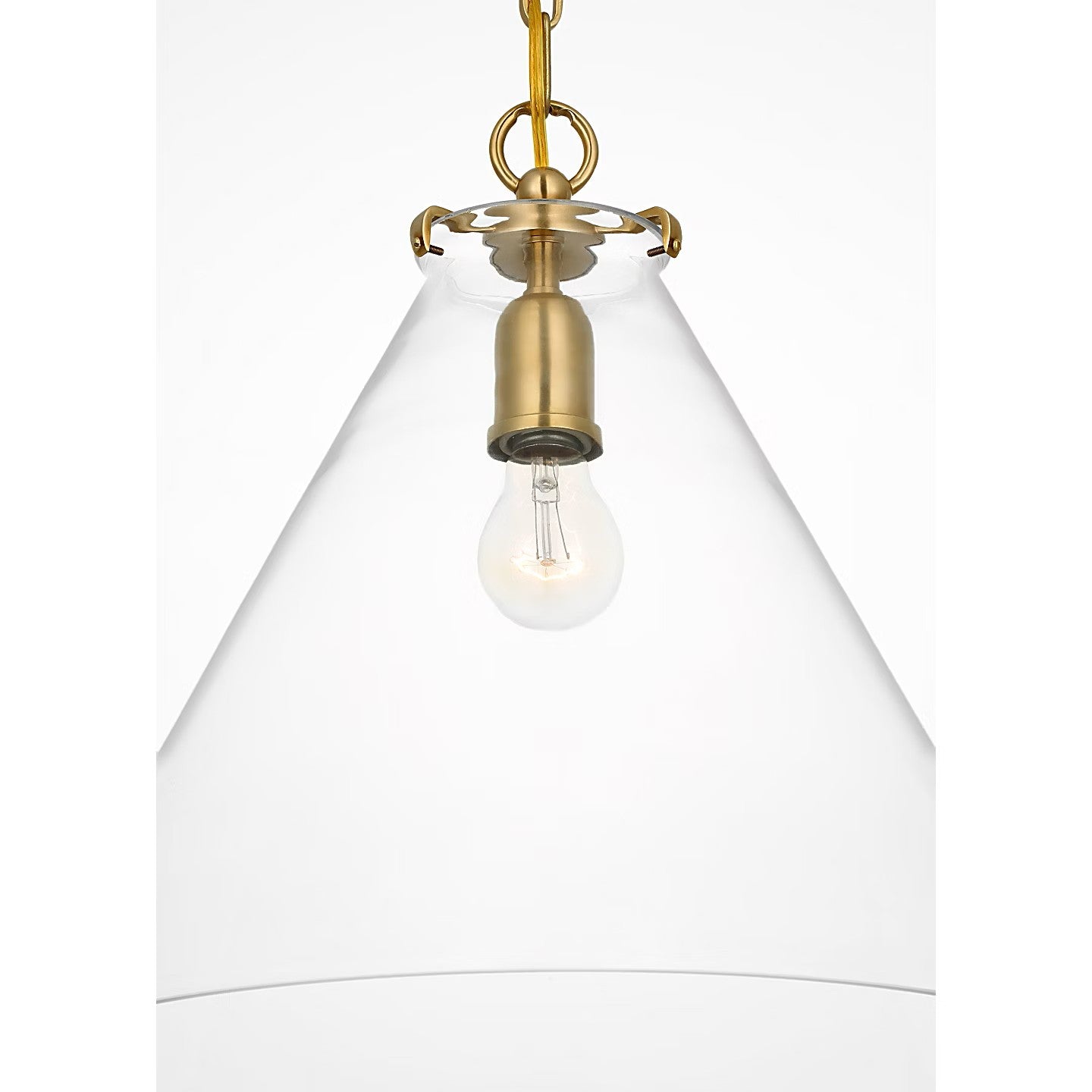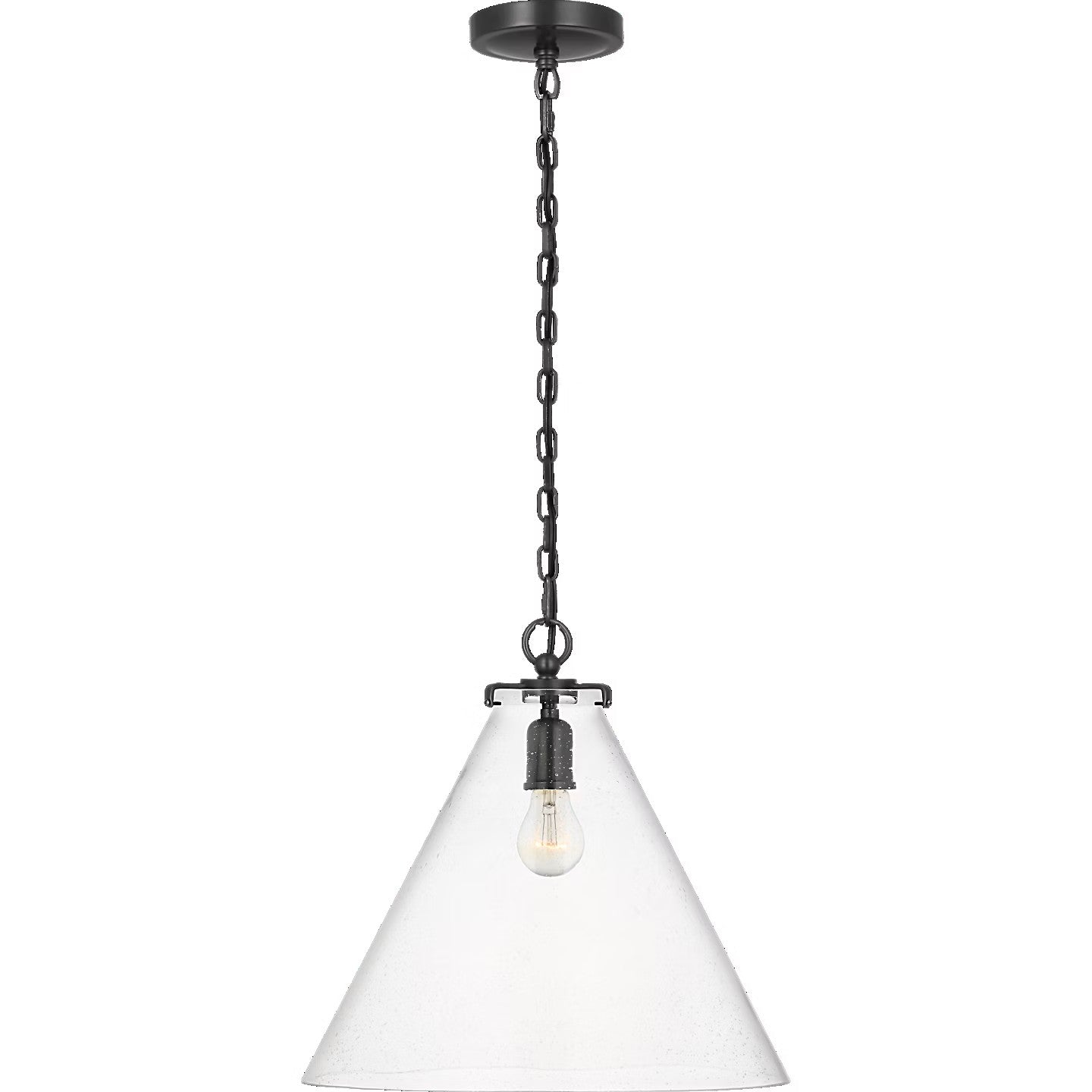 This Pendant features a classic conical shape with a contemporary look. Finished in a clear, seeded or white glass shade and antique brass or bronze, it is a perfect compliment to a dining or  kitchen area.