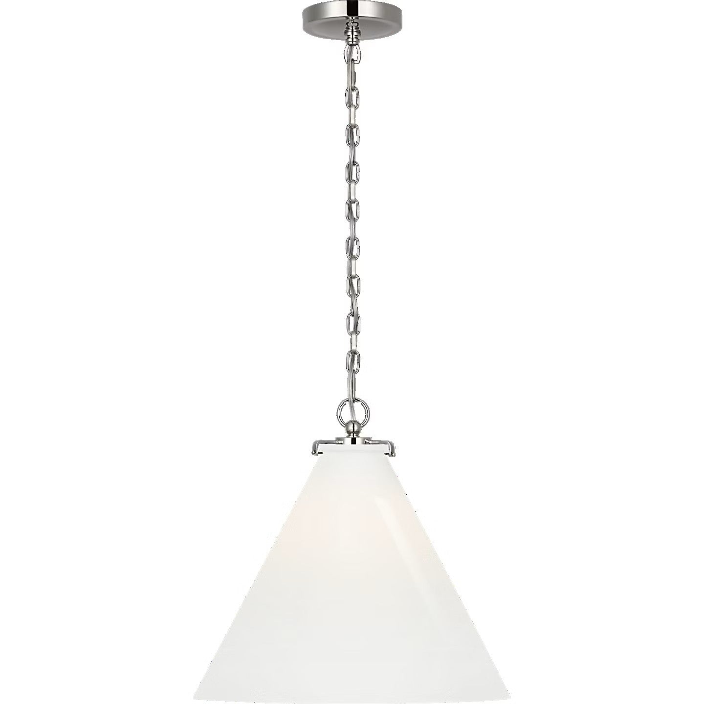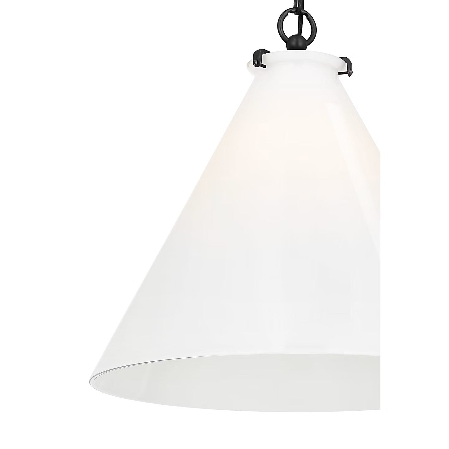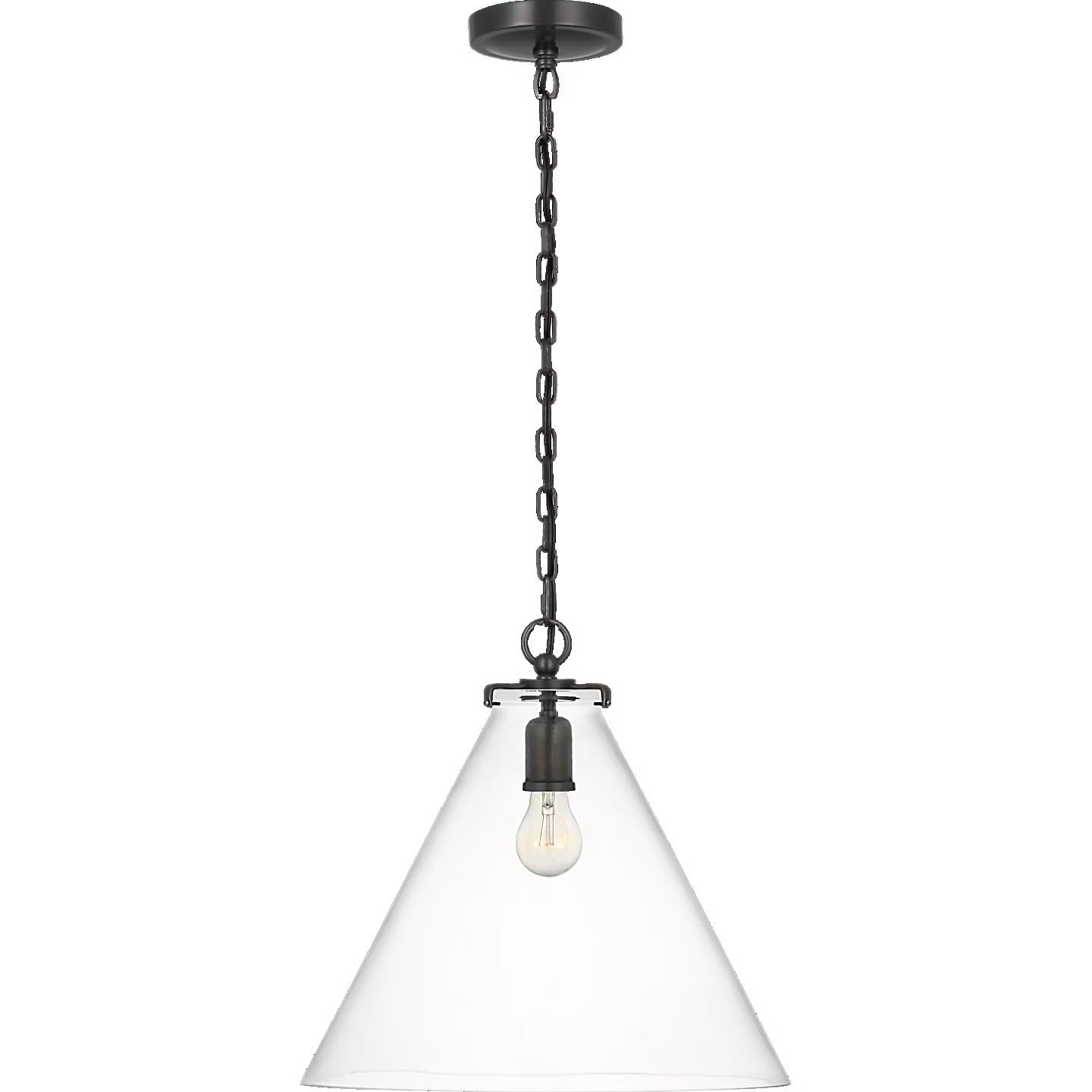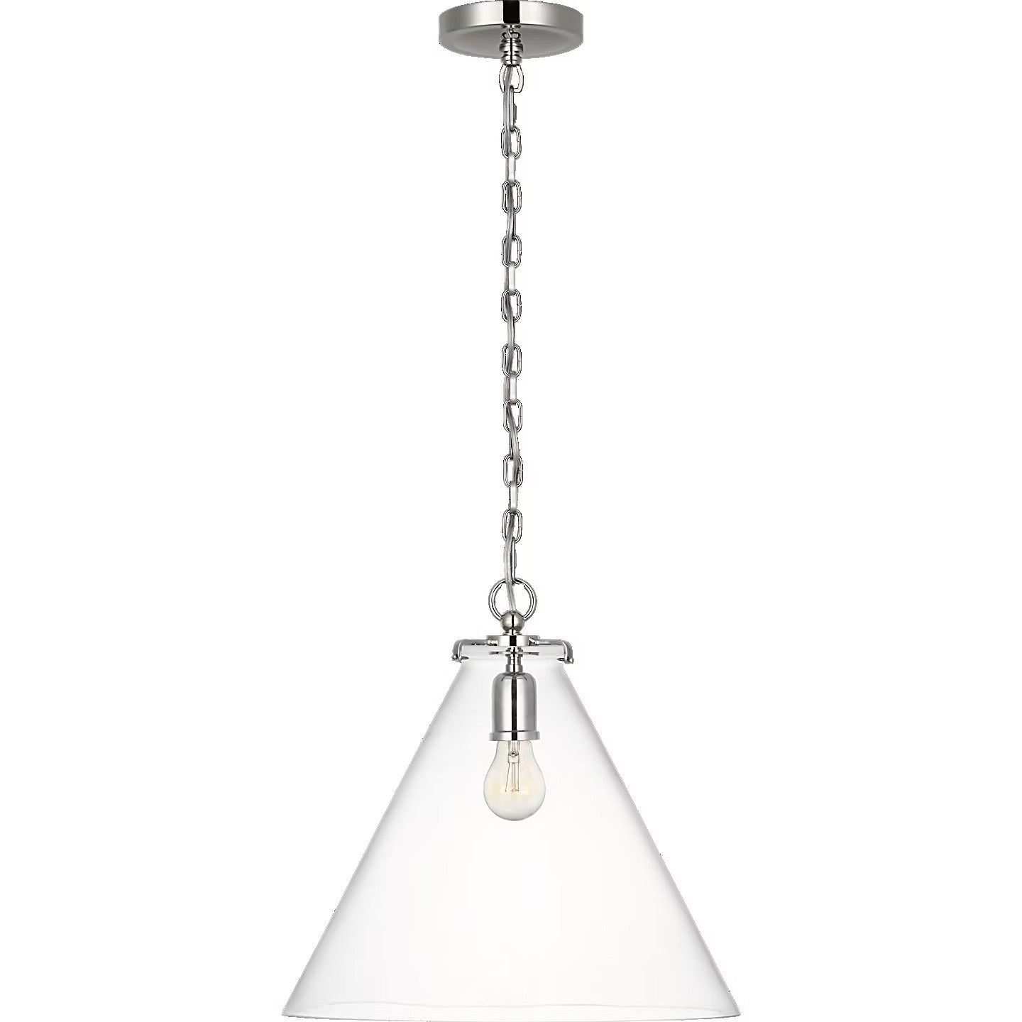 This Pendant features a classic conical shape with a contemporary look. Finished in a clear, seeded or white glass shade and antique brass or bronze, it is a perfect compliment to a dining or  kitchen area.
