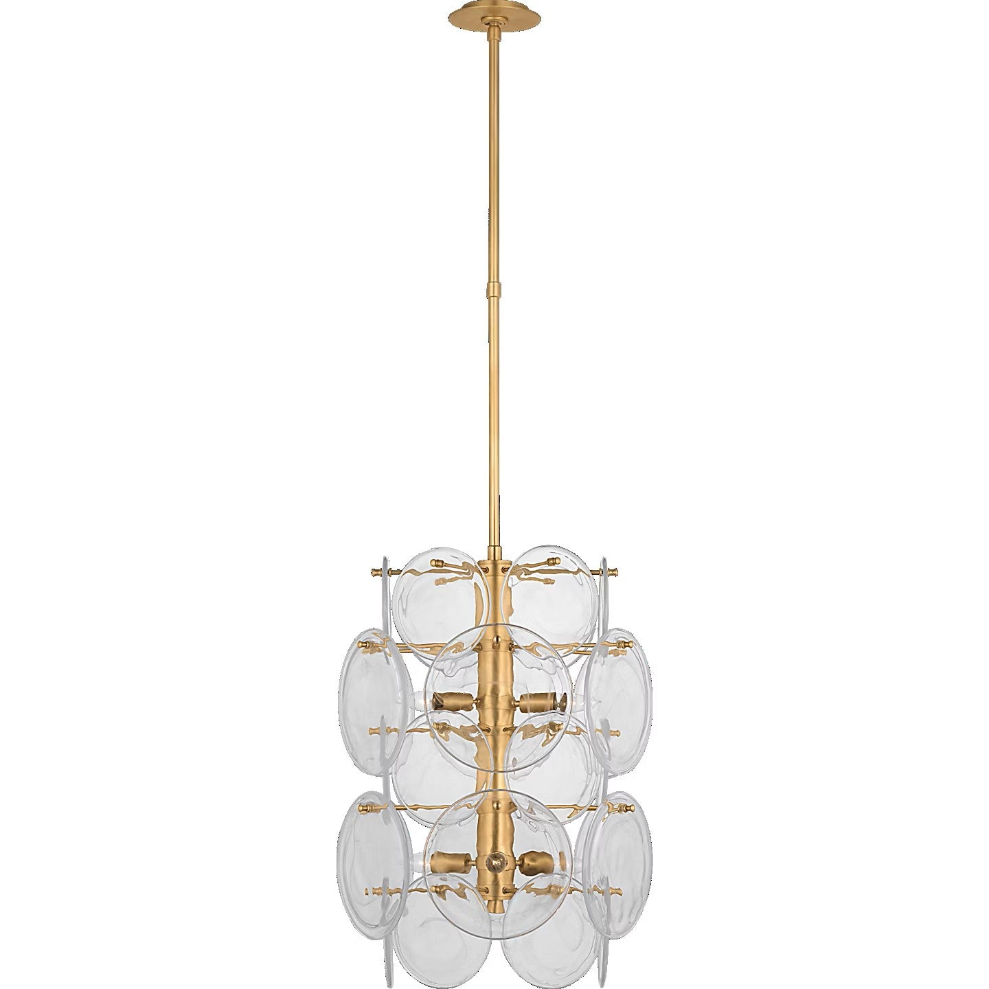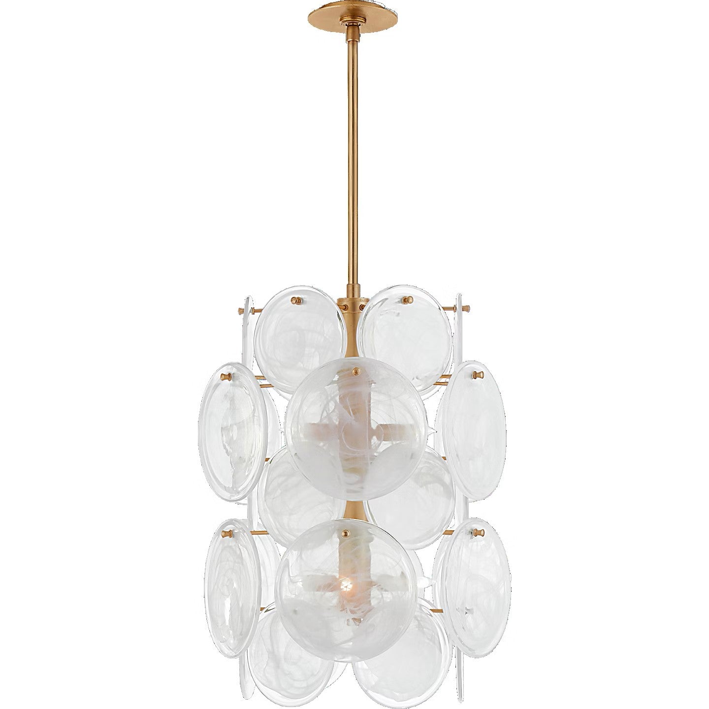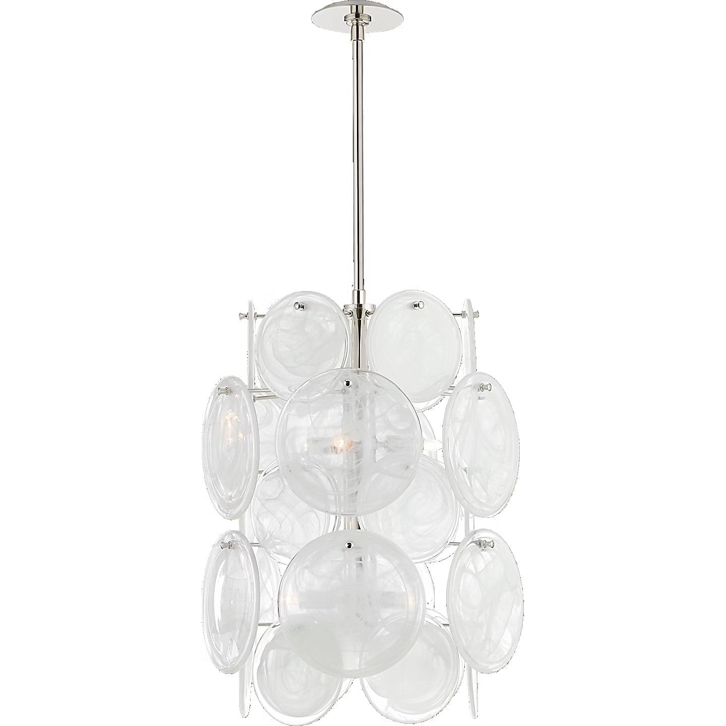 The Loire by AERIN evokes mid-century Italian elegance while adding modern updates in design and finishes. The fluid and dynamic silhouettes cascade and inspire through the distinctive glow of light softly filtered through hand-blown white strié glass discs. Larger pieces can allow a sizeable dining room to be enhanced, or a smaller statement fixture can lend an ethereal quality to more intimate spaces.