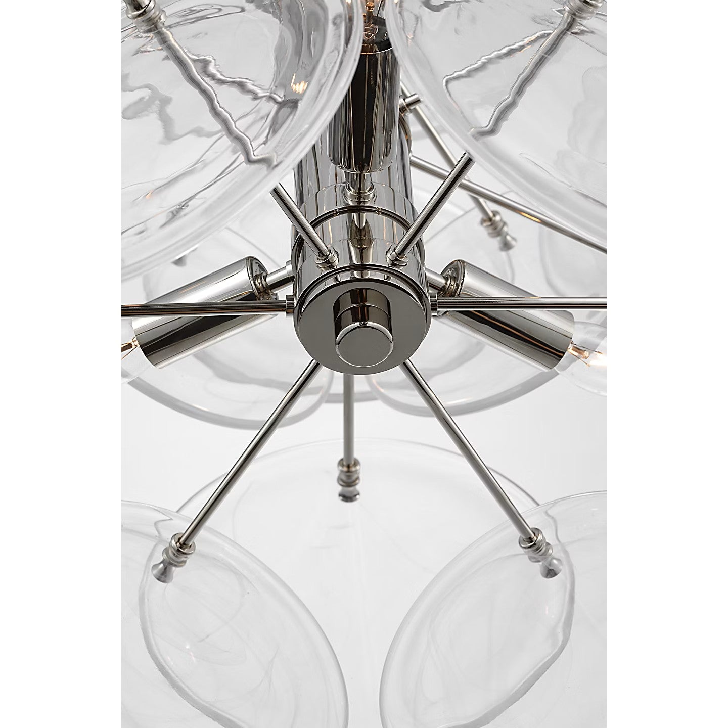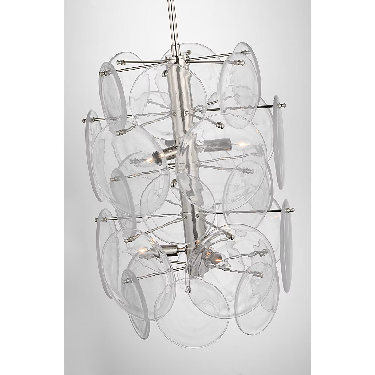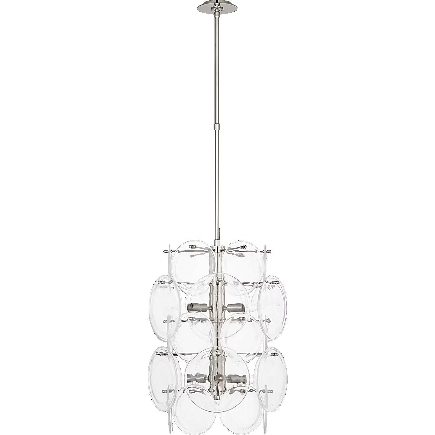 The Loire by AERIN evokes mid-century Italian elegance while adding modern updates in design and finishes. The fluid and dynamic silhouettes cascade and inspire through the distinctive glow of light softly filtered through hand-blown white strié glass discs. Larger pieces can allow a sizeable dining room to be enhanced, or a smaller statement fixture can lend an ethereal quality to more intimate spaces.