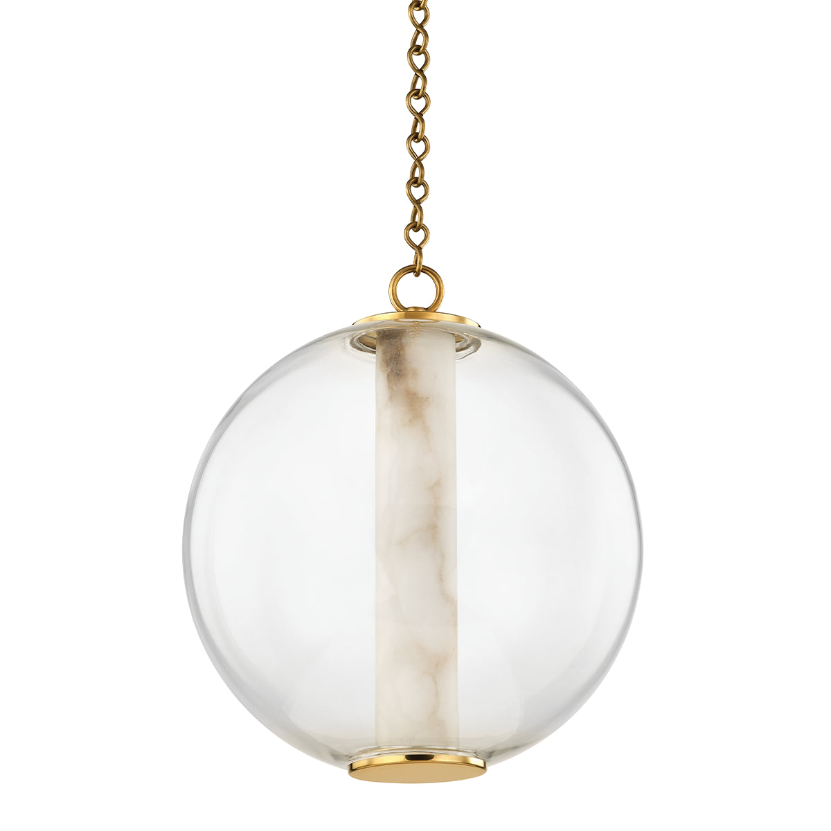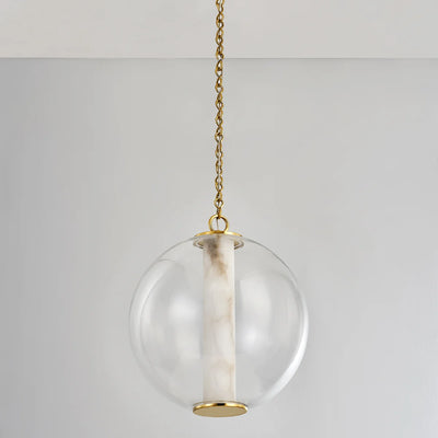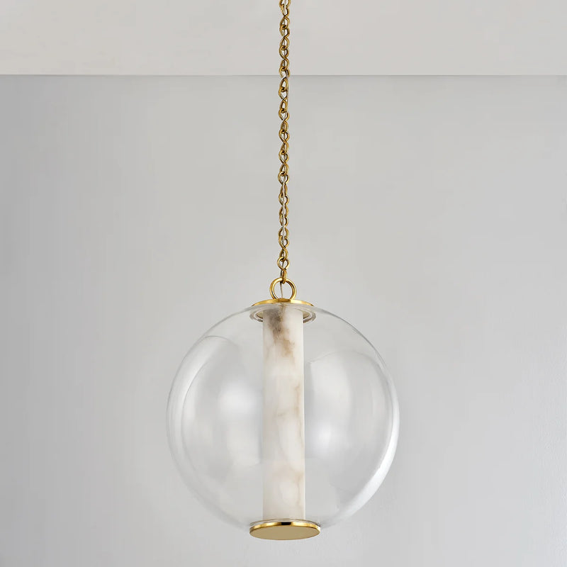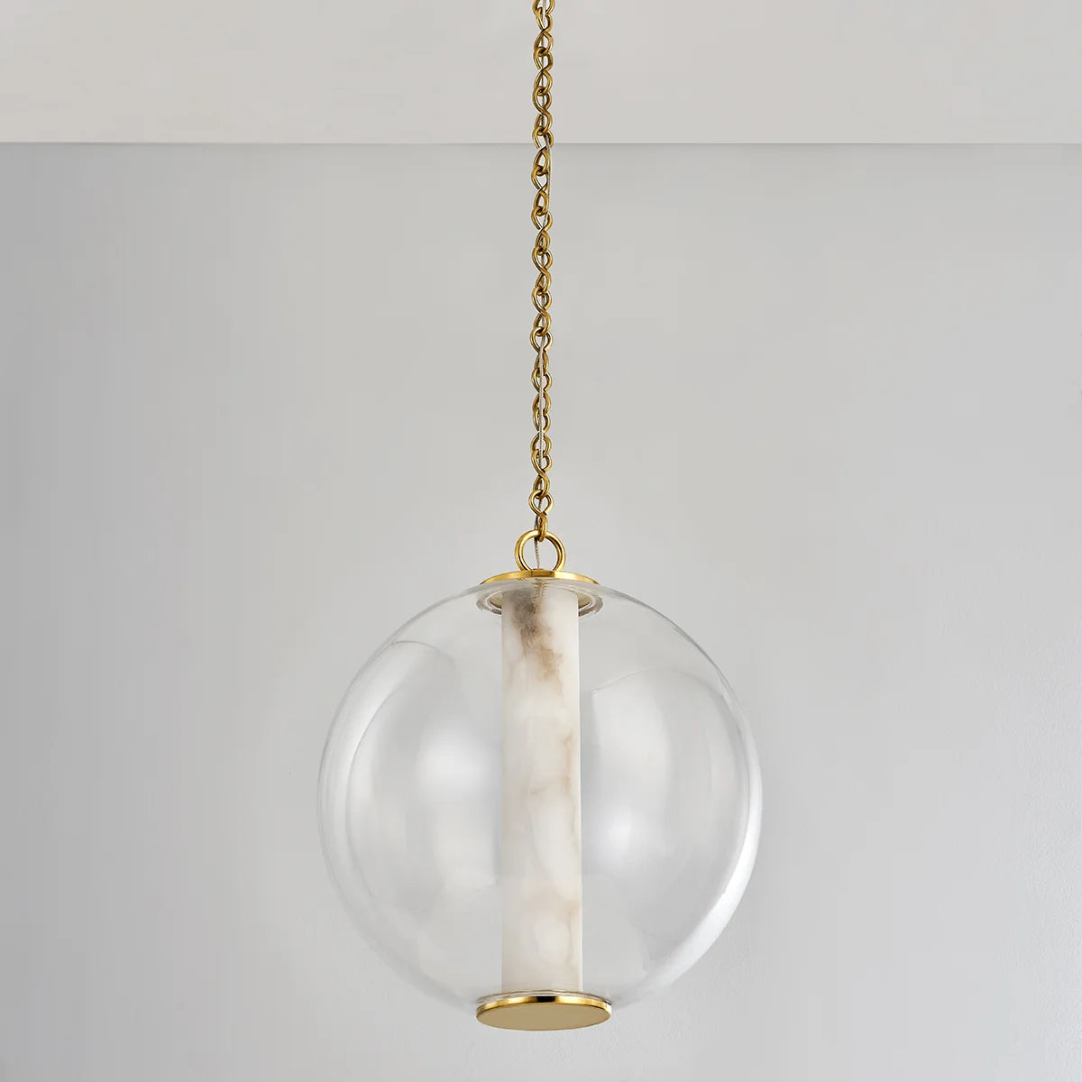An alabaster tube is captured inside a clear glass globe creating interest when unlit and a stunning display when lit. With its simple silhouette, unique elements and mix of luxurious materials, Pietra can stand on its own or hang in multiples. Available as a pendant in 3 sizes or as a refreshingly different flush mount.