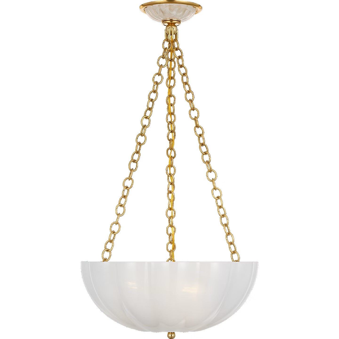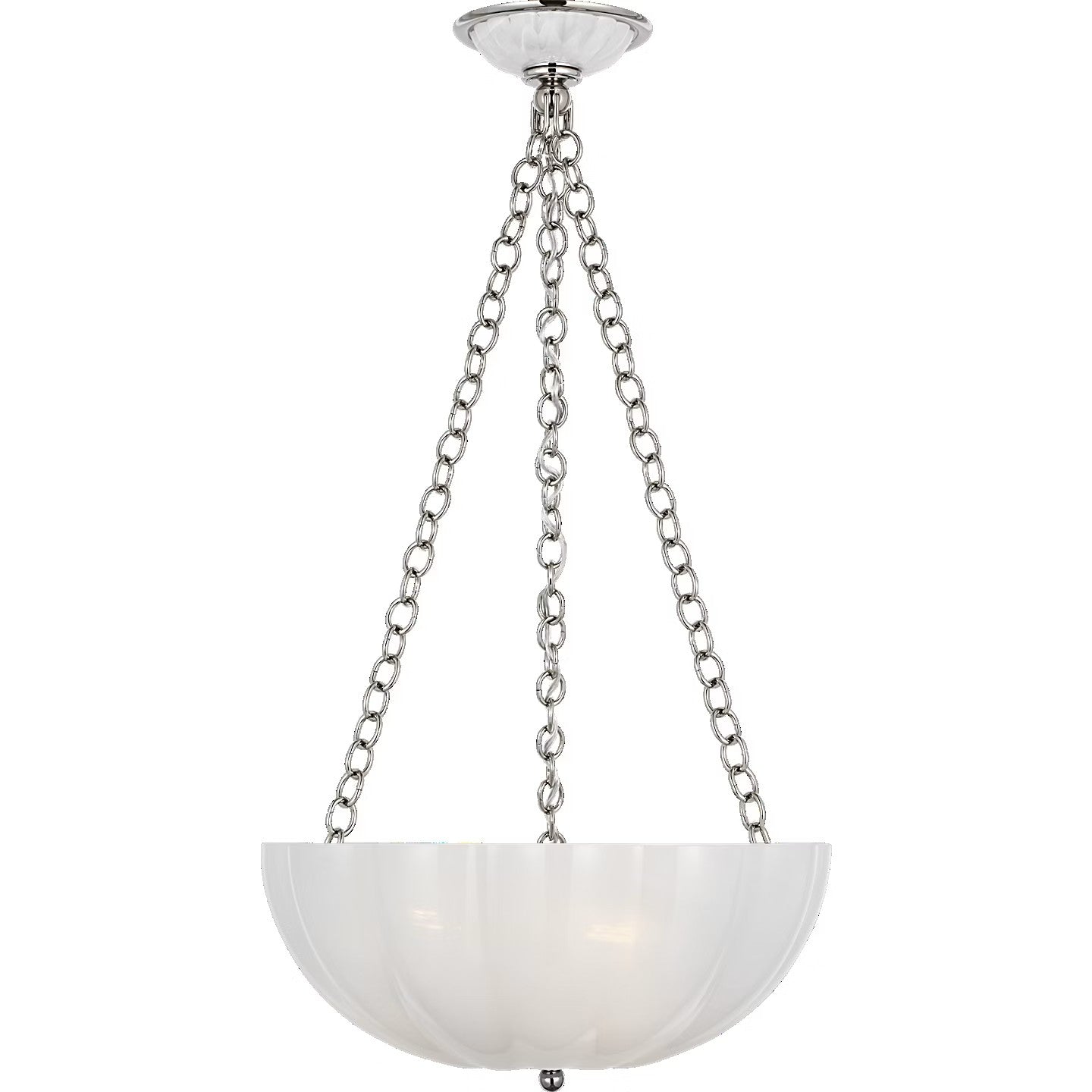 The Rosehill 16" Bowl Chandelier features a scalloped white strié glass bowl, providing soft, diffused light, paired with understated metalwork and finished in polished nickel or antique brass, blending Art Deco hints with modern elegance for a warm, inviting glow in any room.
