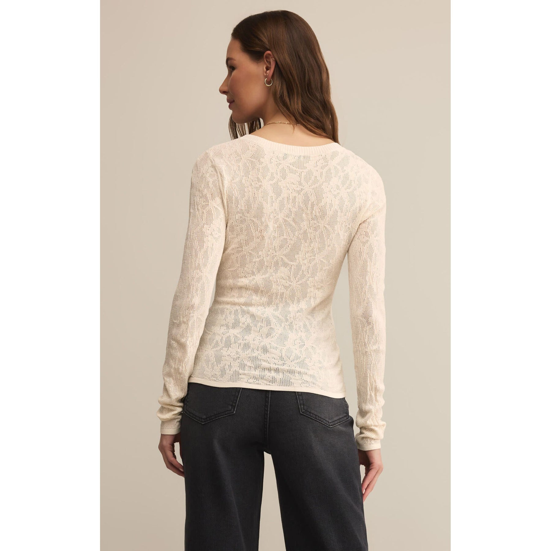 Standout in this fitted crew neck sweater showcasing a delicate floral mesh pattern, which adds depth and interest to any ensemble. Crafted from lightweight sweater yarns with full-length sleeves, this sem-sheer top seamlessly combines sophistication and comfort for a modern look.