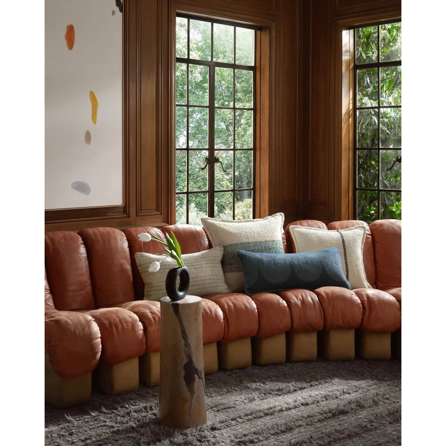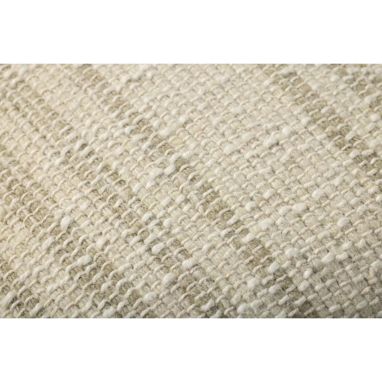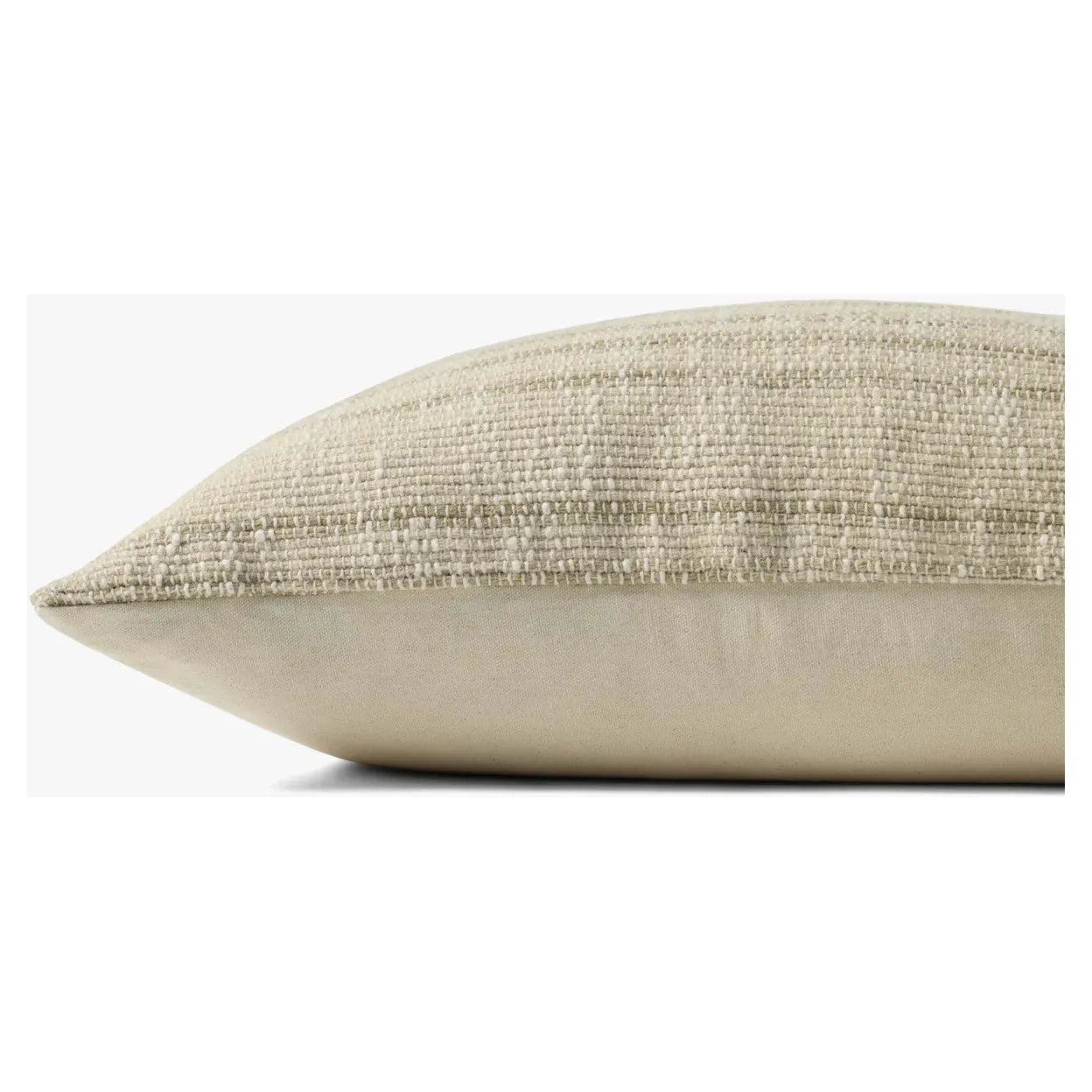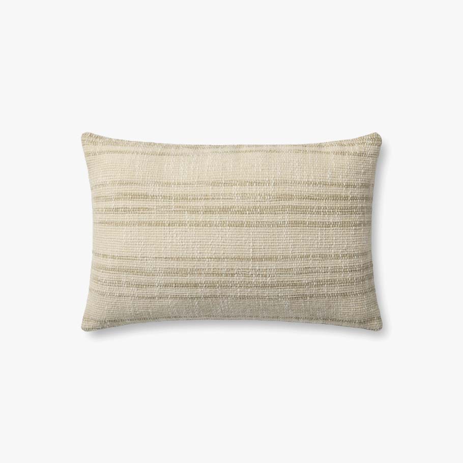 This throw pillow from Brigette Romanek x Loloi features neutral beige stripes with a classic rug-like texture woven of wool and cotton. The front pillow cover is 68% wool and 32% cotton and measures 13” x 21”, an elongated size to style in living rooms and bedrooms.