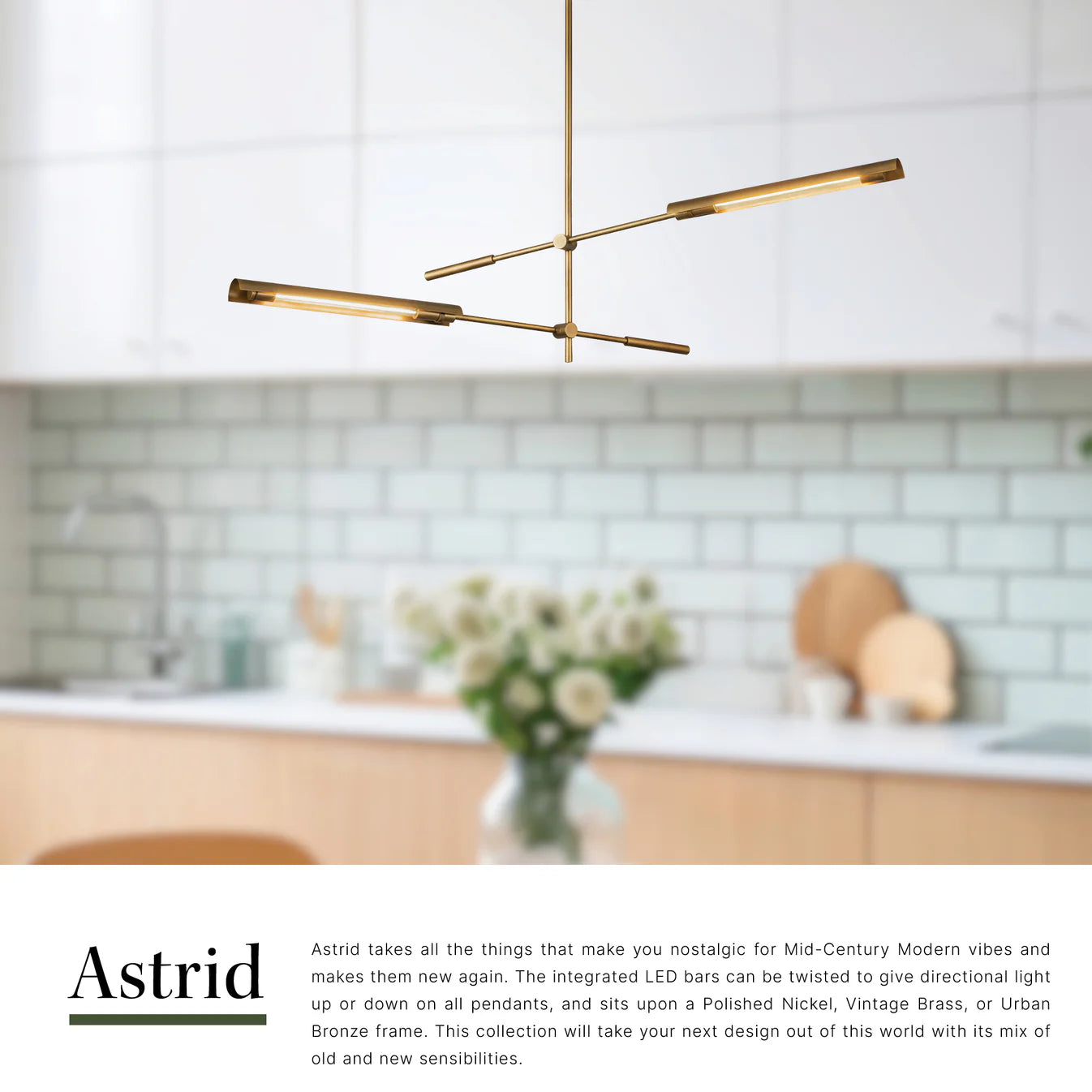 Astrid takes all the things that make you nostalgic for Mid-Century Modern vibes and makes them new again. The integrated LED bars can be twisted to give directional light up or down on all pendants, and sits upon a Polished Nickel, Vintage Brass, or Urban Bronze frame. This collection will take your next design out of this world with its mix of old and new sensibilities.