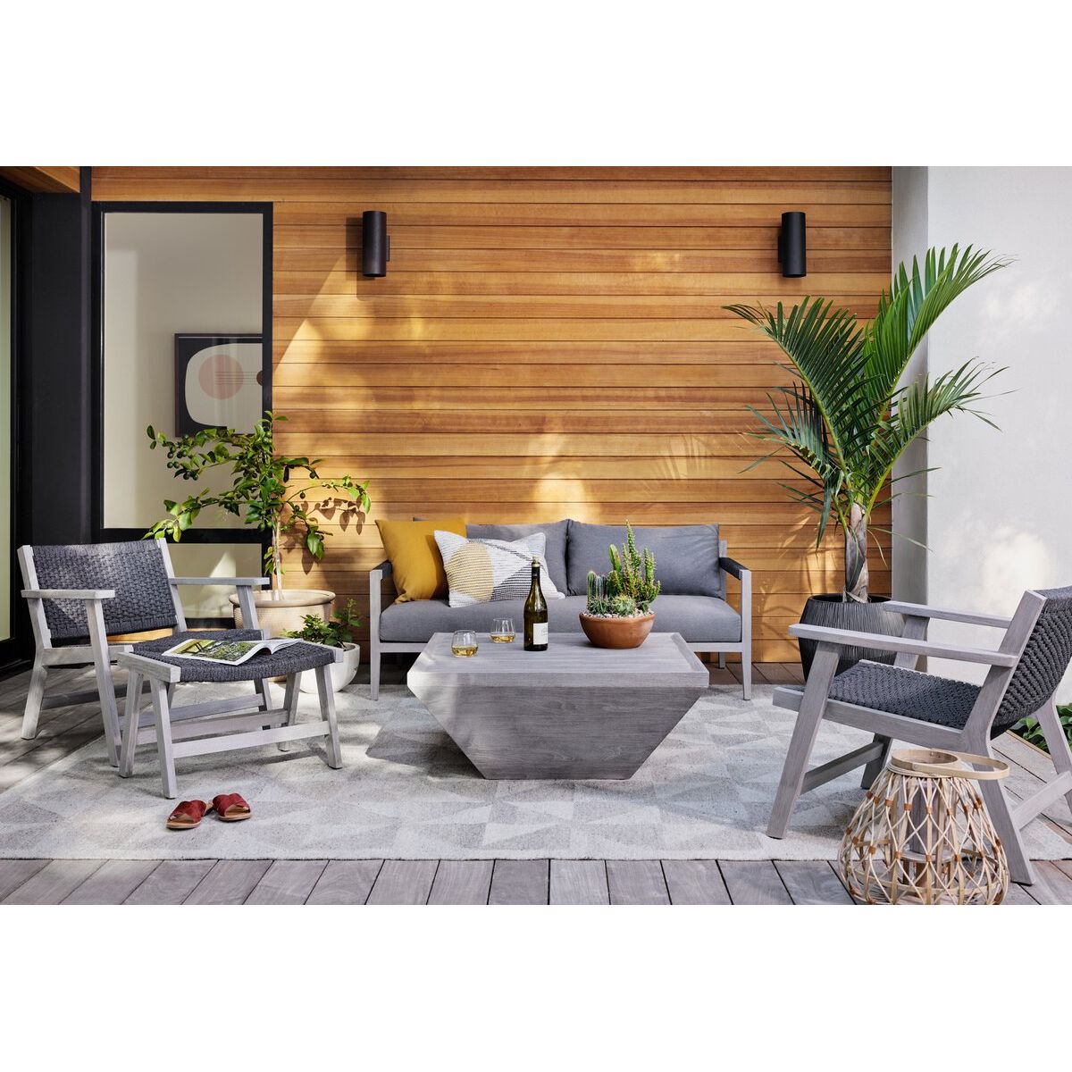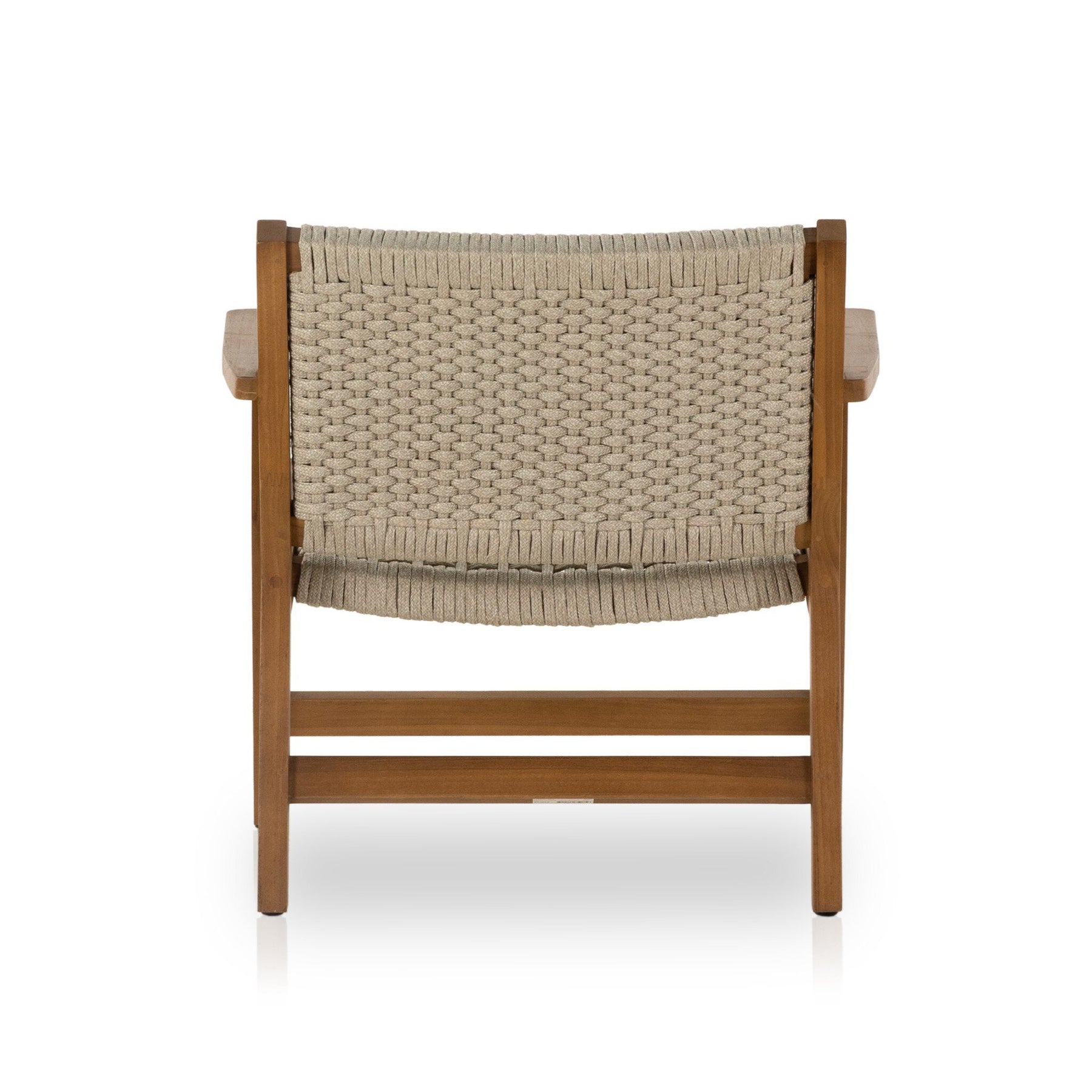 A textural take on the outdoor armchair, weathered natural teak welcomes thick, handwoven rope seating in a rich ivory. Safe for outdoor spaces. Cover or store indoors during inclement weather and when not in use.