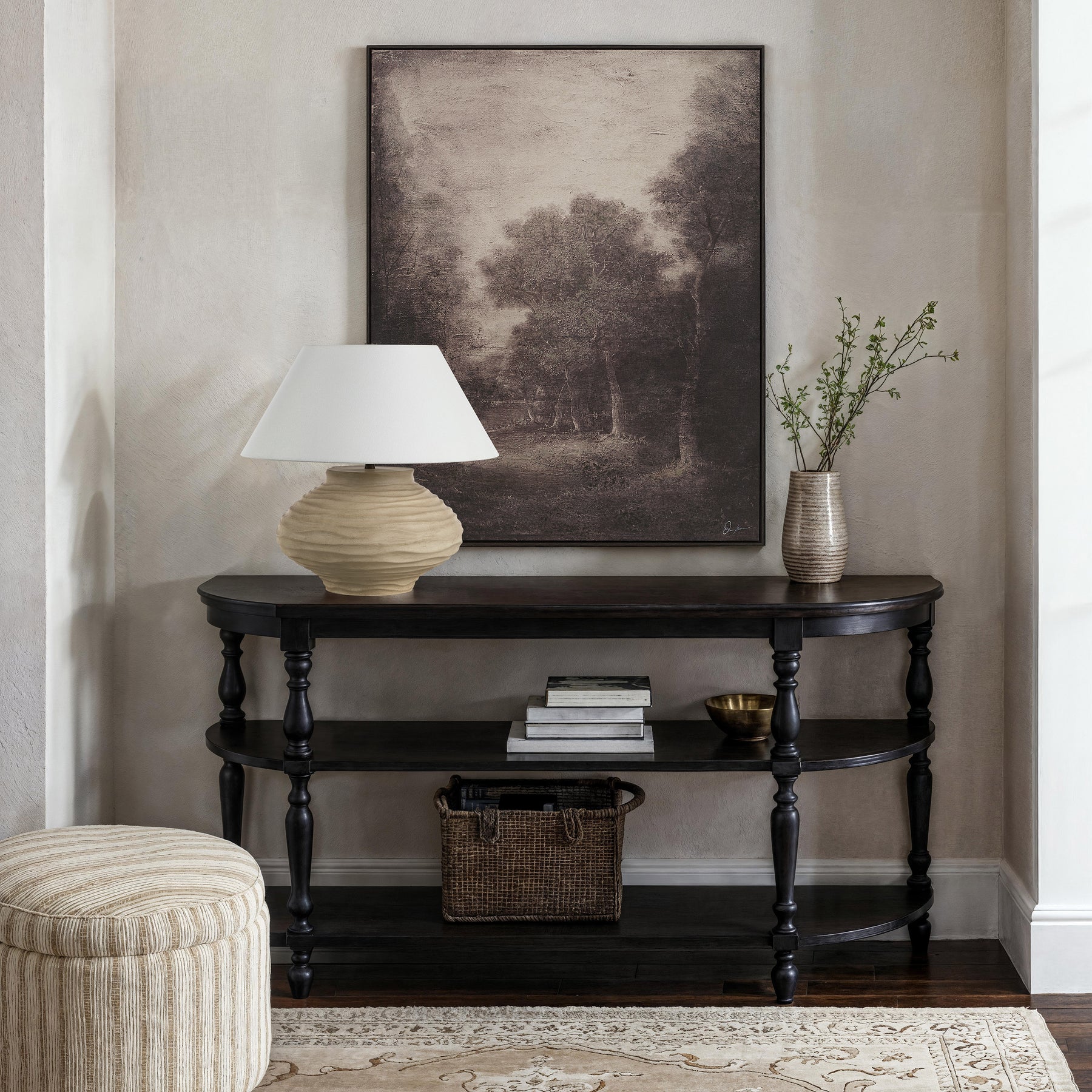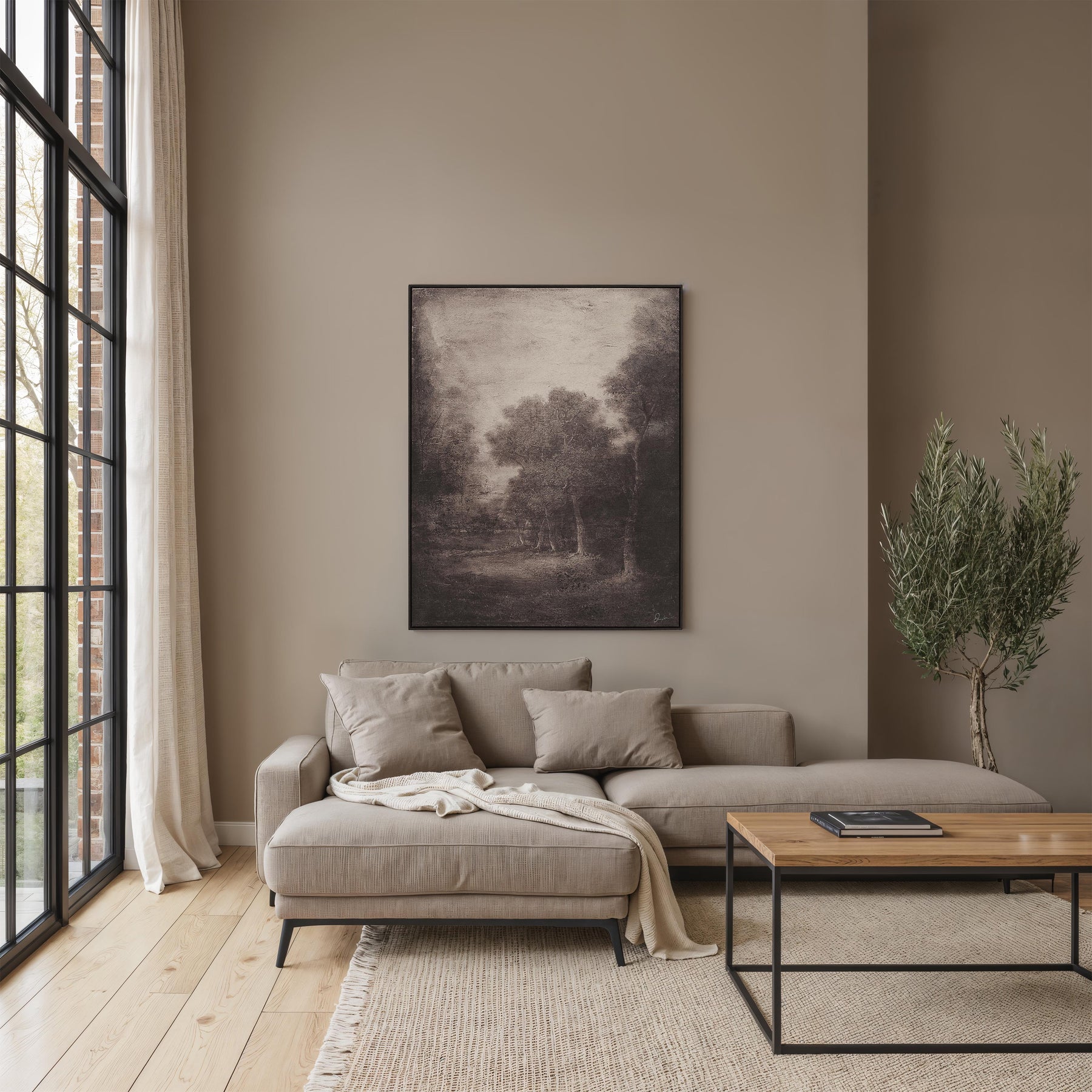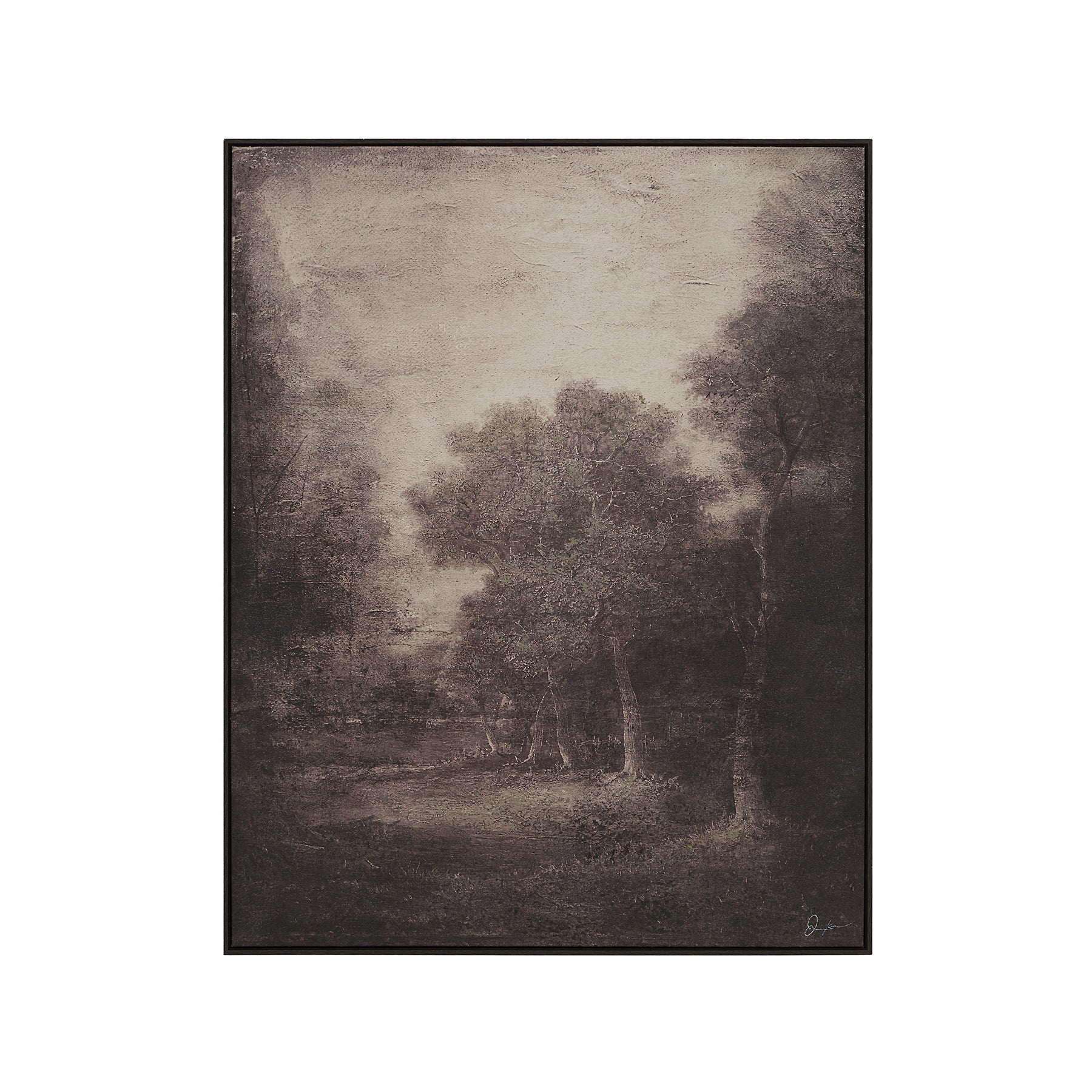 Evoke a serene, otherworldly mood with the Falco canvas wall art. Its soft tones and textured hand-painted gel details transform a simple landscape into a captivating, dreamlike scene. Housed in a dark wood floating frame, this piece delivers a striking balance of elegance and drama, making it an ideal focal point for moody, fashion-forward interiors.