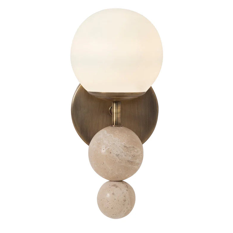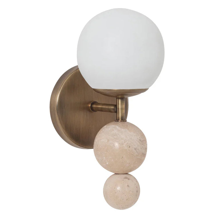 Give any space a glow up with the effortless charm of the Leni wall sconce. A blend of travertine, matte antique brass-plated iron, and opal white glass creates warmth, texture, and instant style. Whether flanking a mirror or displayed solo in a hallway or reading nook, it brings transitional sophistication that always makes an impression.