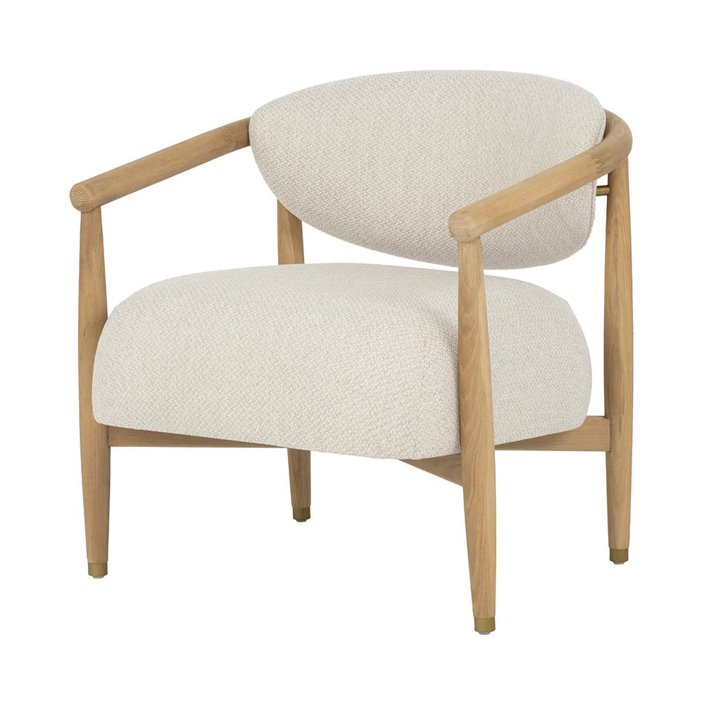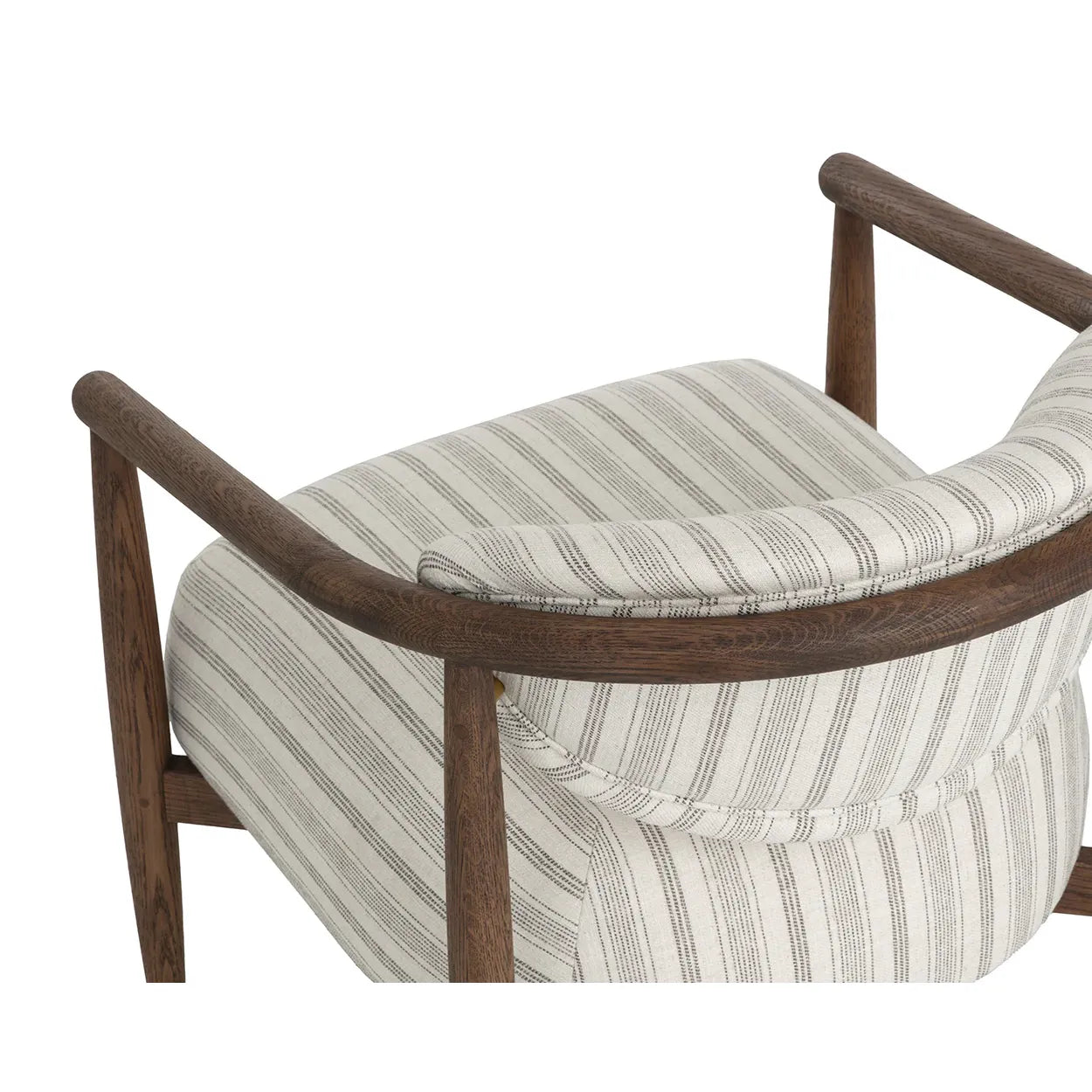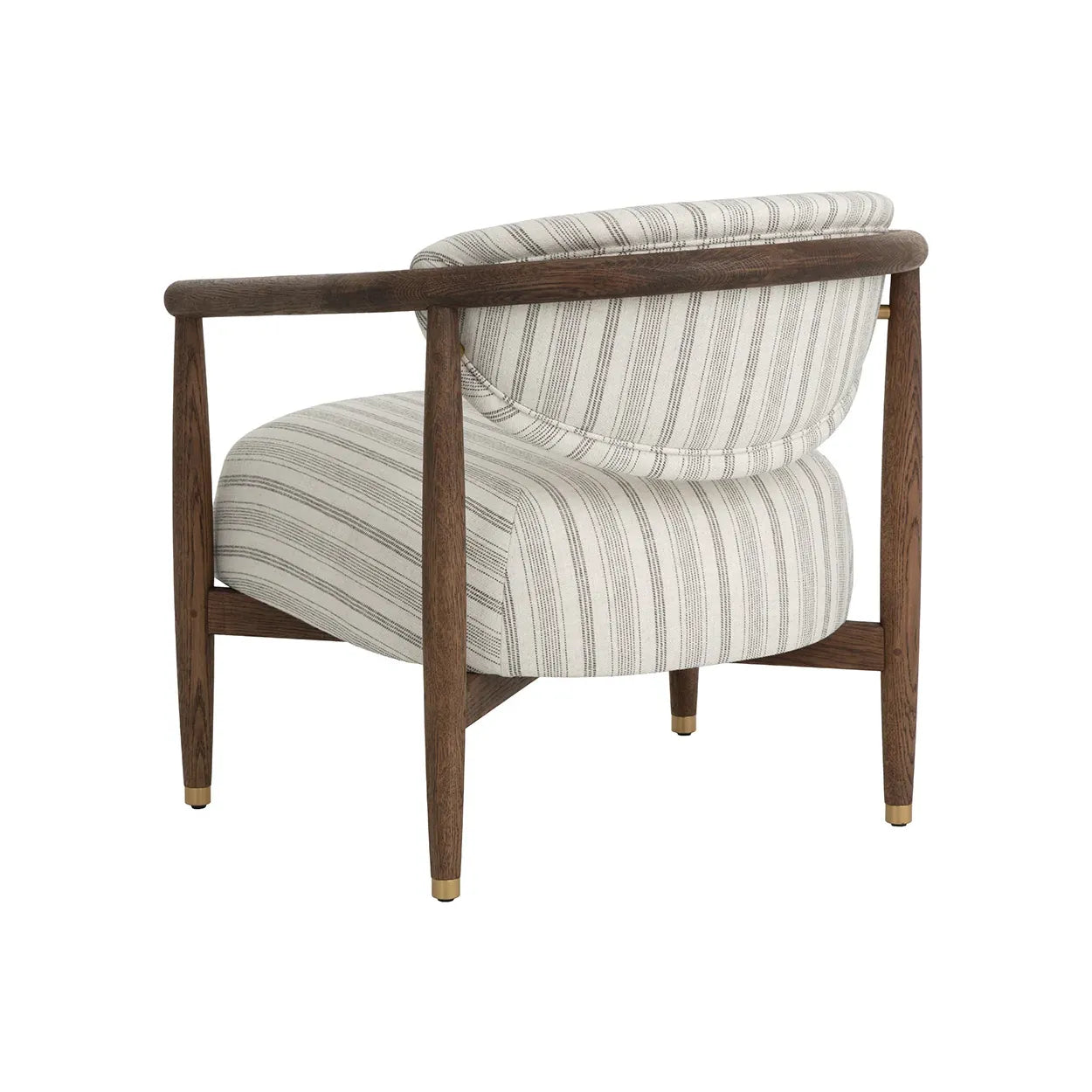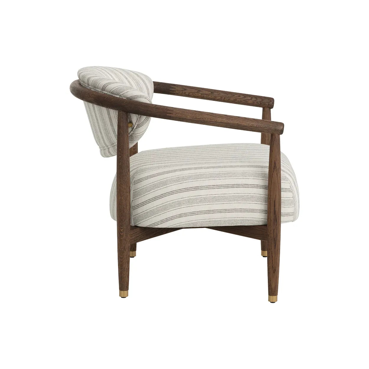 A study in poise and proportion, the Siri Lounge Chair is designed for gathering in ease. Its rounded dark oak frame wraps gracefully around striped, gifford script or monument oatmeal fabric upholstery. A stainless steel stretcher and feet caps complete the frame, adding a beautiful contrast against the warmth of the oak.