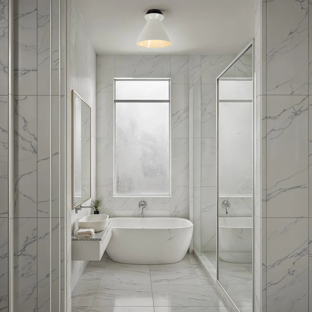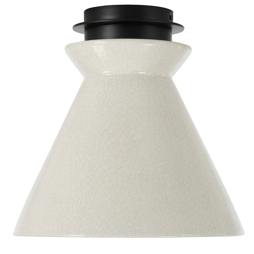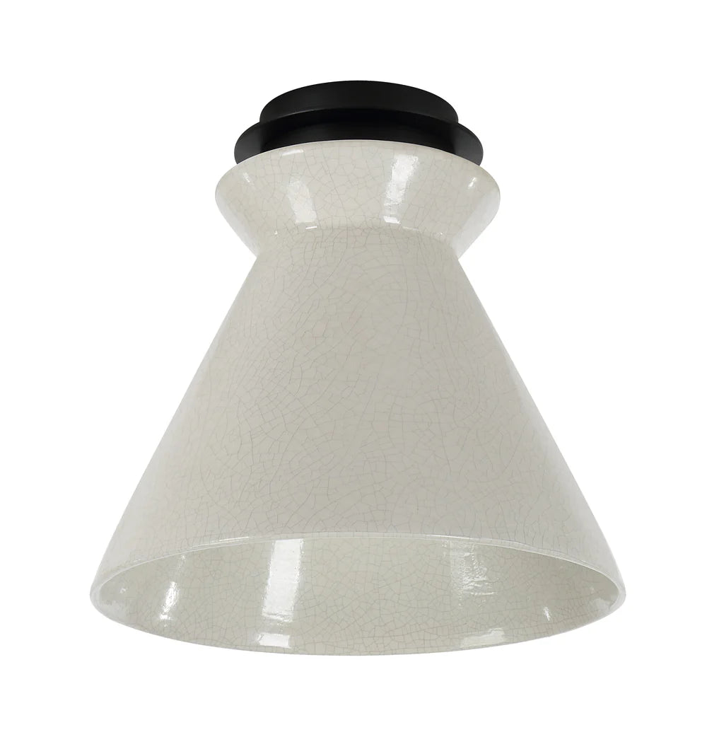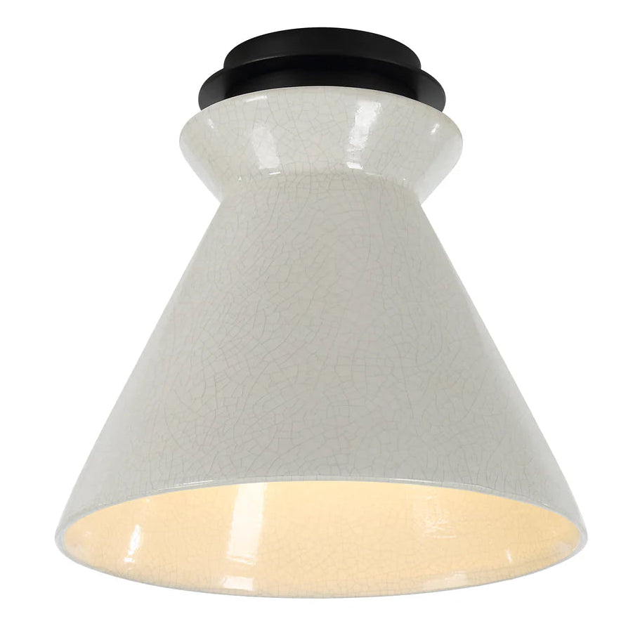 The Sola flush mount brings refined simplicity to the forefront, blending minimalist form with handcrafted character. Finished with a delicate crackle glaze, its ceramic shade adds texture, while the black detailing gives the design a crisp, contemporary edge. Whether installed solo or in multiples, this fixture introduces an understated yet memorable presence to any room.