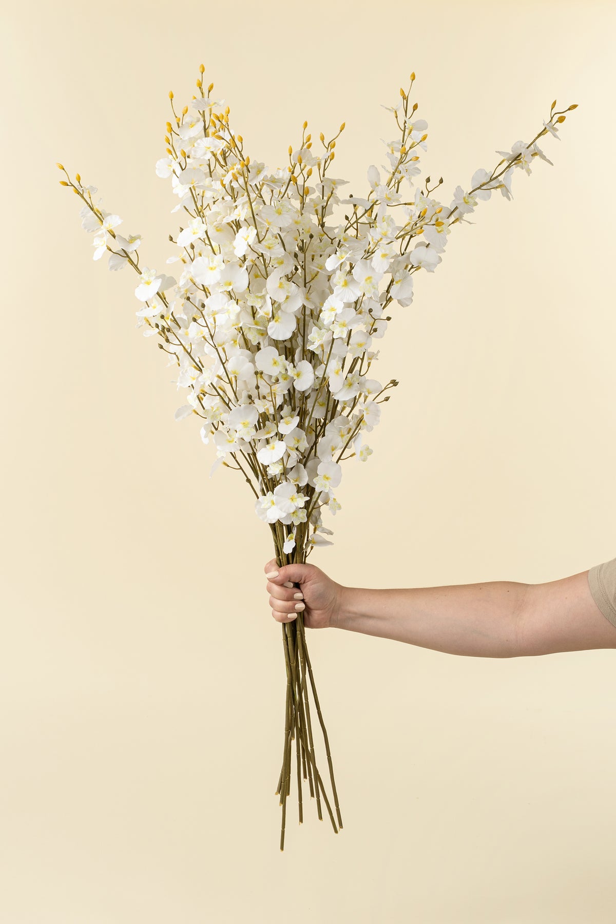 Graceful and refined, the White Orchid Spray brings effortless beauty to your accent decor. With delicate white petals, soft yellow buds, and long stems that add height and movement, this faux flower delivers timeless elegance without the upkeep.