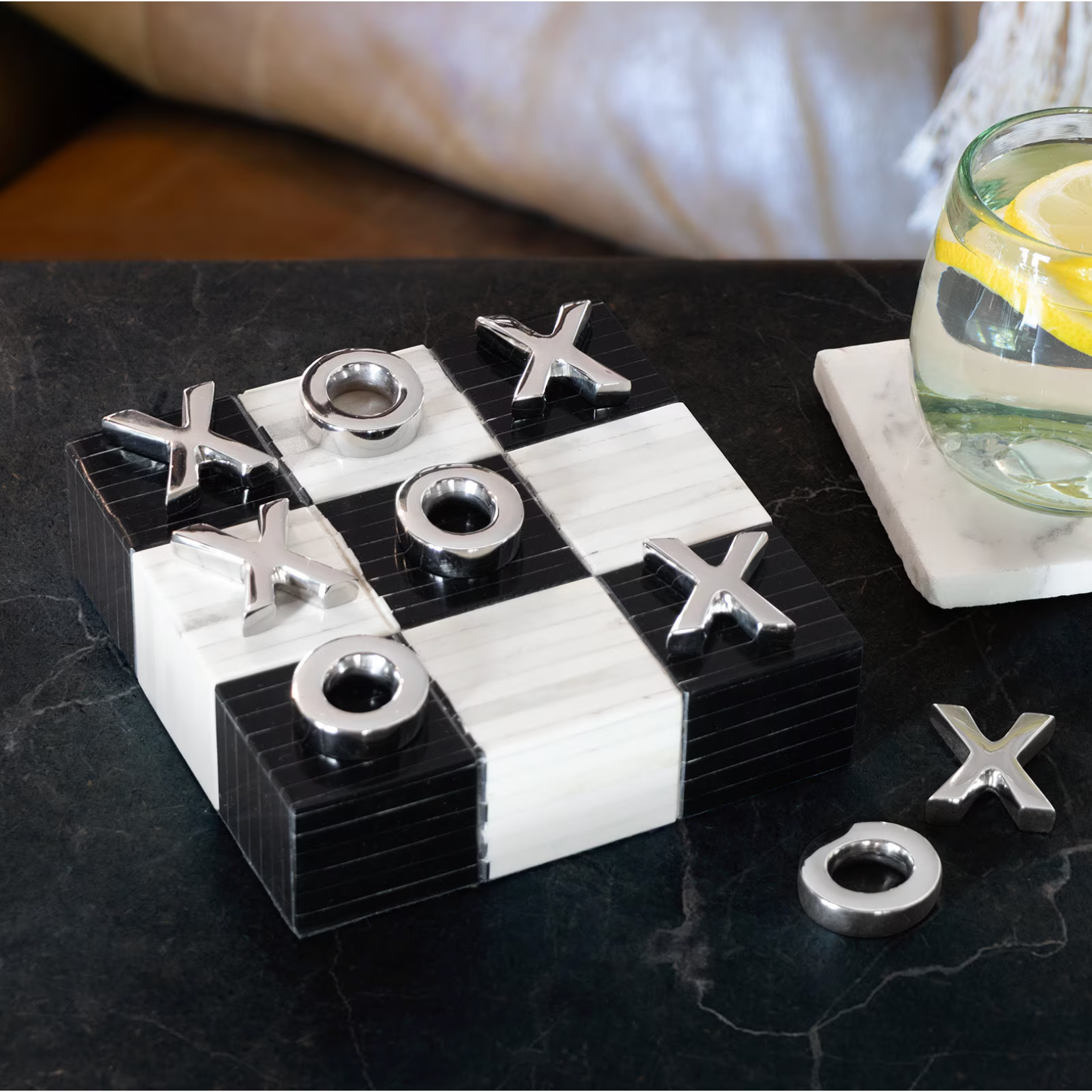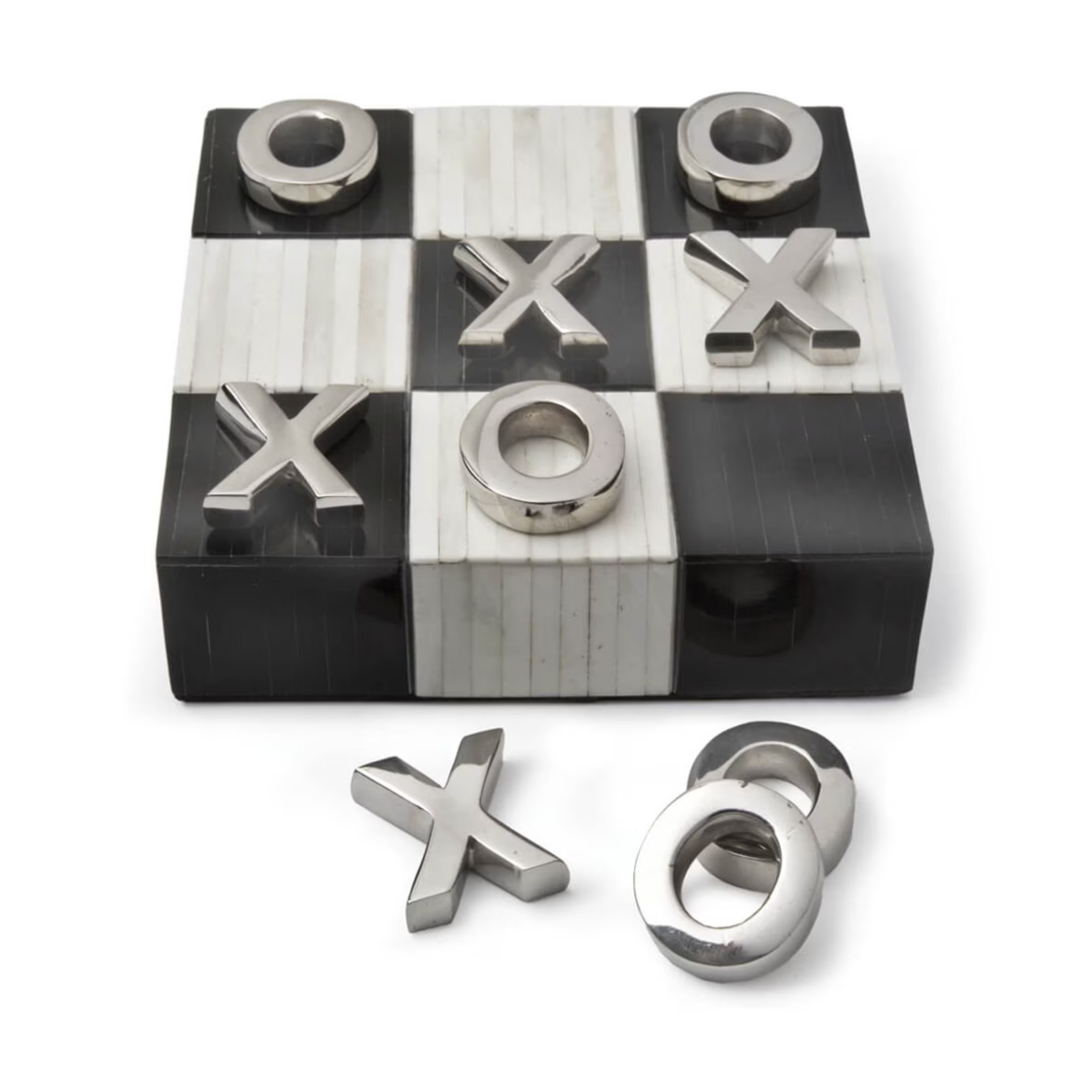 A classic game turned décor. This stylish and functional Tic Tac Toe game is played with brass X’s and O’s on a natural-finished, checkered pattern bone board.