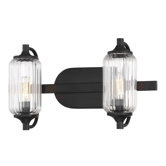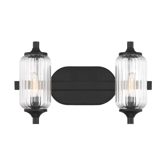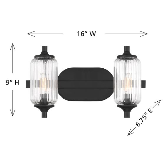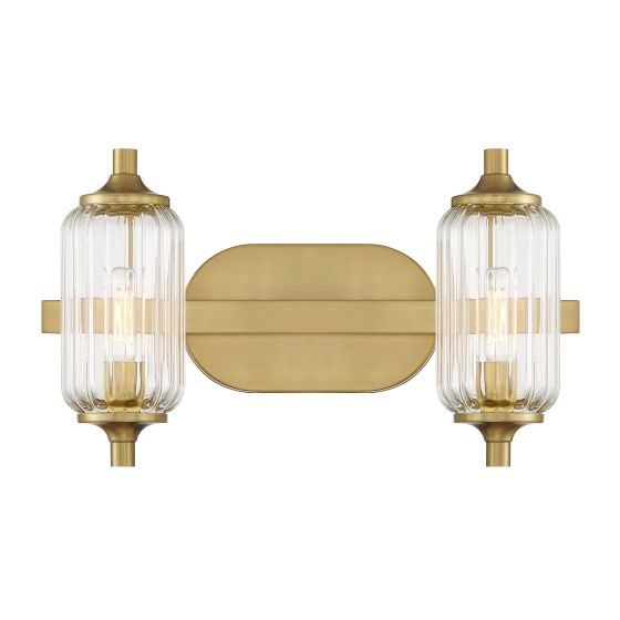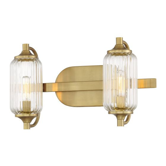 The Savoy House Holton 2-light bath light showcases an inventive and geometric style with tall, rounded shades of clear ribbed glass and a slim, rounded structure finished in Warm Brass & Matte Black. It will bring a big dose of style to any bathroom! Holton is 9" in height, 16" in width and extends 6.75" from the wall. It uses two candelabra size bulbs of up to 60 watts per bulb. Bulbs not included. Install as shown. This bath bar is damp area rated.