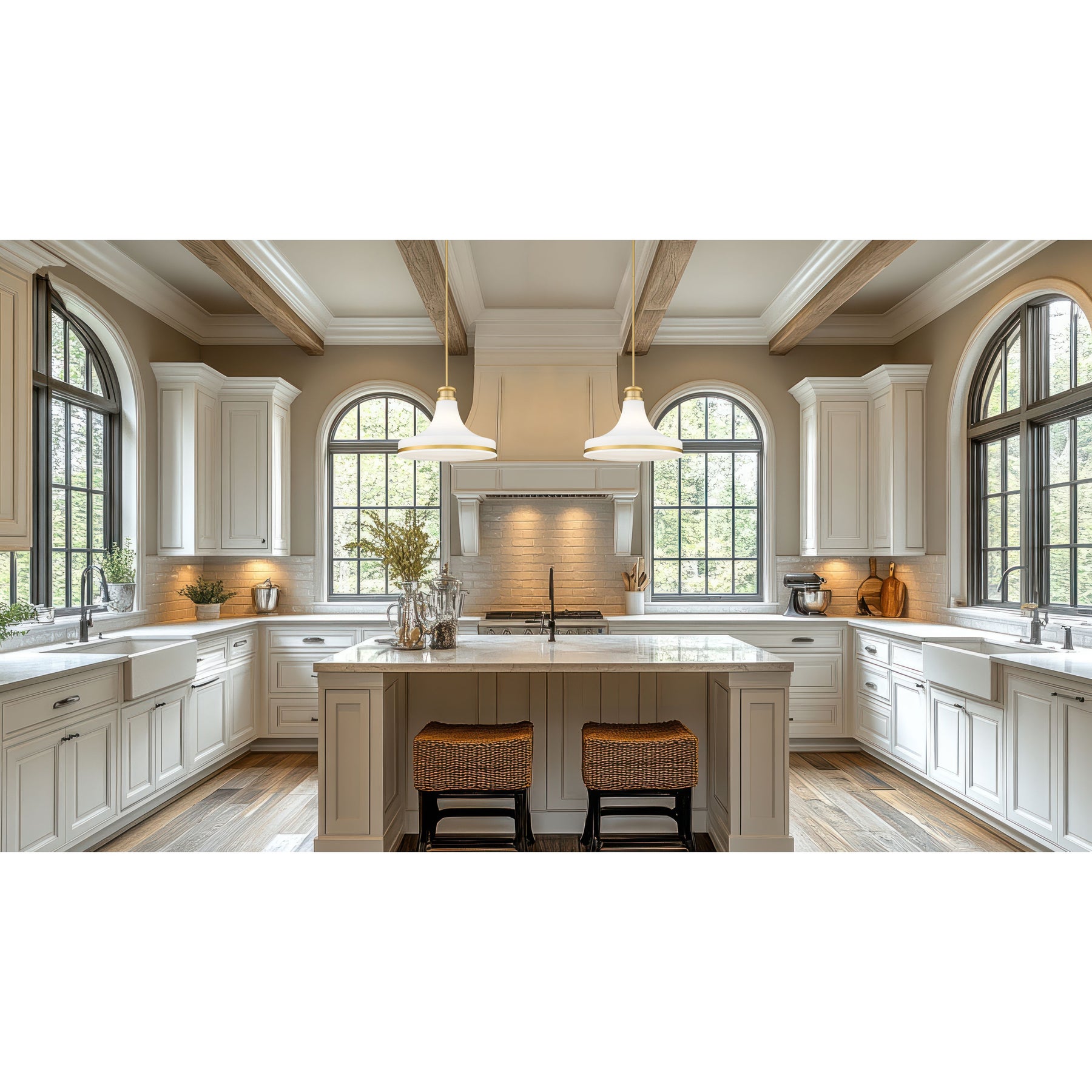 The Reznor collection offers a vintage vibe that has been refreshingly updated for today’s design schemes. Three sizes of pendant fixtures with white opal glass shades are offered to suit most room applications. The finish options are Brushed Nickel, Matte Black, or Modern Gold.