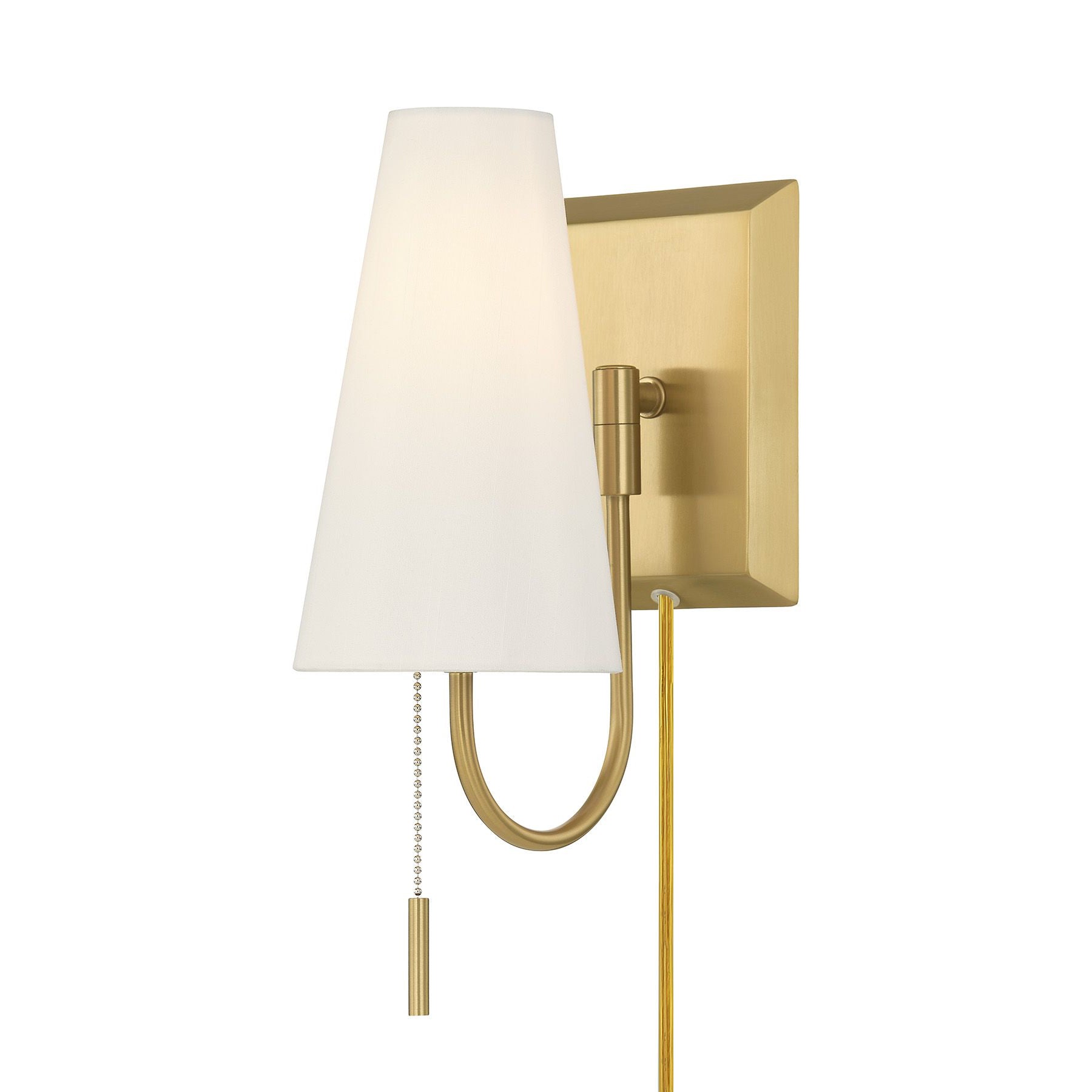 The Savoy House Wilkes 1-light sconce, designed by award-winning interior designer Dann Foley, offers versatility and elegance in one beautifully executed piece. A Warm Brass finished arm and delicate pull chain strike a graceful note beneath the conical white fabric shade, making this fixture ideal for bedside lighting and reading nooks. Wilkes is 11.25" in height, 5" in width and extends 8" from the wall. It uses one standard size bulb of up to 60 watts. Bulb not included. Can be hard-wired or plugged in.