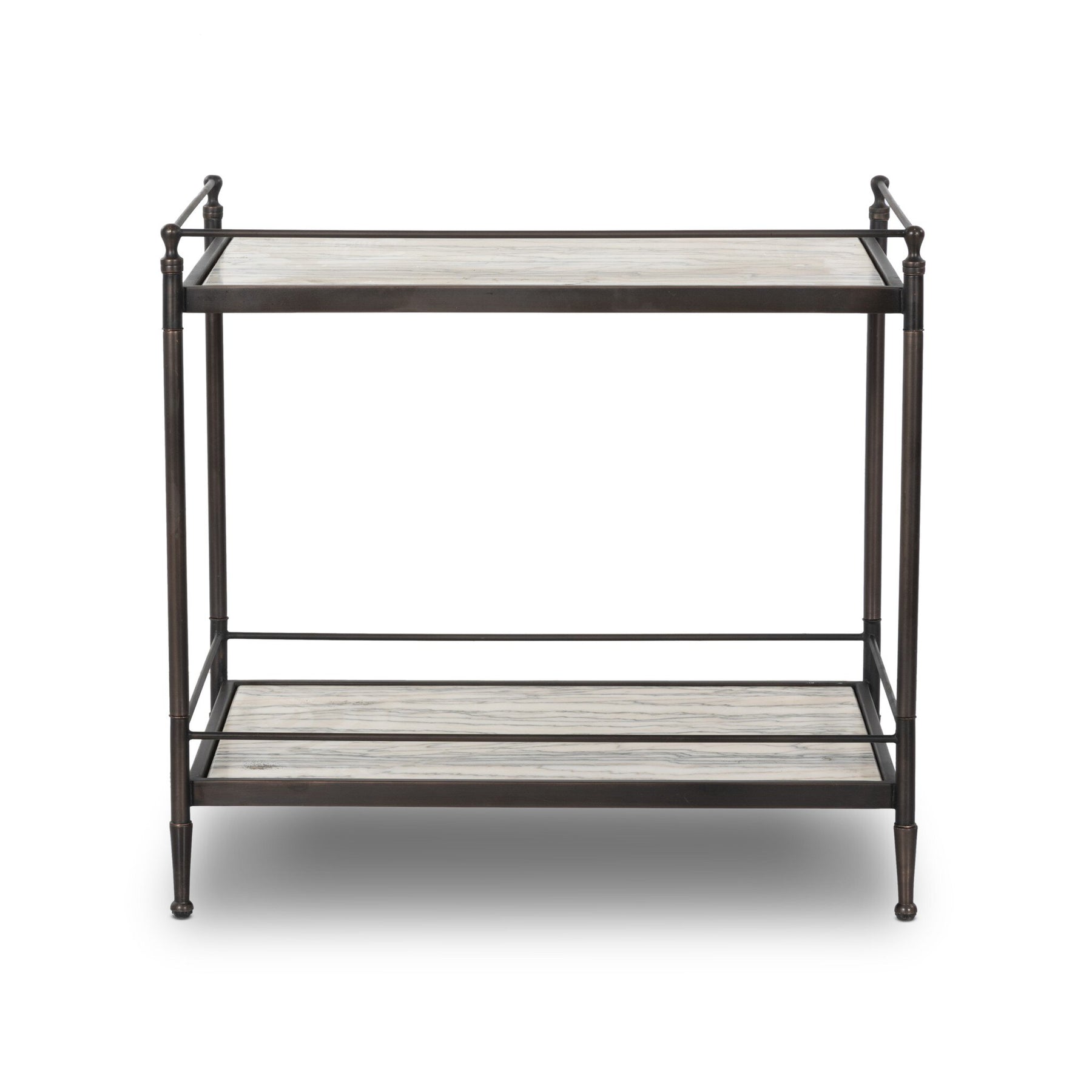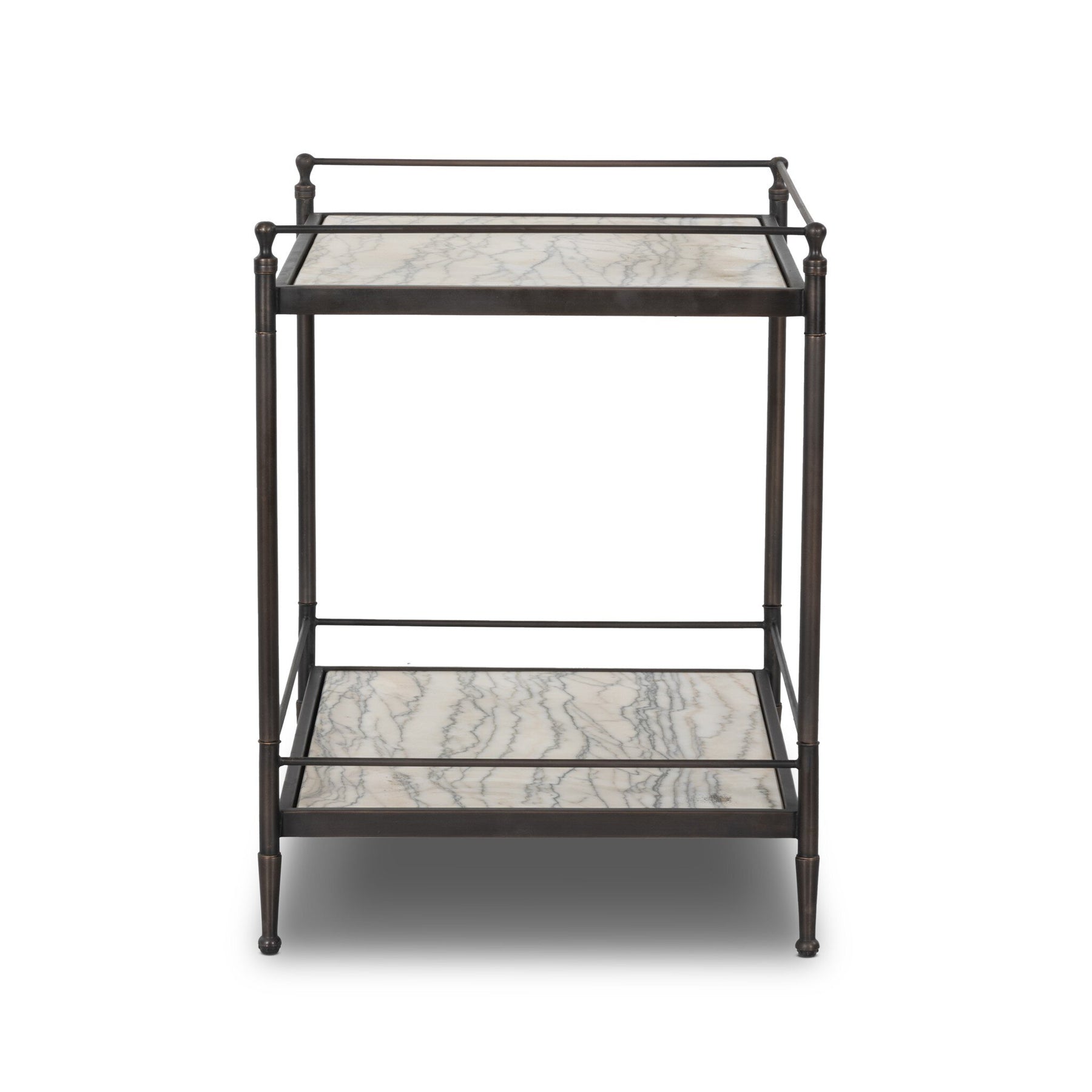 Bring a touch of heritage charm to your bedroom with this two-tier metal nightstand. An aged rust finish complements solid marble shelves with stripe-like veining, finished out with turned legs and gallery edging.