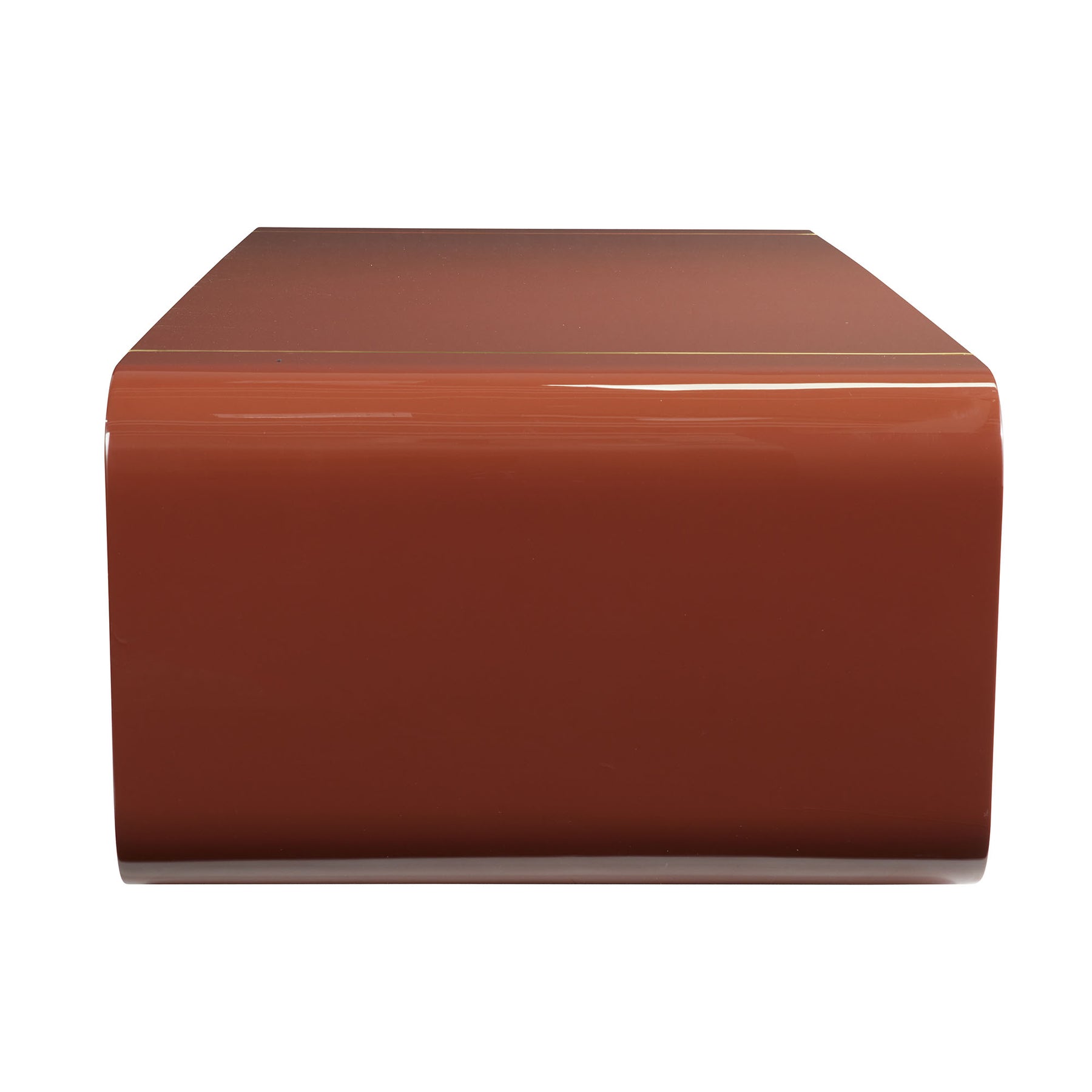 A modern take on a traditional scroll table, the Turnley cocktail table provides a sleek profile. The rich and vibrant paprika lacquer finish brings a luxe shine to the surface, while thin antique brass inlay stetches edge to edge. The softened angular shape of the legs breaks away from the traditional scroll leg, bringing forth a modern interpretation.