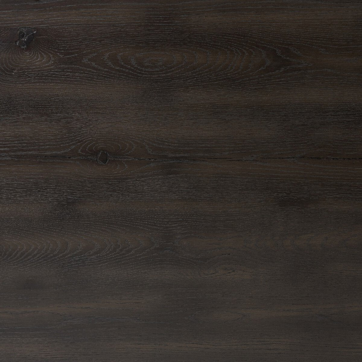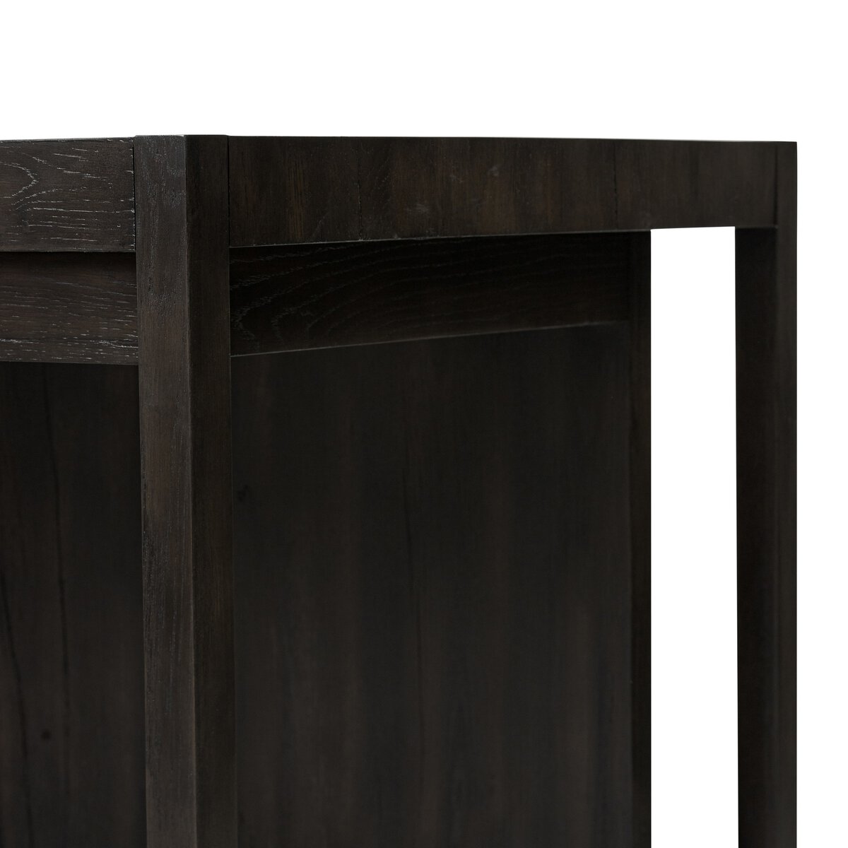 Made from solid oak and oak veneer and finished in a smoky black, an executive-size desk features a fully finished back, offering the option to float-style in a room. Plenty of varied-size drawers offer generous storage space.