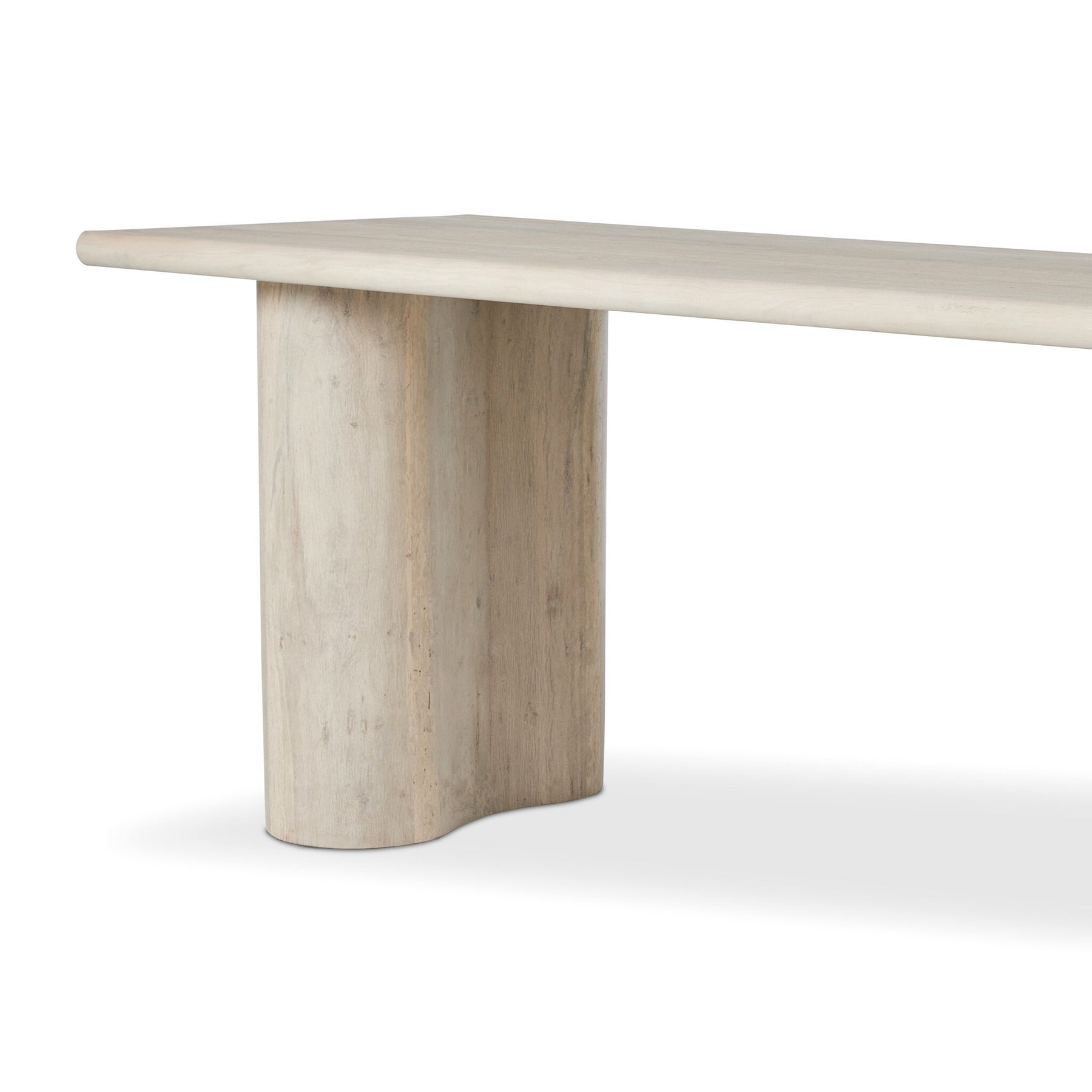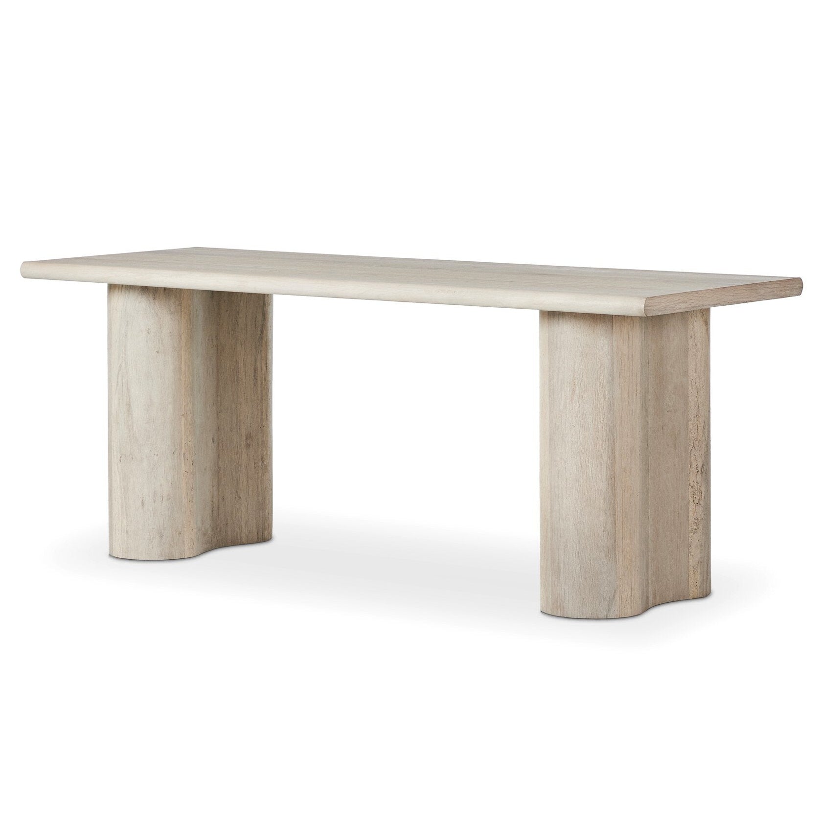 Bleached spalted oak takes center stage in this minimalist desk. A clean, drawer-free design highlights woods' distinctive graining, while curved legs and bullnose edging create a sense of fluidity.