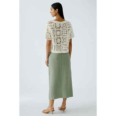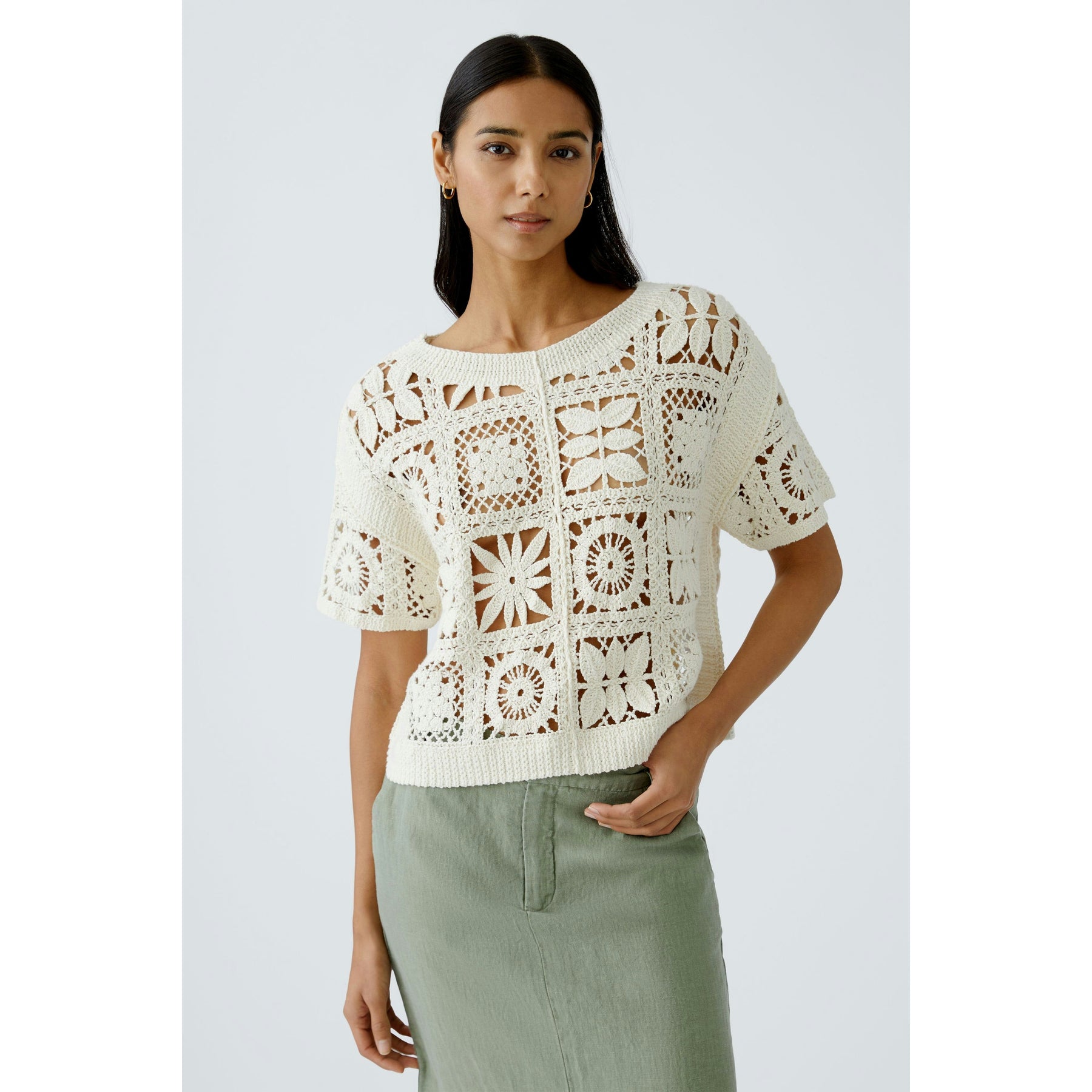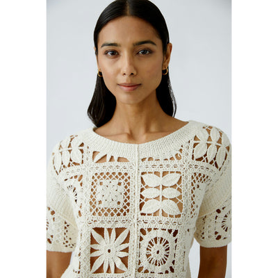 Pullover knitted using an elaborate warp technique, resulting in the trendy, transparent macramé look