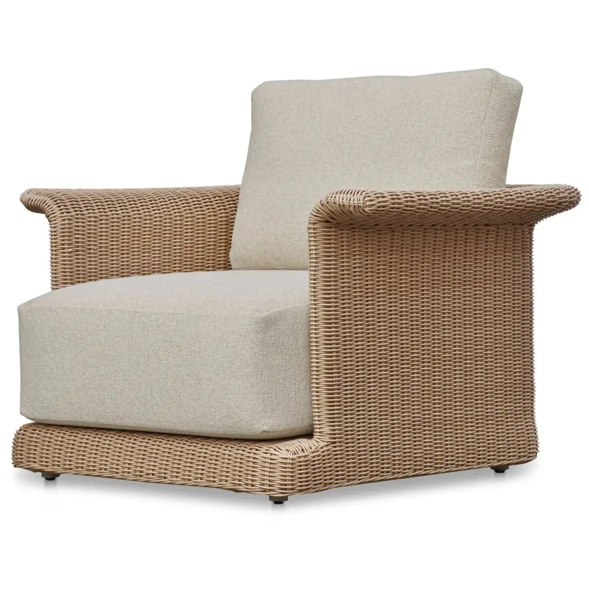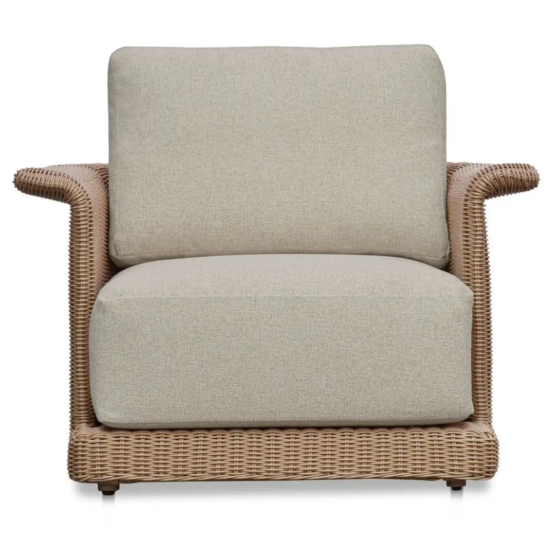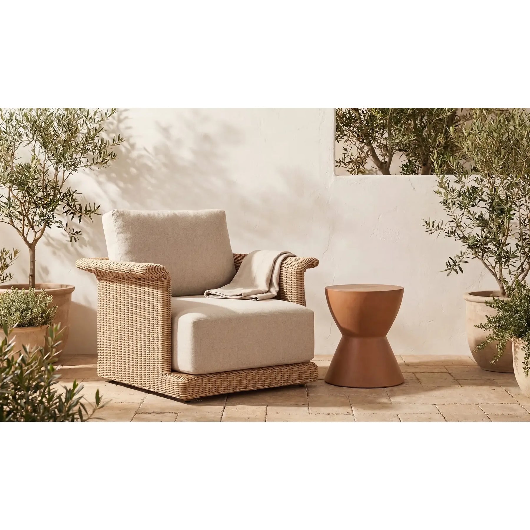 The Meredith accent chair's graceful tulip silhouette and curved armrests create visual interest, while generous cushioning offers indulgent comfort. Artfully woven synthetic wicker over an aluminum frame marries durability with aesthetic appeal. Quick-dry foam and Dacron fiber ensure lasting resilience, while the sophisticated hue complements various exterior designs.