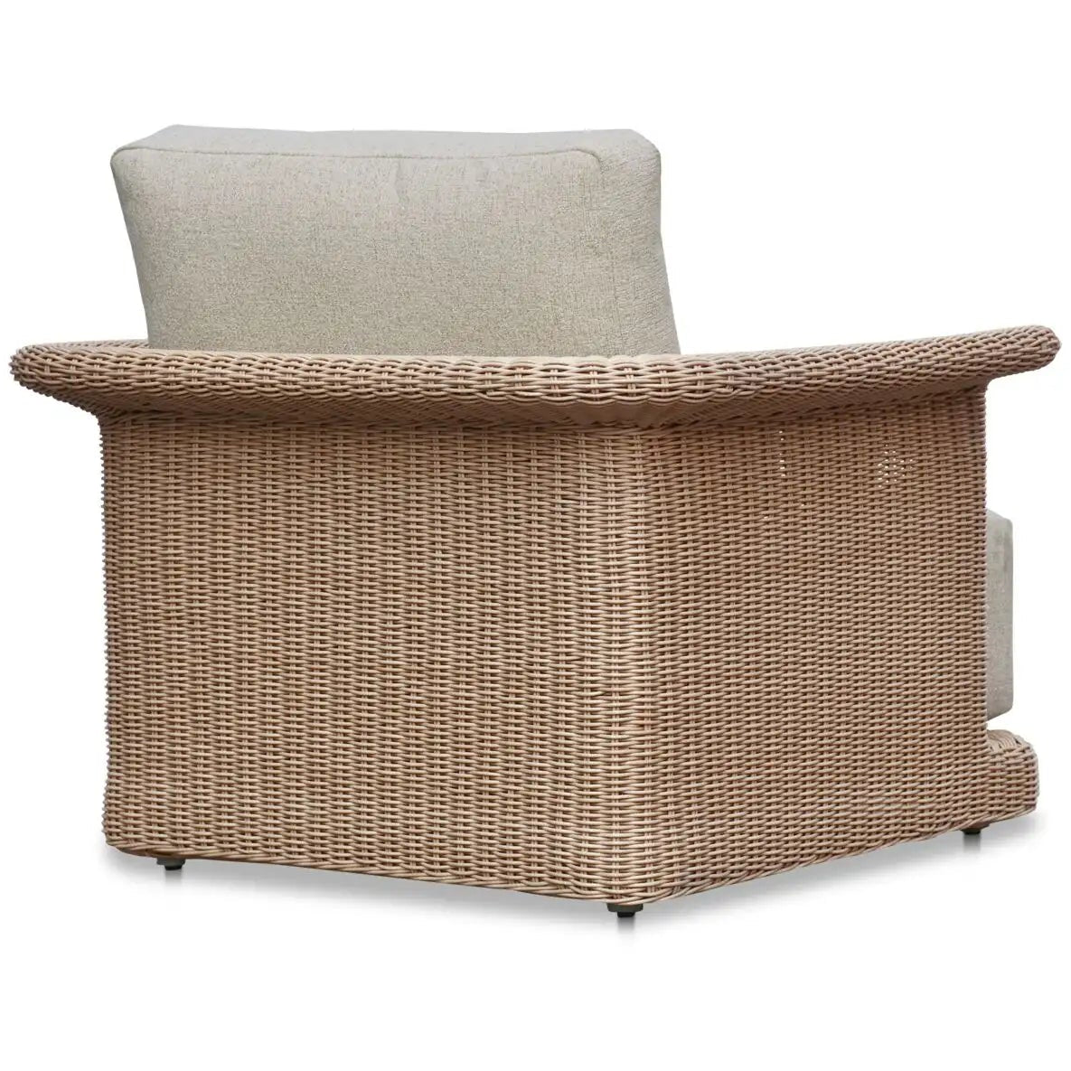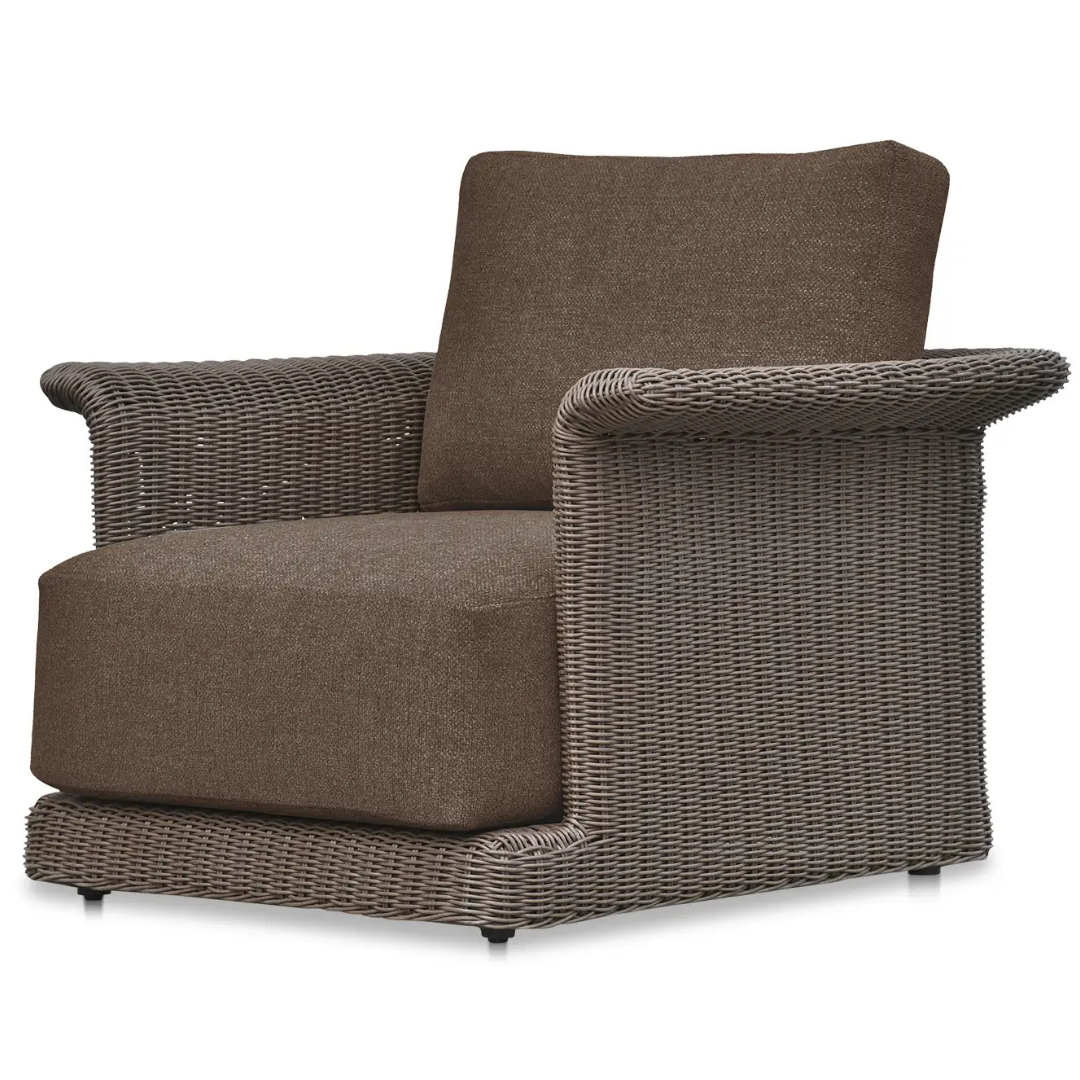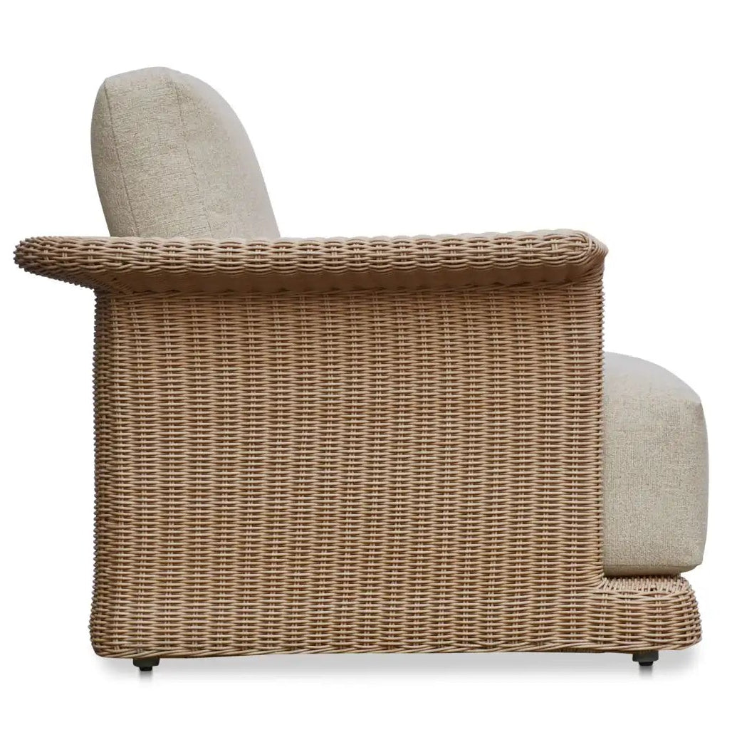 The Meredith accent chair's graceful tulip silhouette and curved armrests create visual interest, while generous cushioning offers indulgent comfort. Artfully woven synthetic wicker over an aluminum frame marries durability with aesthetic appeal. Quick-dry foam and Dacron fiber ensure lasting resilience, while the sophisticated hue complements various exterior designs.