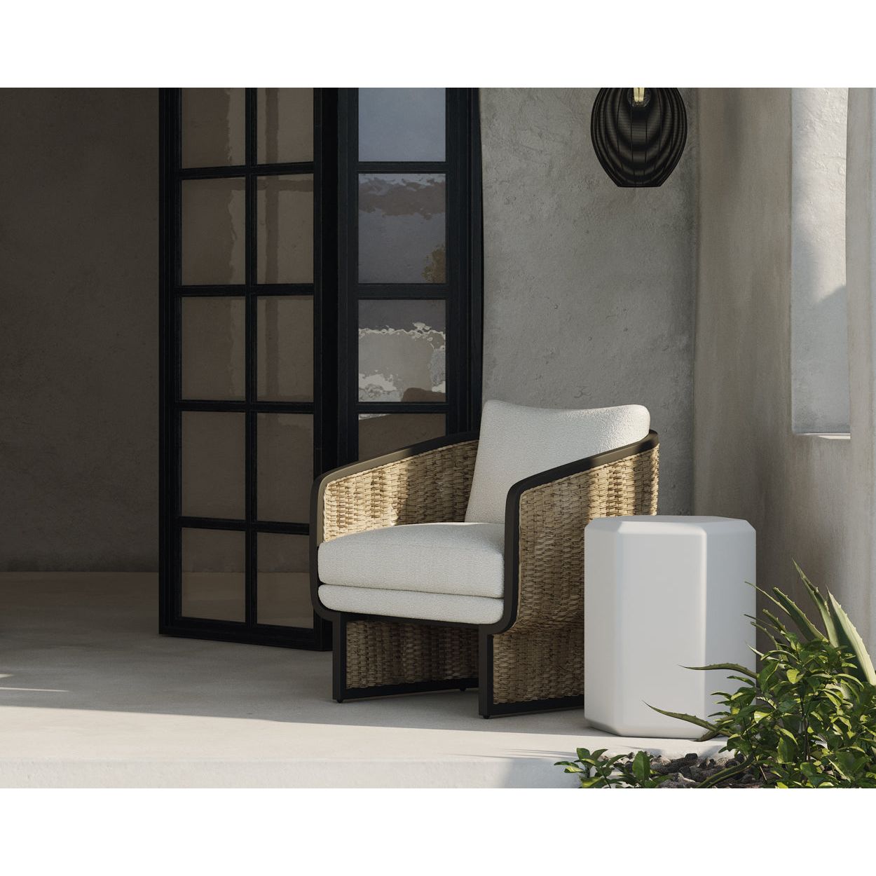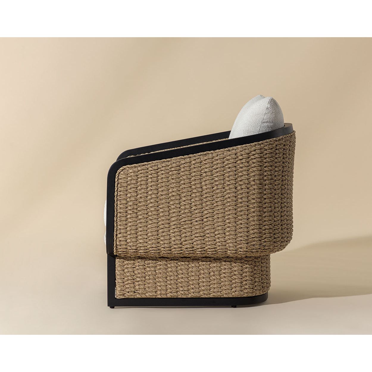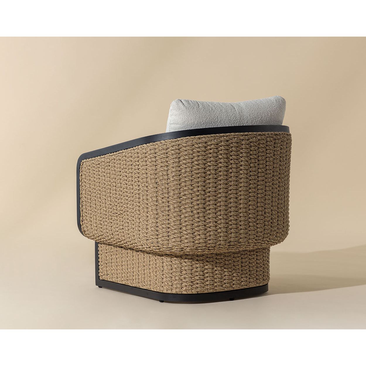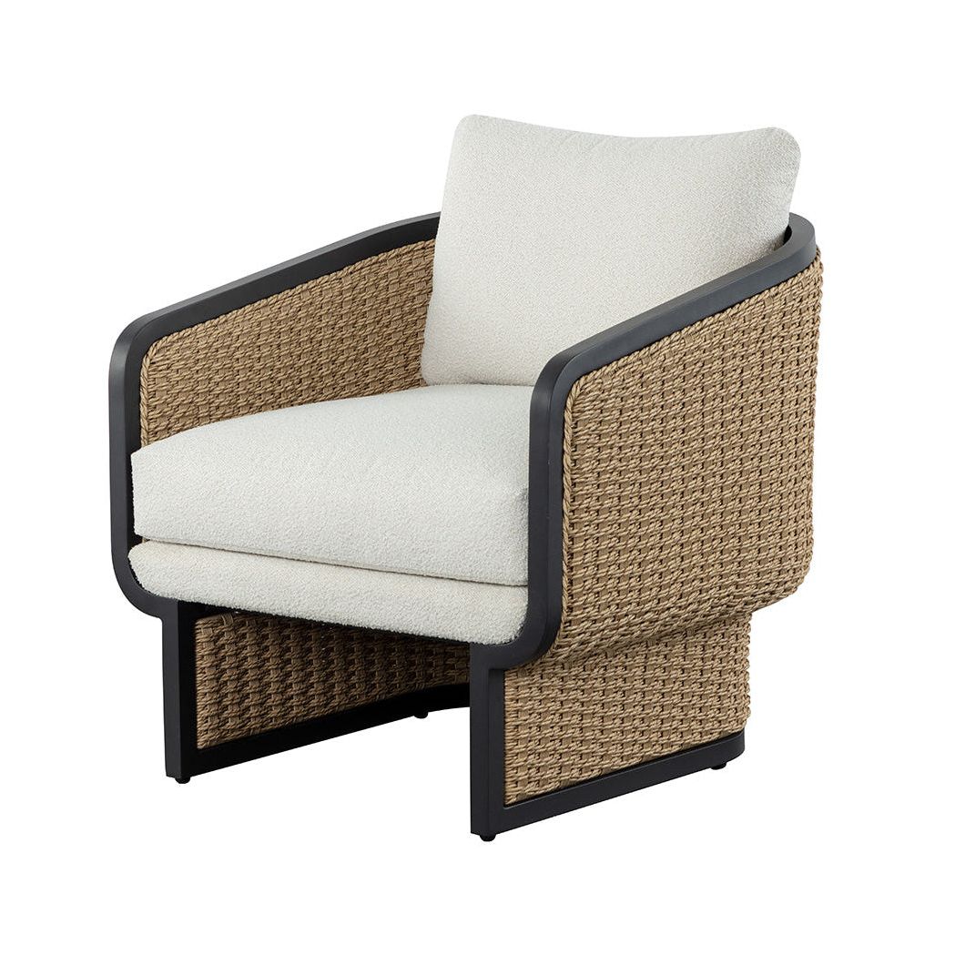 The Olia Lounge Chair seamlessly blends comfort with durable materials and effortless style. Twisted all-weather wicker intricately weaves across a barrelback aluminum frame, adding textured charm. Foam-filled cushions in cozy boucle fabric enhance the feeling of relaxation.