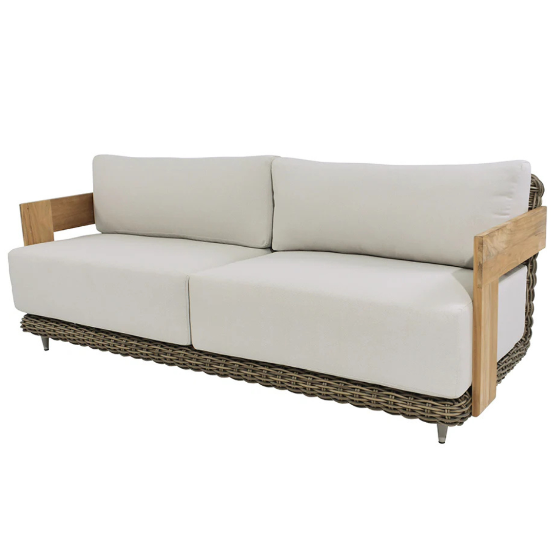 Escape to an outdoor oasis with this beautiful Palazza Outdoor Sofa crafted with a unique set of mixed materials. Features deep, thick seat in palazzo cream fabric with sleek, solid teak wood armrests. A taupe wicker exterior complete this intricate design. Suitable for indoor and covered outdoor spaces.