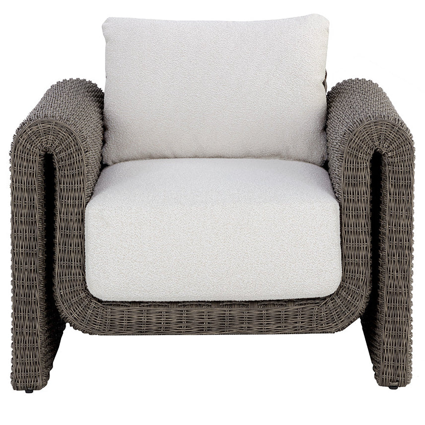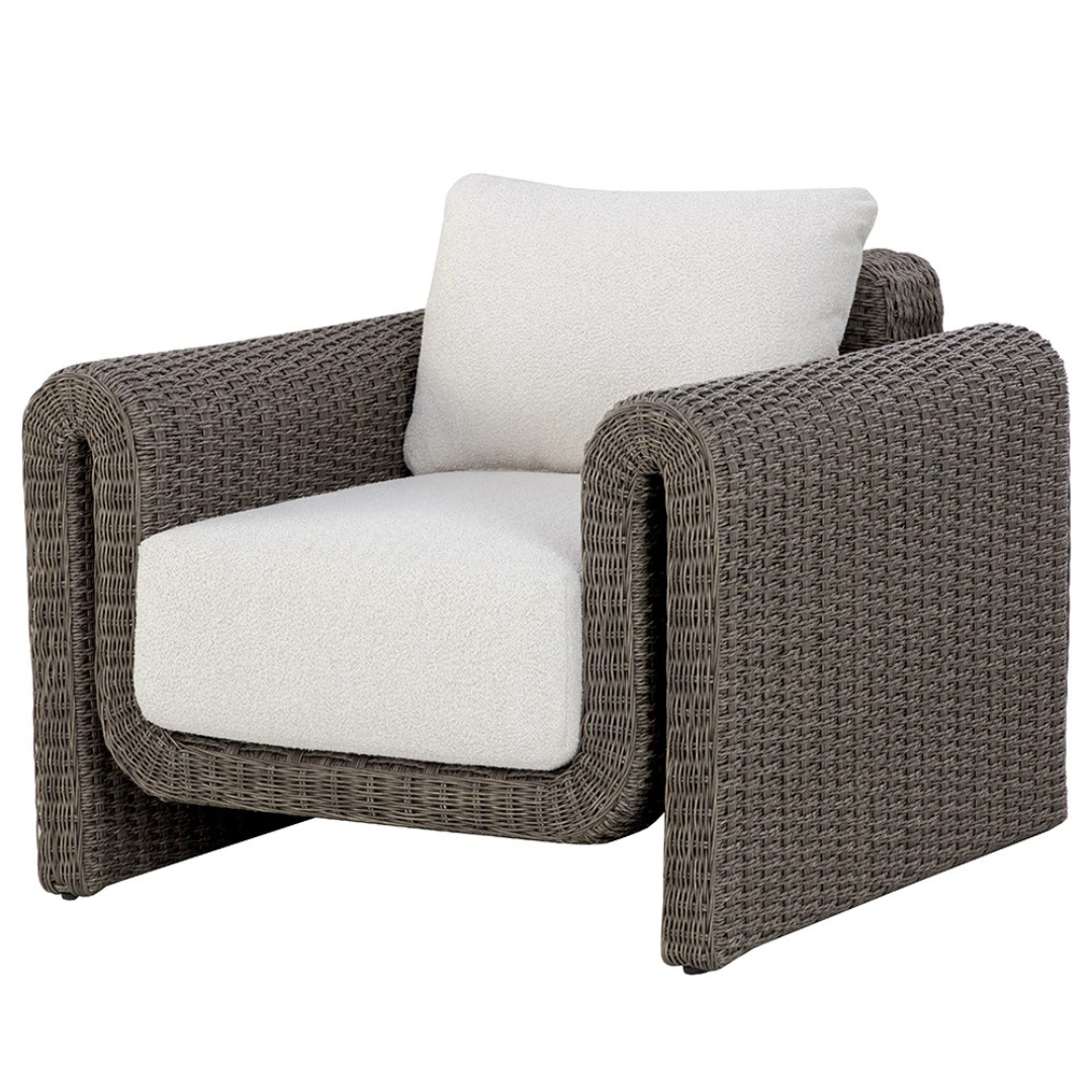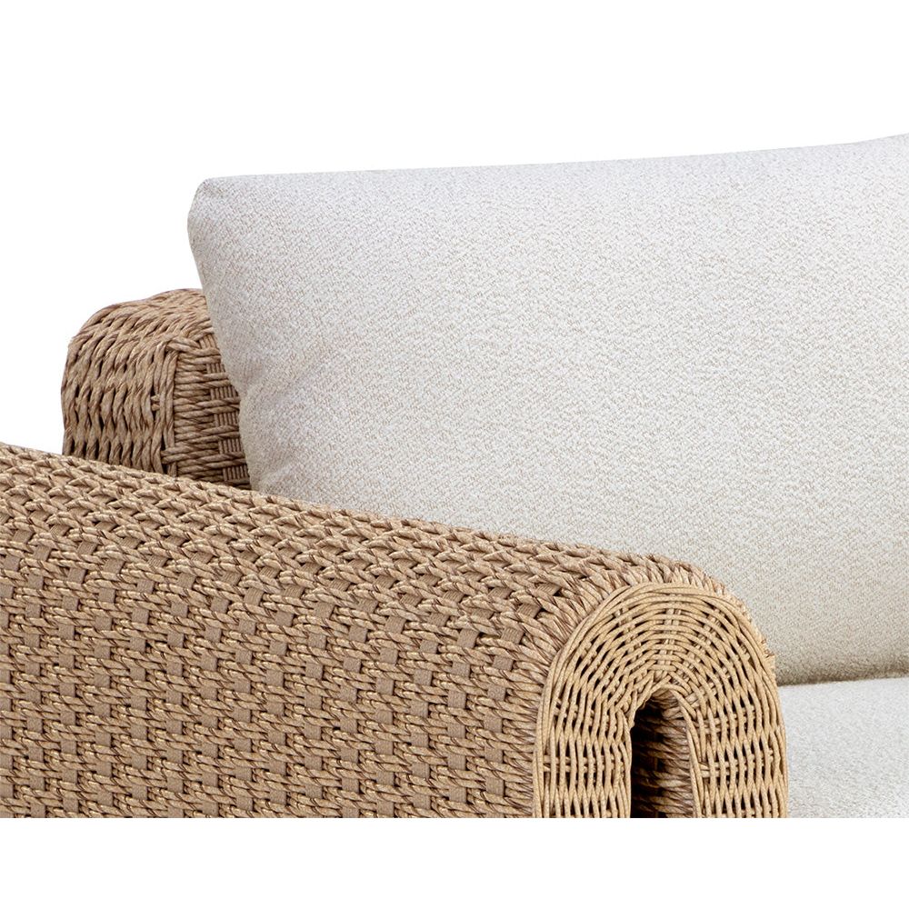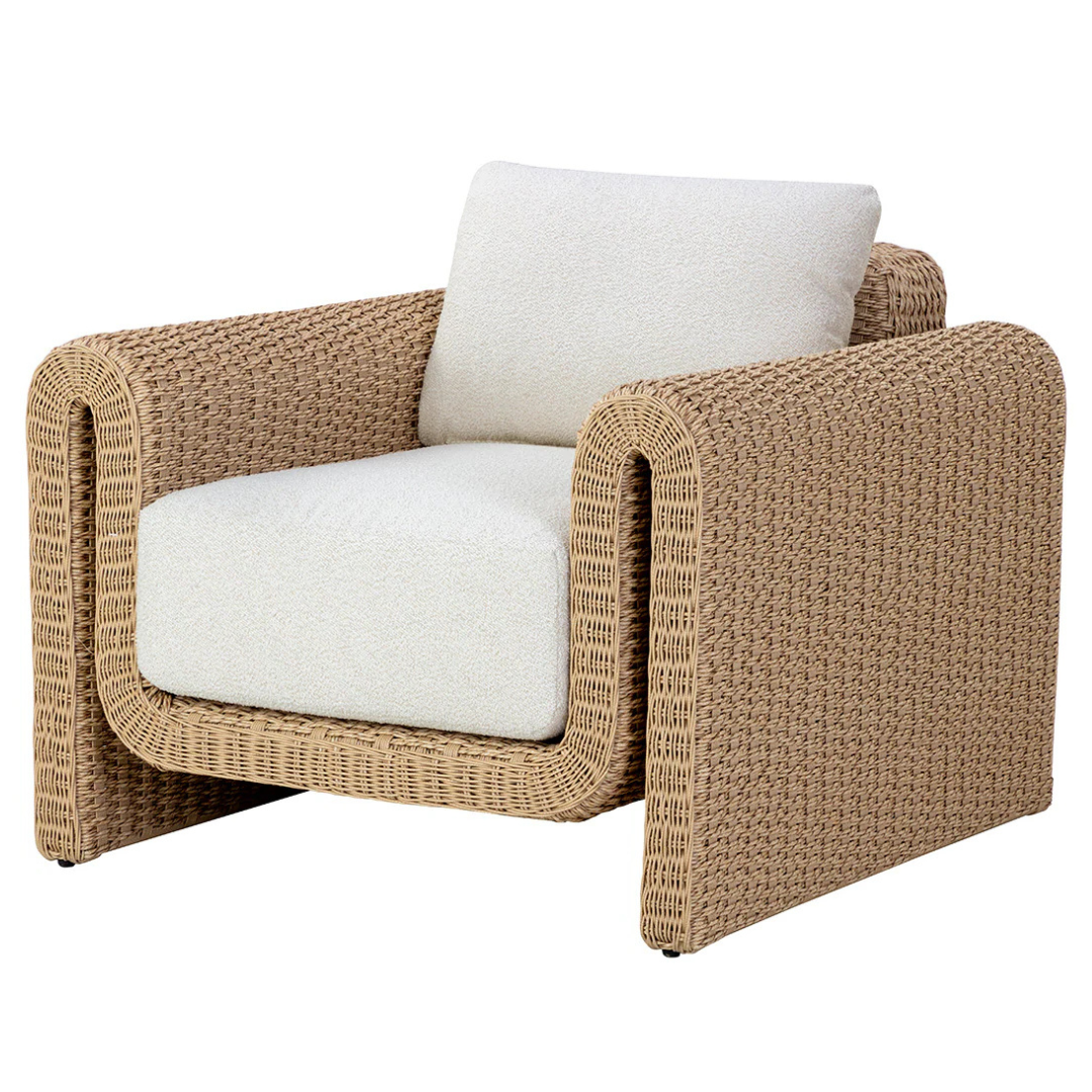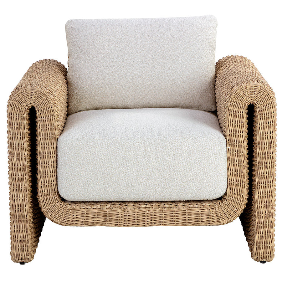 The robust proportions of the Tula Outdoor Lounge Chair enhance the textural beauty of handwoven twisted wicker. The rolled arms join seamlessly to nestle the comfortable cushioning upholstered in our louis cream outdoor boucle performance fabric.
