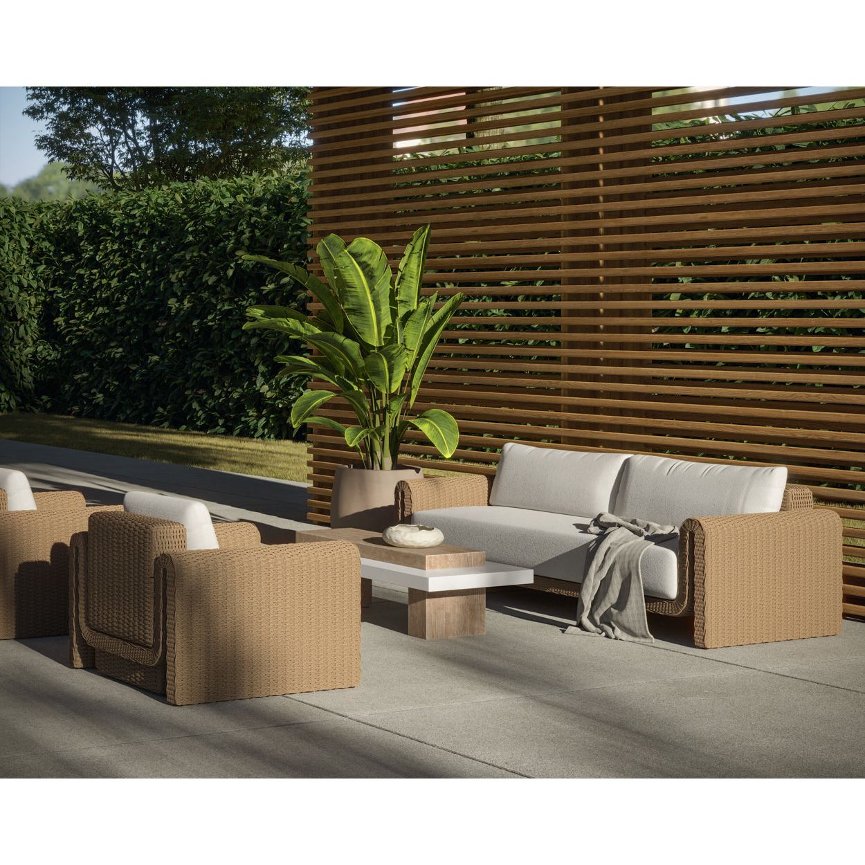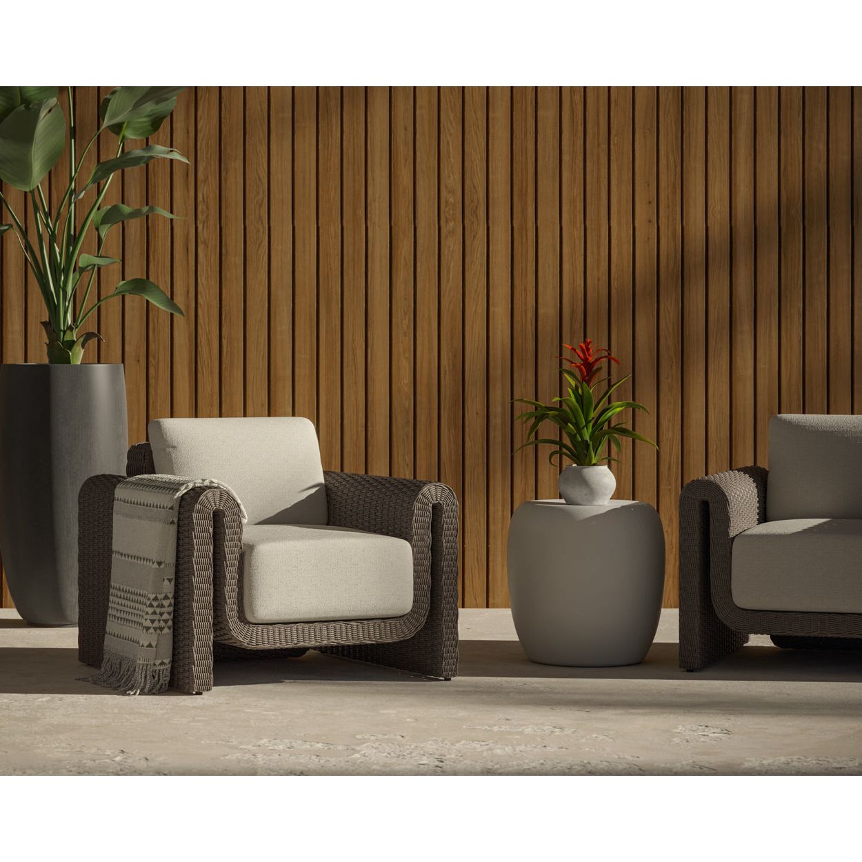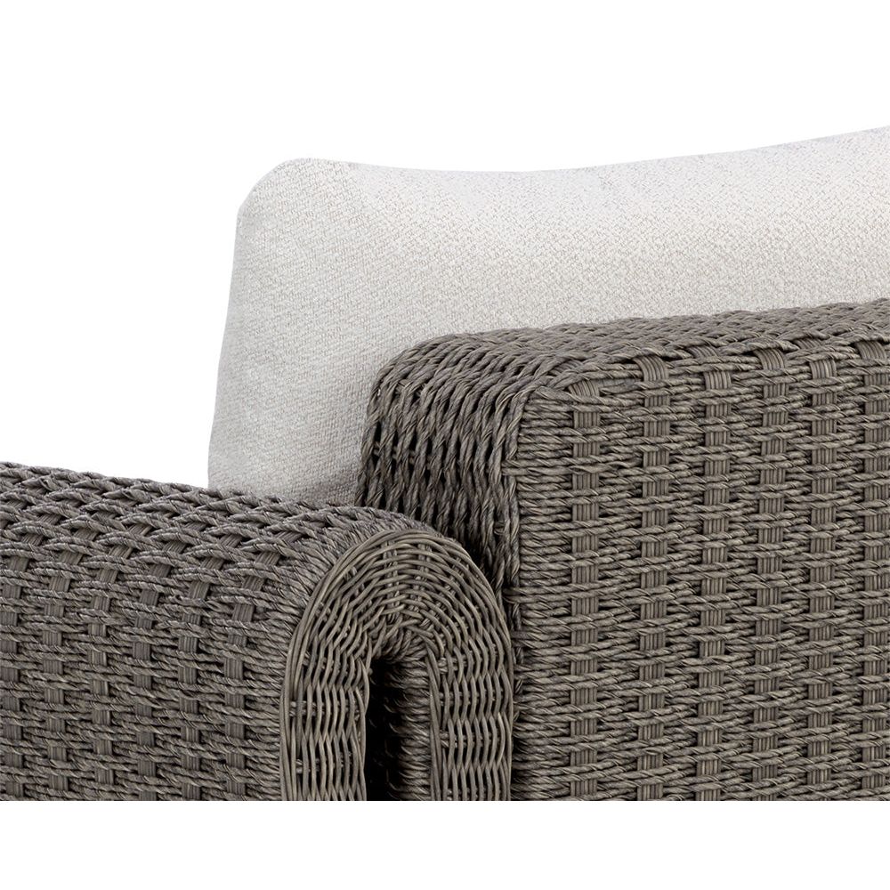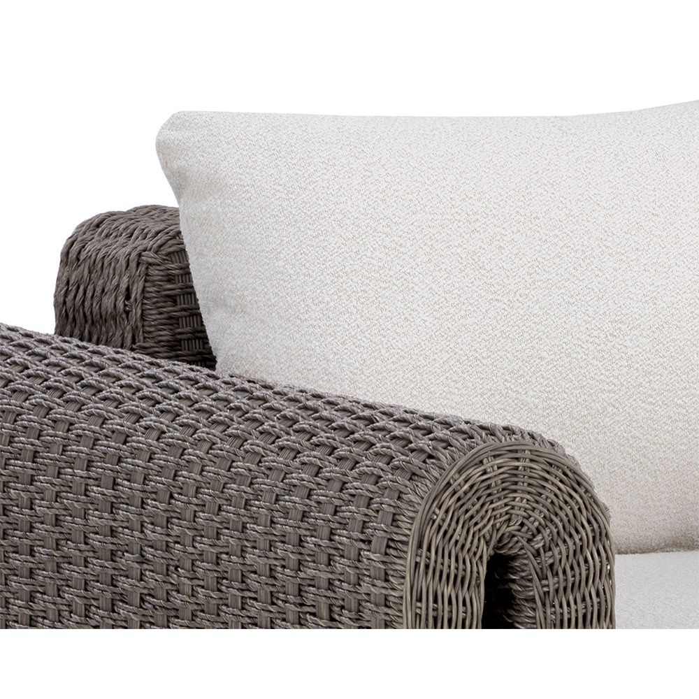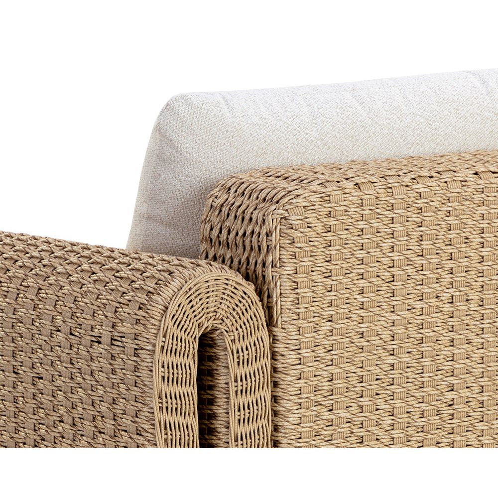 The robust proportions of the Tula Outdoor Lounge Chair enhance the textural beauty of handwoven twisted wicker. The rolled arms join seamlessly to nestle the comfortable cushioning upholstered in our louis cream outdoor boucle performance fabric.