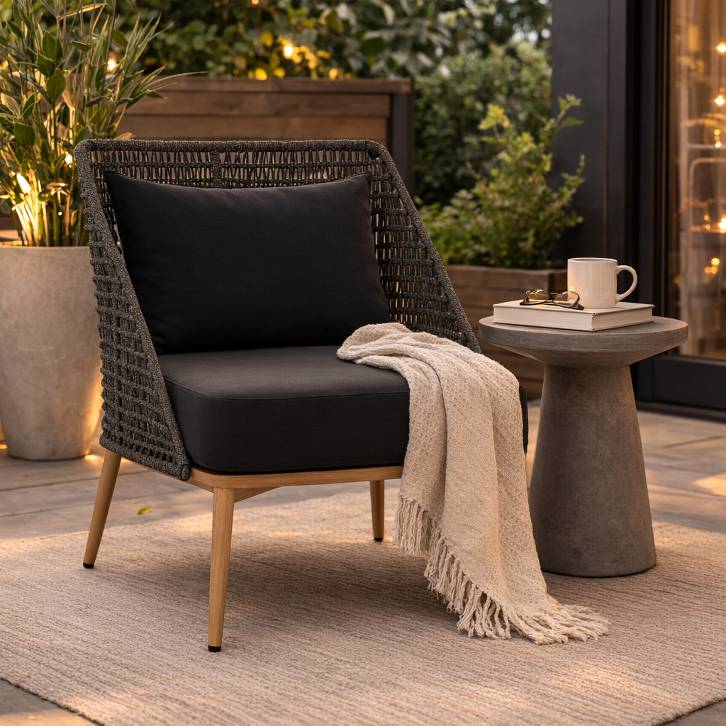 • Solid Teak Wood / Powder Coated Aluminum / Dark Greymix Weave on Dark Grey Aluminum Frame