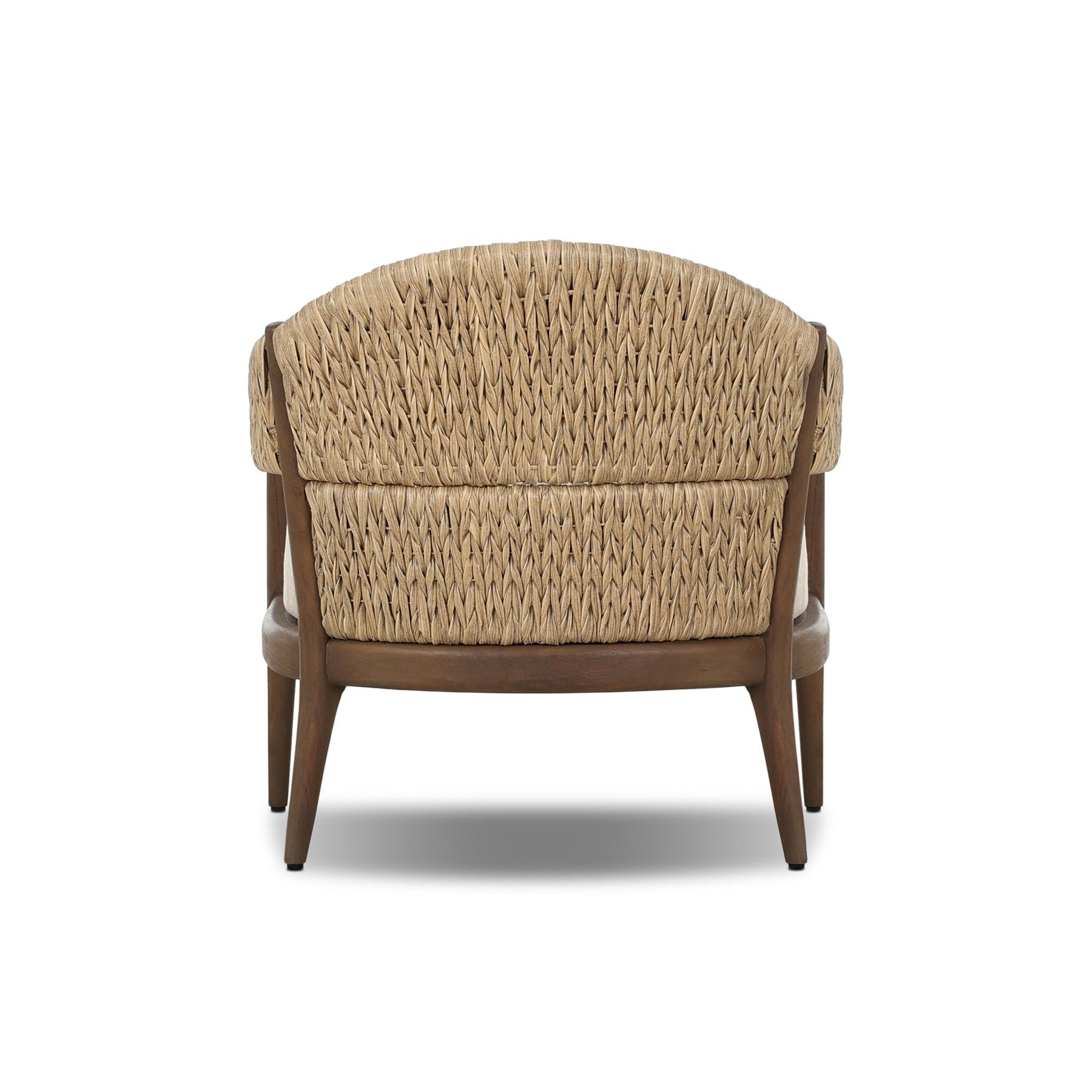 A fresh take on the traditional woven style, this outdoor chair features a faux banana leaf material wrapped in a bold, chunky texture around FSC®-certified teak framing. Cover or store indoors during inclement weather and when not in use.