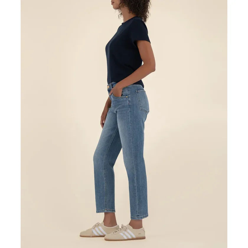 The Kit high rise features a baggy straight leg with an ankle length. A classic medium wash and stretchy material offers a relaxed fit with serious comfort.