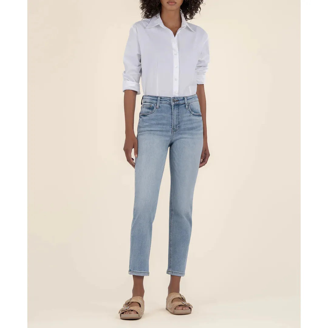 These high-rise Fab Ab mom jeans offer a flattering fit with a light wash for a relaxed, effortless look. A perfect go-to for casual, everyday wear.
