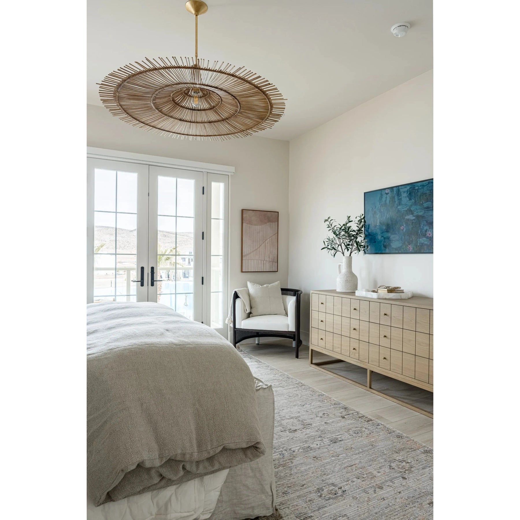 This sprawling rattan shade feels natural but makes a big statement. The irregular edging of the rattan enhances the rustic feel and the Vintage Gold Leaf finish adds subtle sophistication and a warm glow. Hang this one-light pendant over a dining table or in a larger living space to add a modern organic vibe.