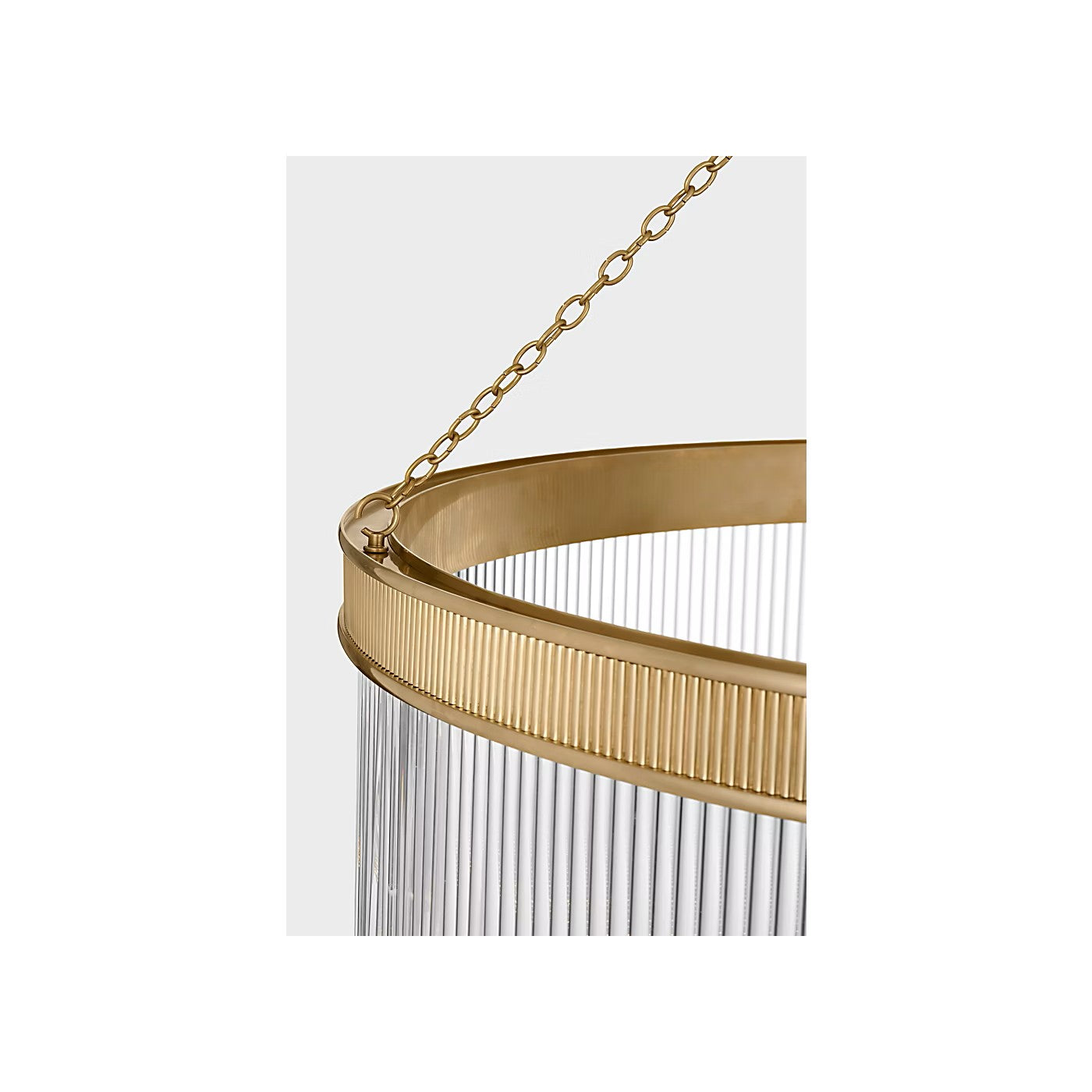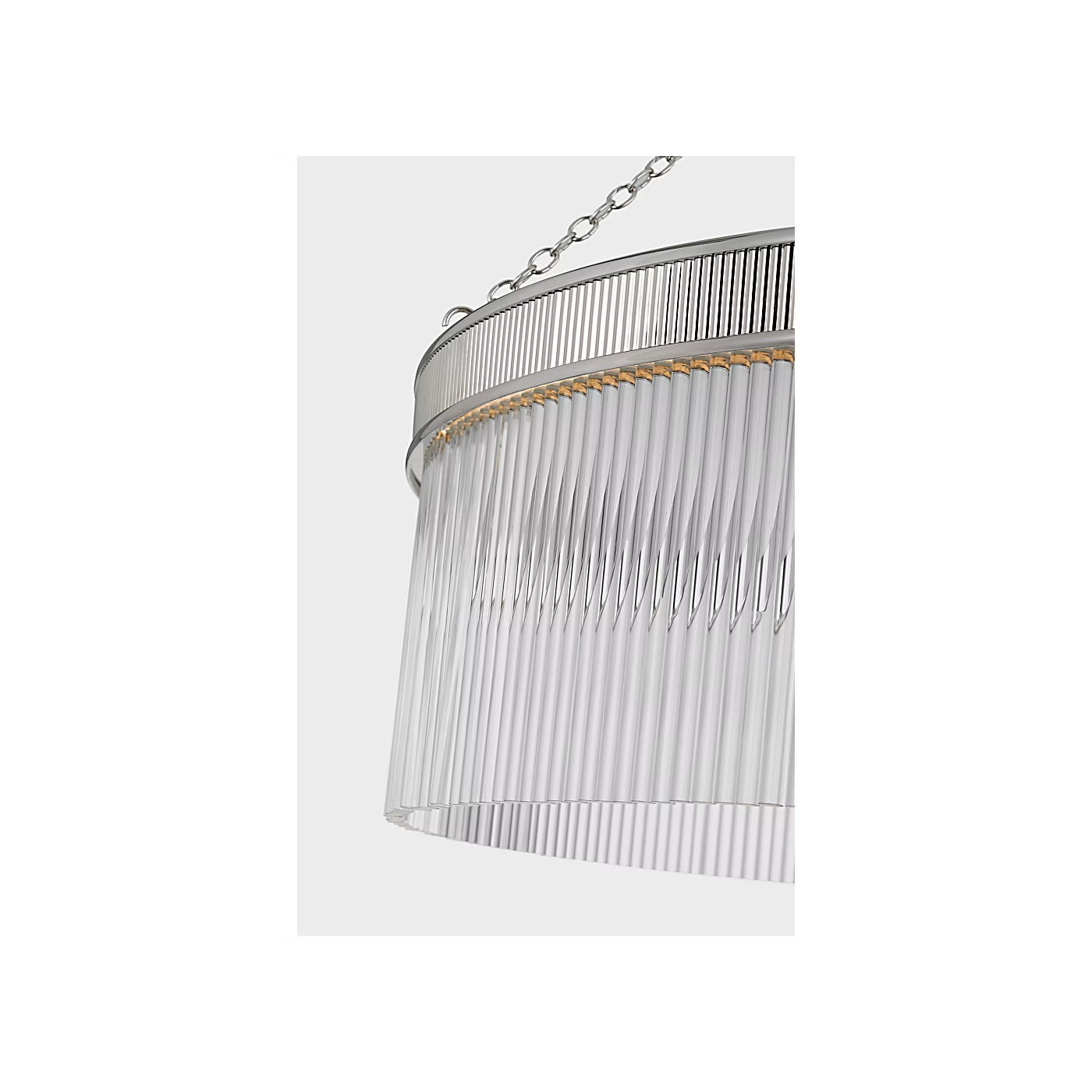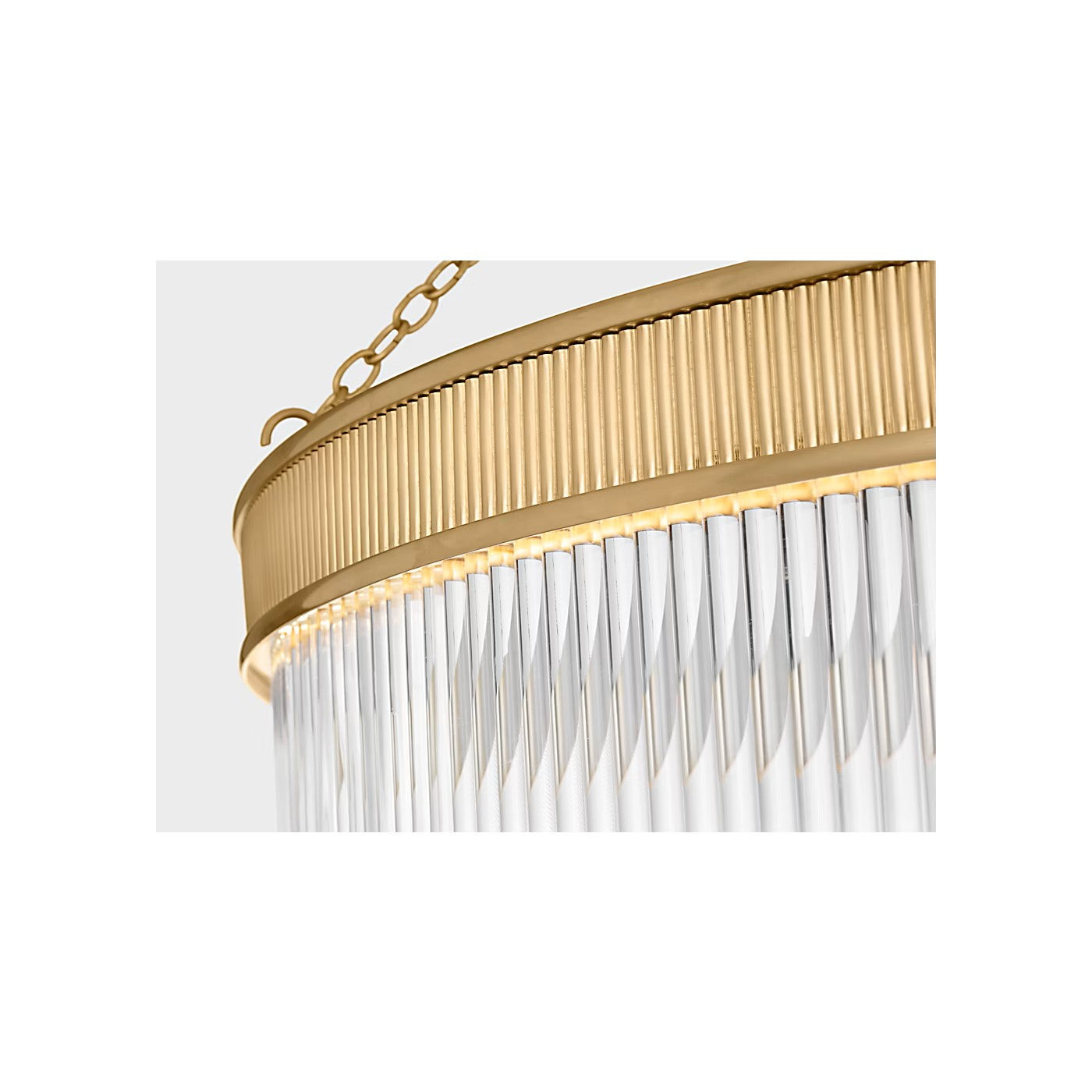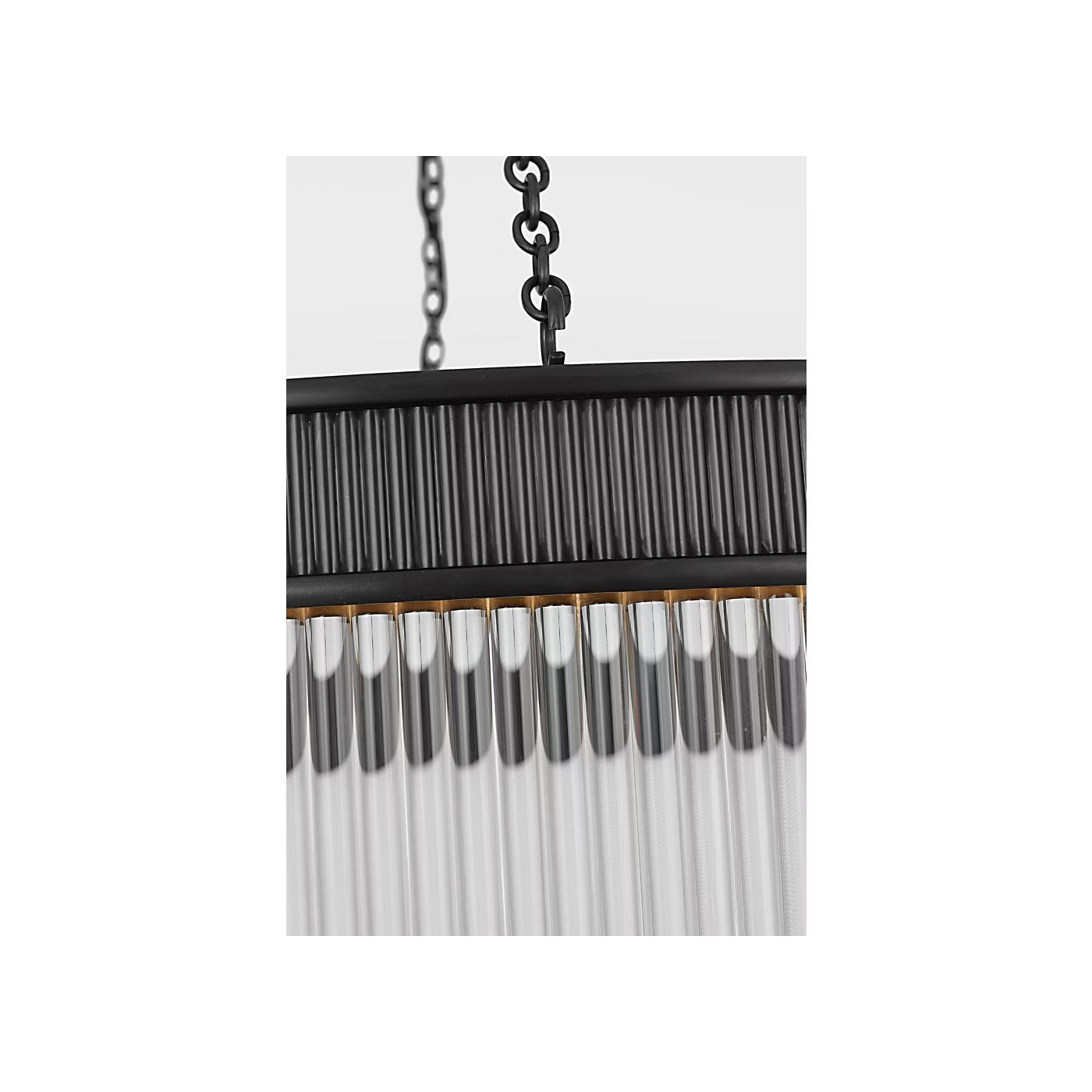The Menil by Marie Flanigan showcases a ring design with glass rods. Two different widths and heights of chandelier are available and feature elegant metalwork in either bronze, brass or polished nickel. Suspended by delicate chain links, the Menil can make a statement alone in a kitchen or foyer or in multiples throughout a hallway.