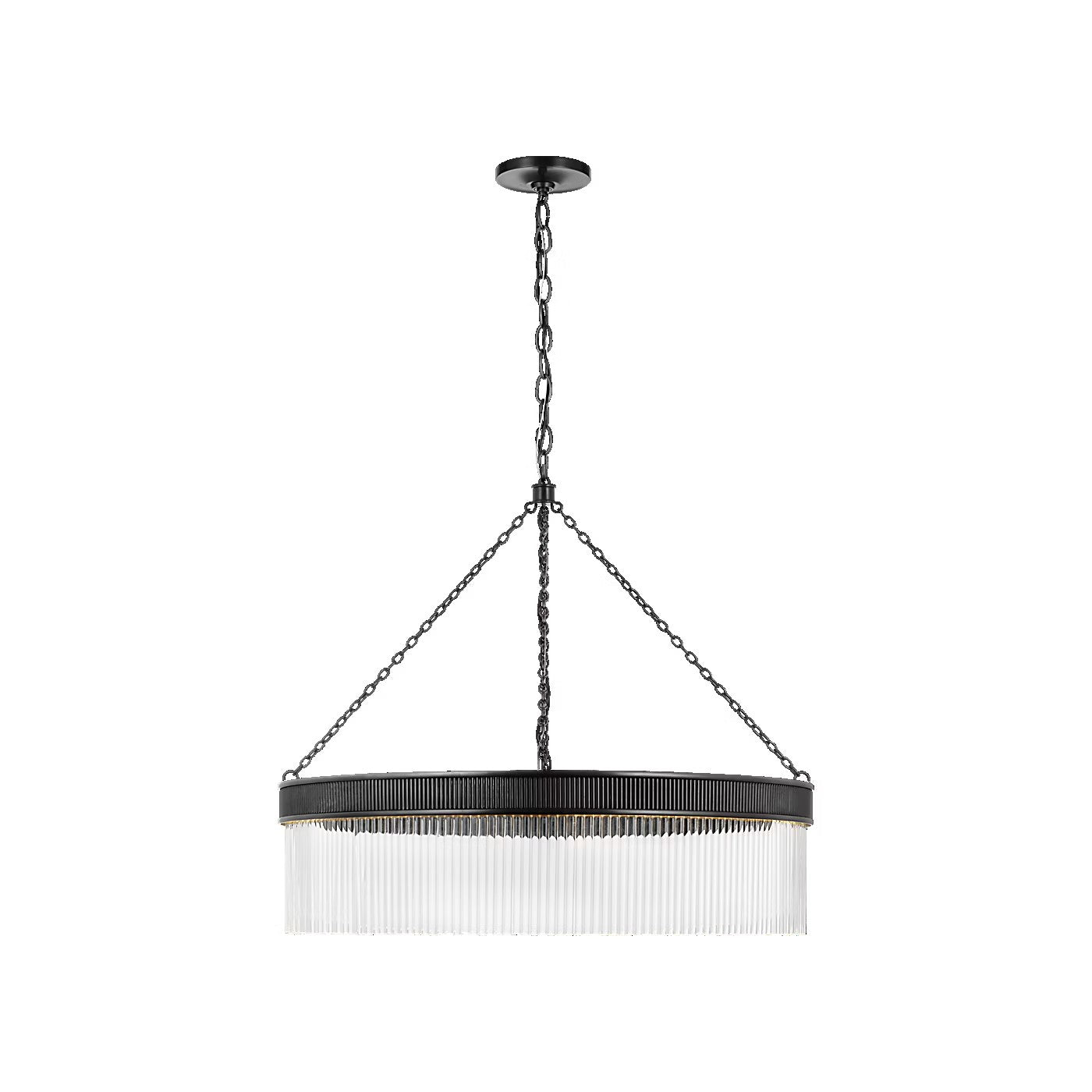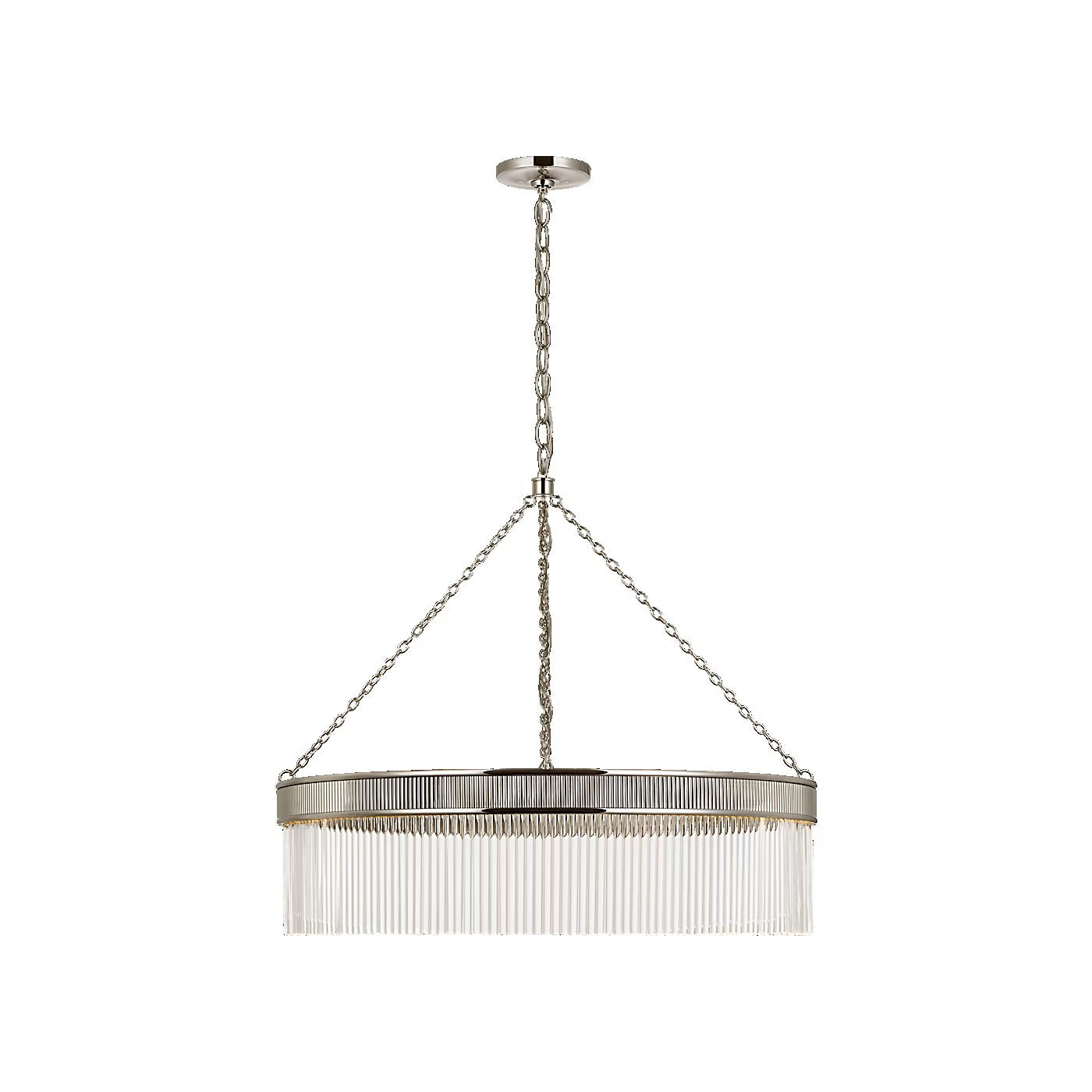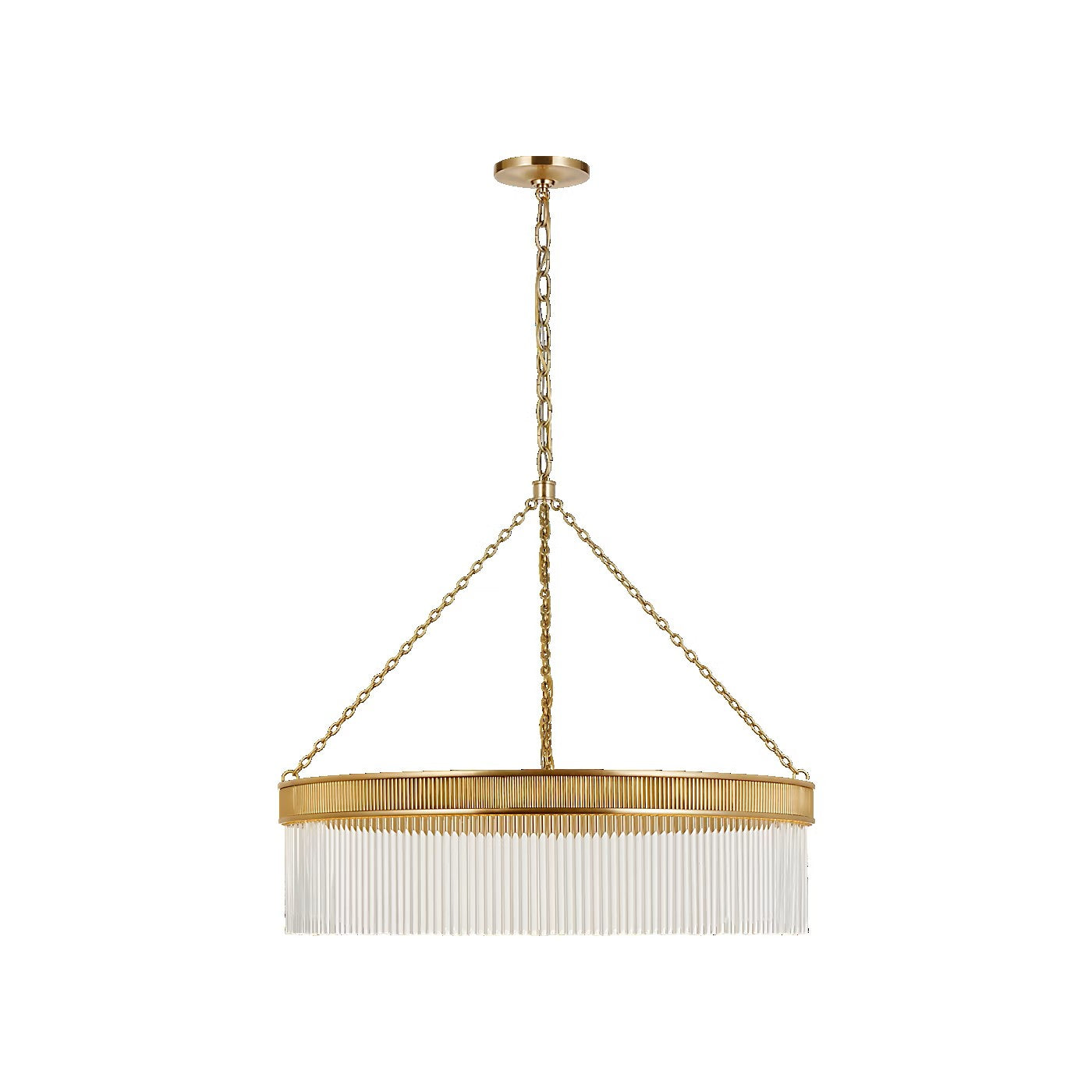 The Menil by Marie Flanigan showcases a ring design with glass rods. Two different widths and heights of chandelier are available and feature elegant metalwork in either bronze, brass or polished nickel. Suspended by delicate chain links, the Menil can make a statement alone in a kitchen or foyer or in multiples throughout a hallway.