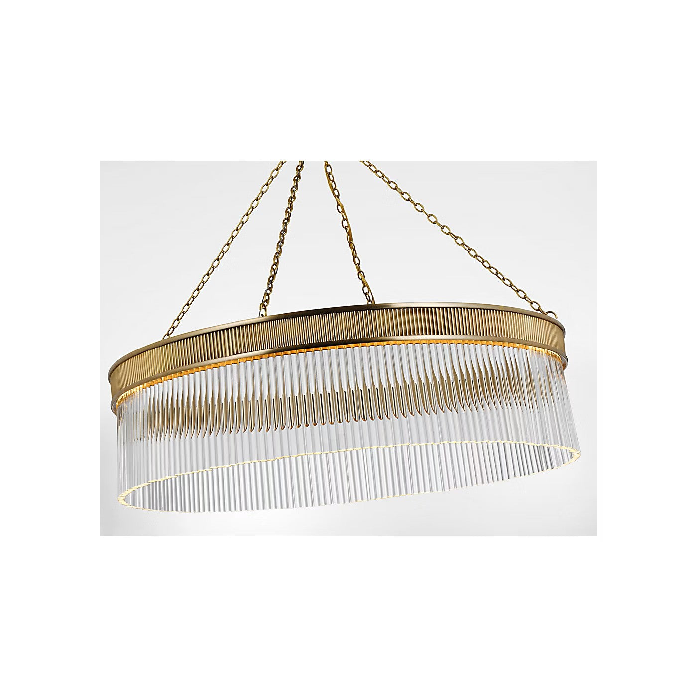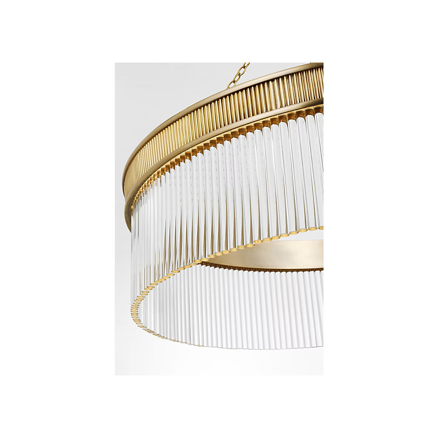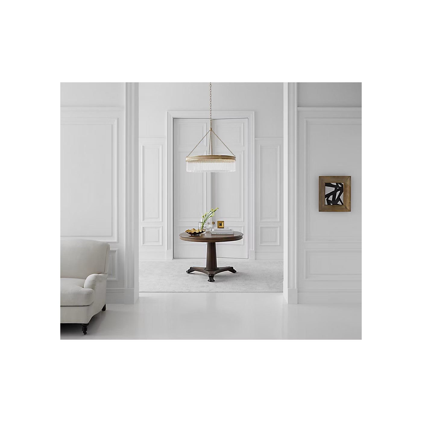The Menil by Marie Flanigan showcases a ring design with glass rods. Two different widths and heights of chandelier are available and feature elegant metalwork in either bronze, brass or polished nickel. Suspended by delicate chain links, the Menil can make a statement alone in a kitchen or foyer or in multiples throughout a hallway.