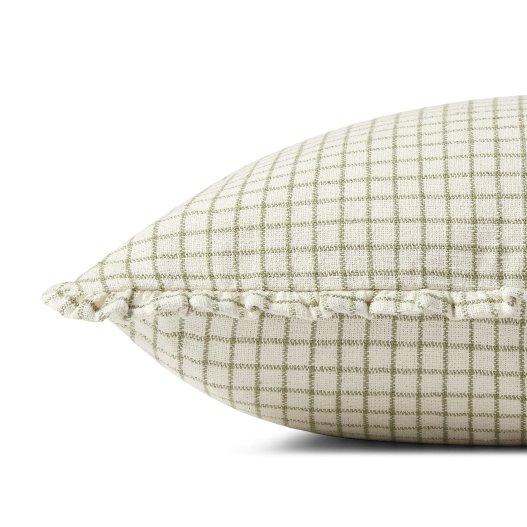 The Dinah throw pillow from Chris Loves Julia x Loloi features a subtle gridded pattern framed with short ruffles for a sophisticated playfulness. The ivory-toned pillow is made of cotton, polyester, and rayon and measures 16” x 26”, an elongated size to style in living rooms and bedrooms.