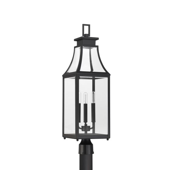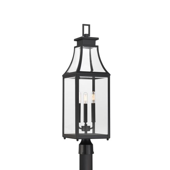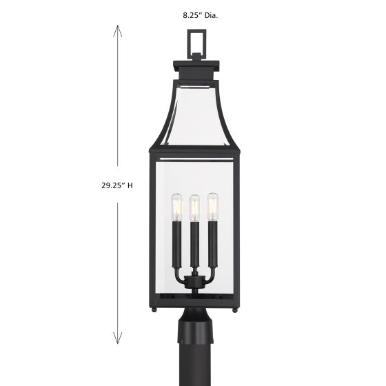 The Savoy House Emery 3-light outdoor post lantern features a timeless style inspired by charming English cottage homes. Its curving hood and panels are all fitted with clear glass panes that give off a bright glow to light the way. The Matte Black finish is endlessly versatile. Emery is 29.25" in height and 8.25" in width. Uses three candelabra size bulbs of up to 60 watts per bulb. Bulbs not included. Emery is wet area rated for use in covered or uncovered outdoor areas.